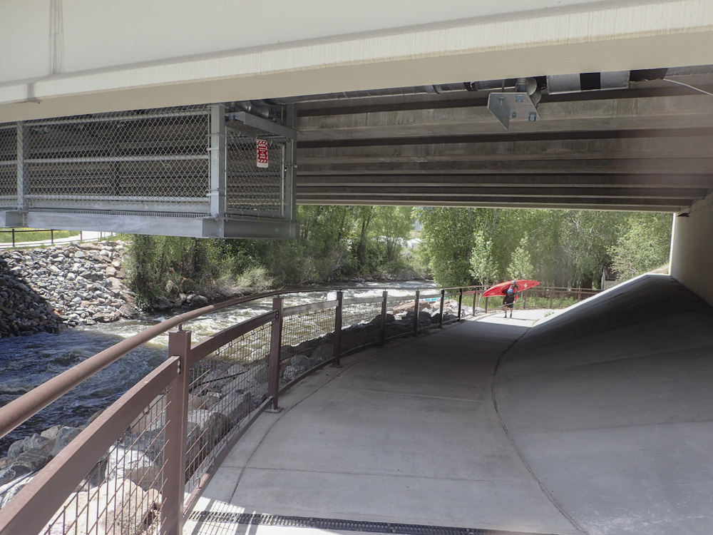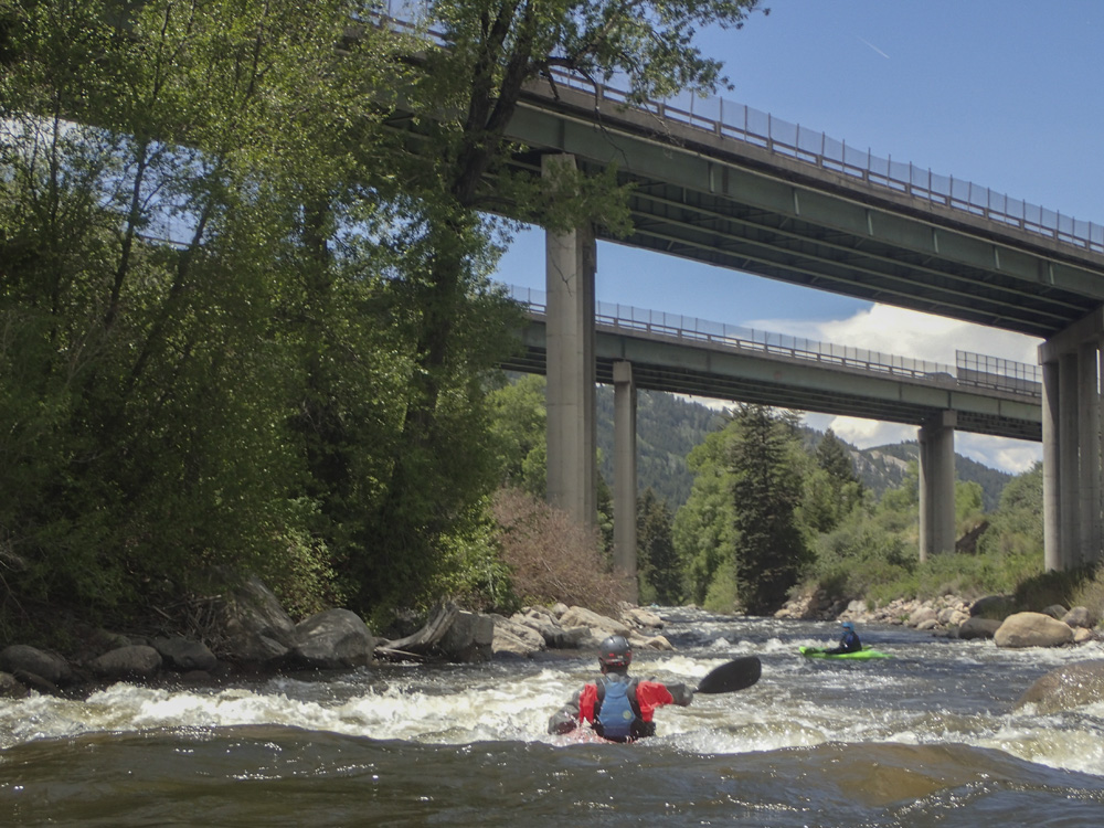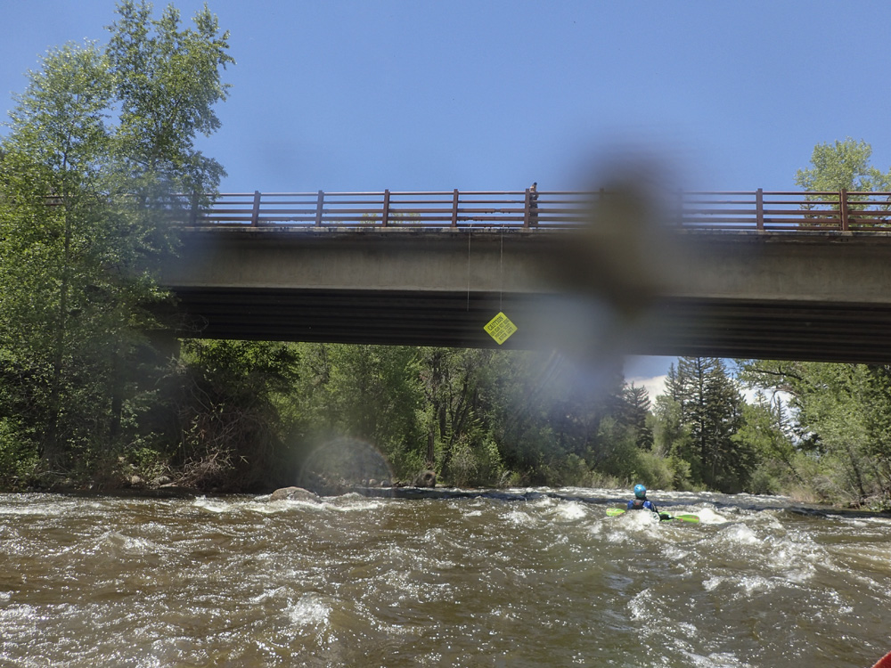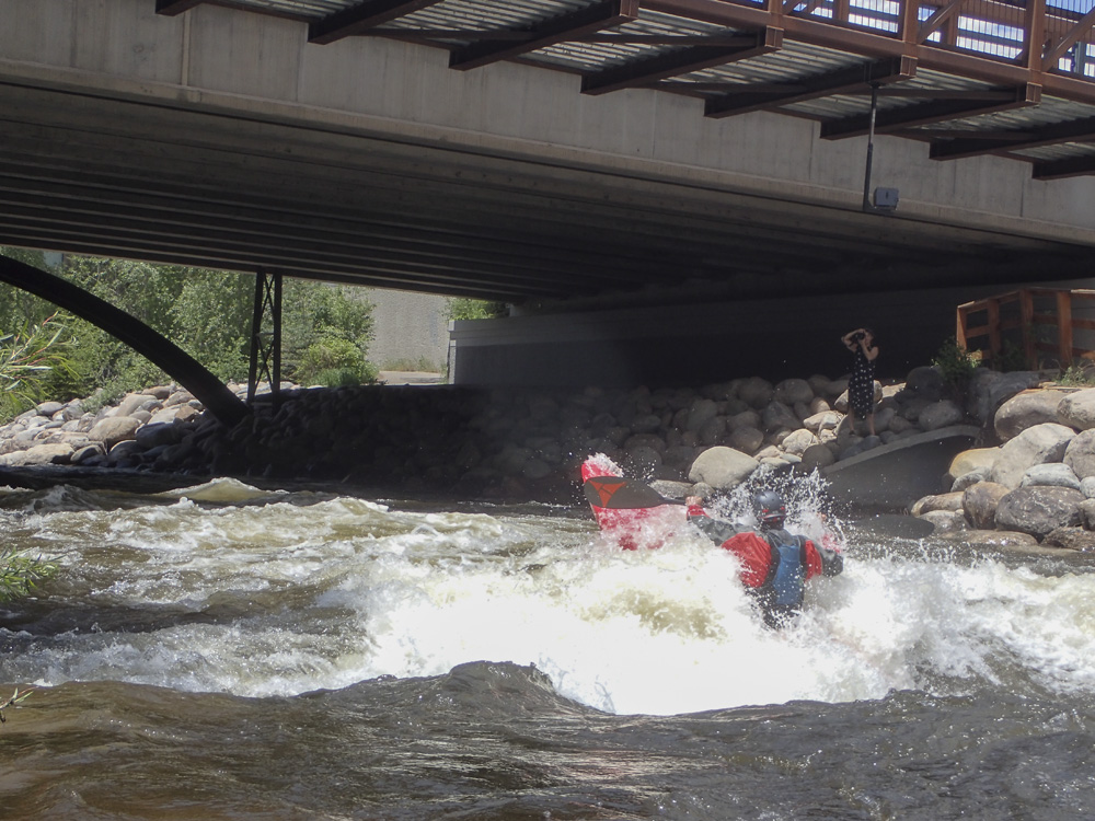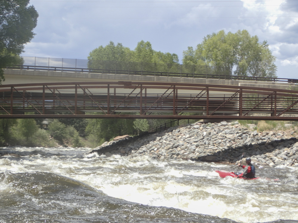 - River Wide (III). We caught some rafters as we passed under a bridge, and then were all jangled together in a bunch when we went through this rapid. It started as boogie and then led to a river-wide hole (2nd pic) that we ran on the left. The hole wasn't bad, perhaps at higher flow it gets worse and you would want to head to the edges to sneak around it. Downstream you begin to see signs warning about the upcoming whitewater park.
