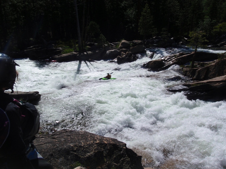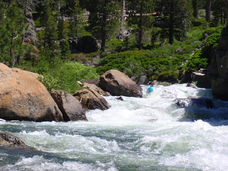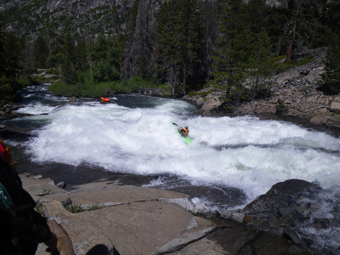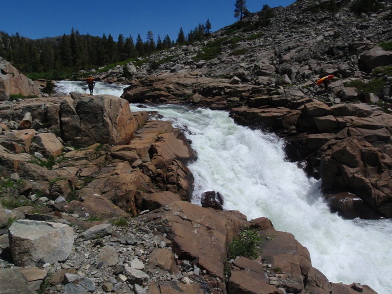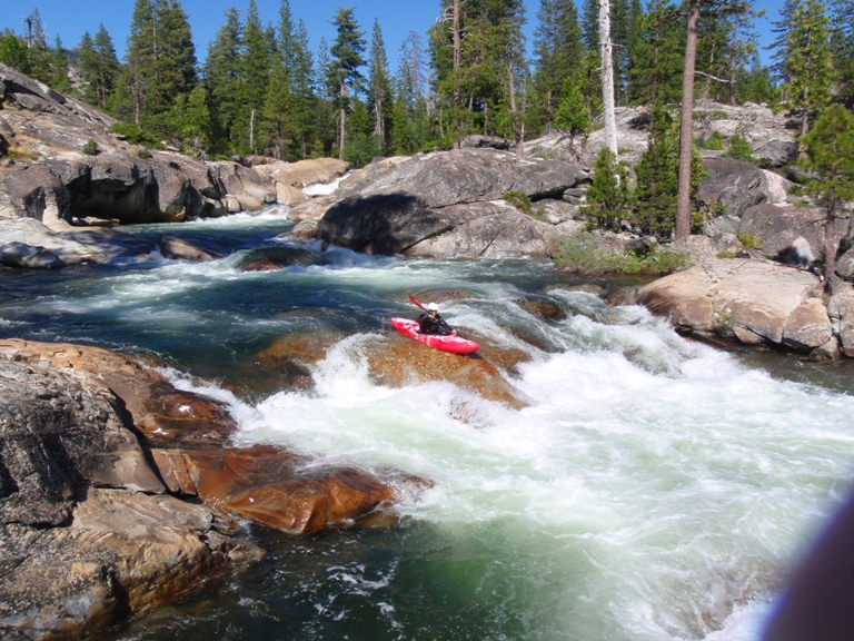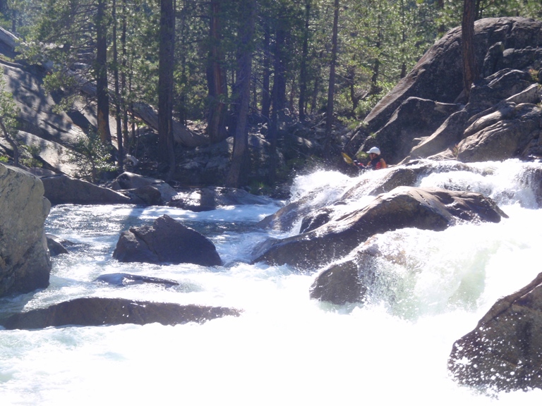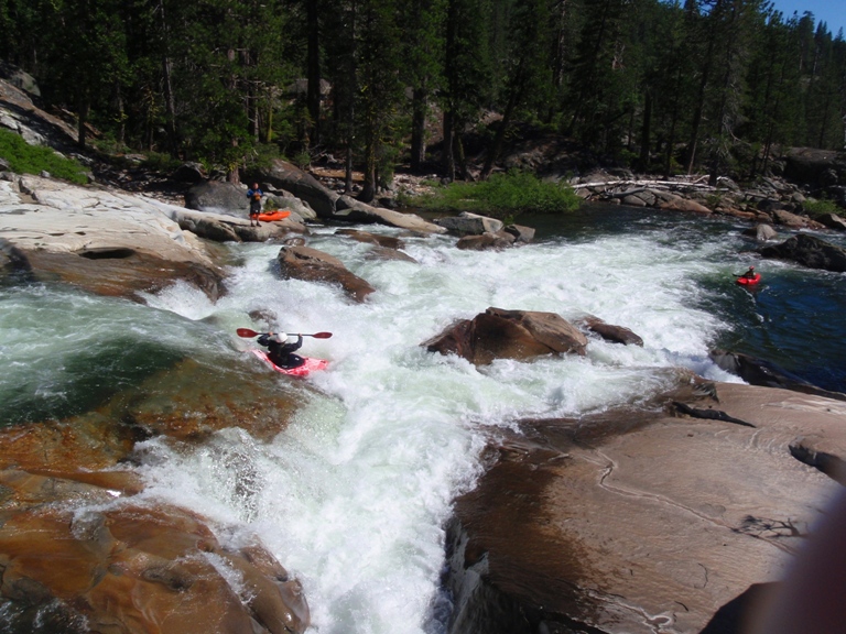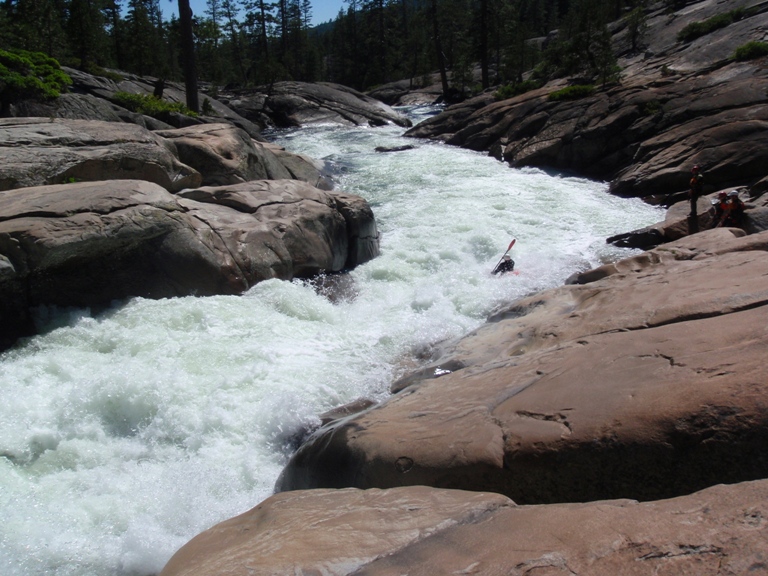 The river has some of the most spectacular scenery you can get for a class IV-V river. Normally to get granite scenery like this you would have to be a class V-V+ boater. However with Fordyce, a class IV+ boater can enjoy the feeling of being in the middle of nowhere, buried deep in the sierras. The river for the most part is class IV-IV+ with several long sections of class II that are occasionally interrupted by a quick III-IV. The exceptions are the start and the end which are action packed and are where the bulk of the time spent on the run will occur. The rapids in these sections are mostly class IV+ with a few V and a few V+ that many/most folks portage. All the hard drops on this run are portagable, and I believe all would be pretty simple to portage. If you don't know the lines, expect to take a full day to do this run. We had Hunkapillar, Bruckner and Tulley with us who had done the run before but with a large group and several of us documenting the river (pictures and video) in addition to a 45 minute lunch, took nearly 6 hours to complete the run including the lake paddle. With a smaller group and less picture taking you could finish in 3-4 hours your first time down I think. But then again, why hurry through such a pretty place?