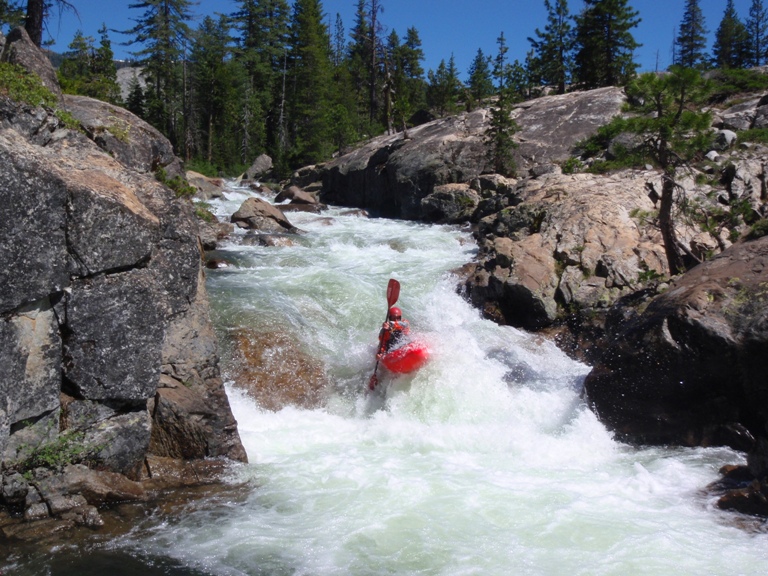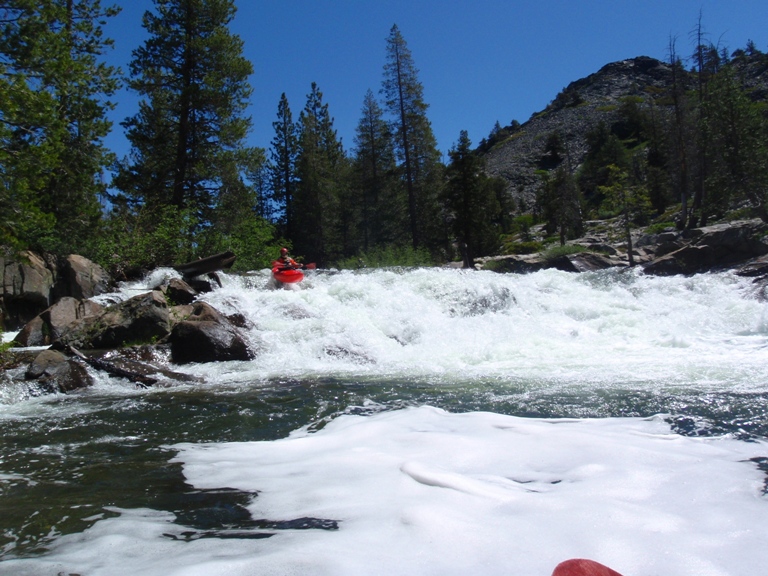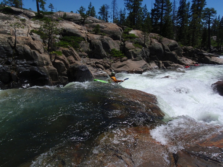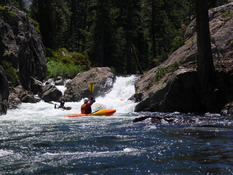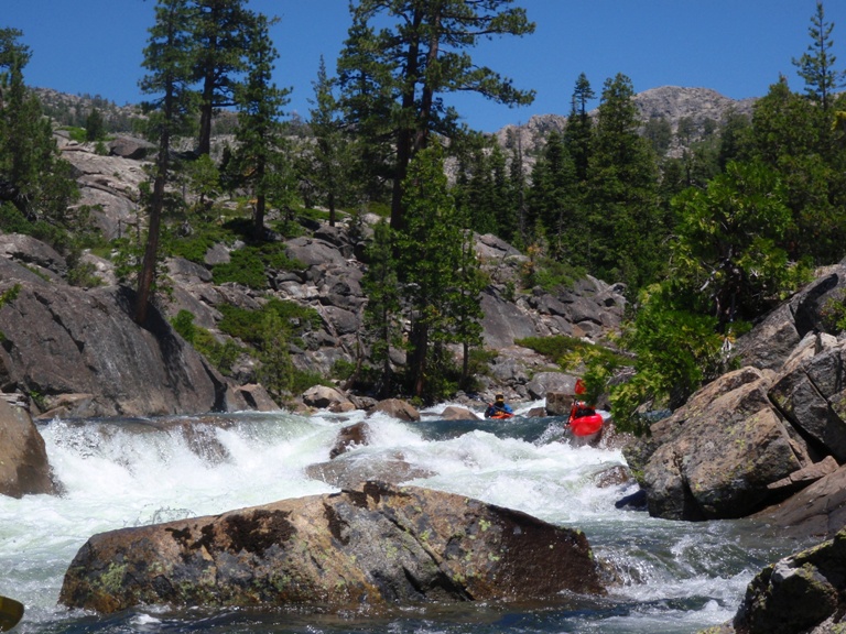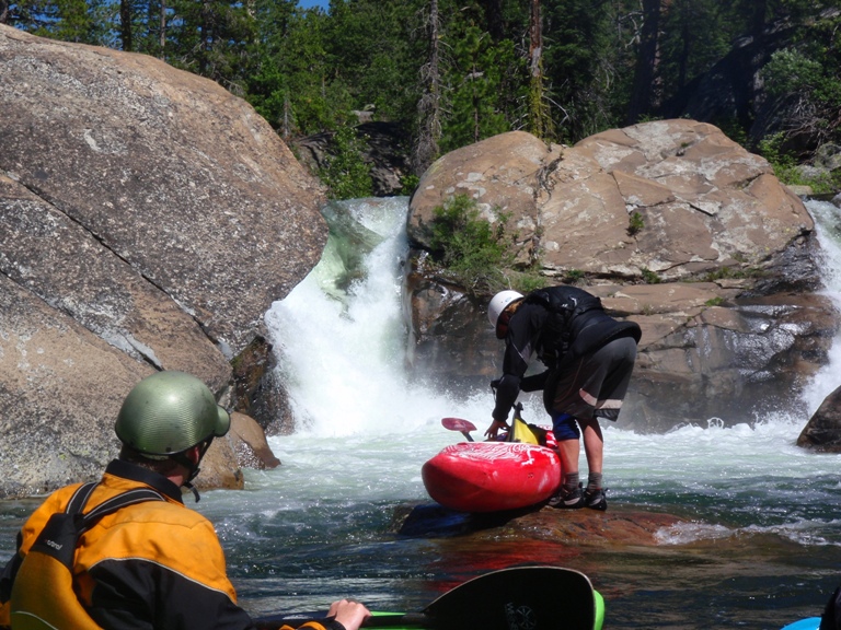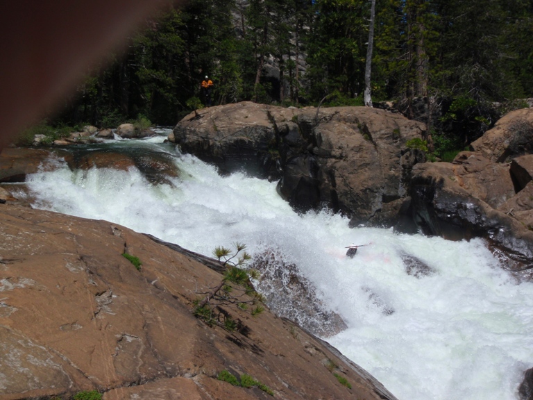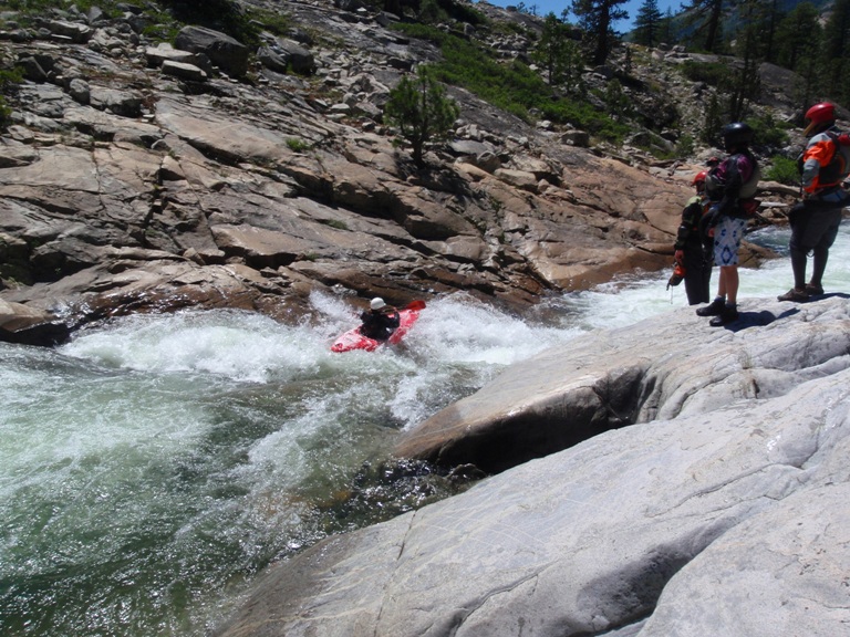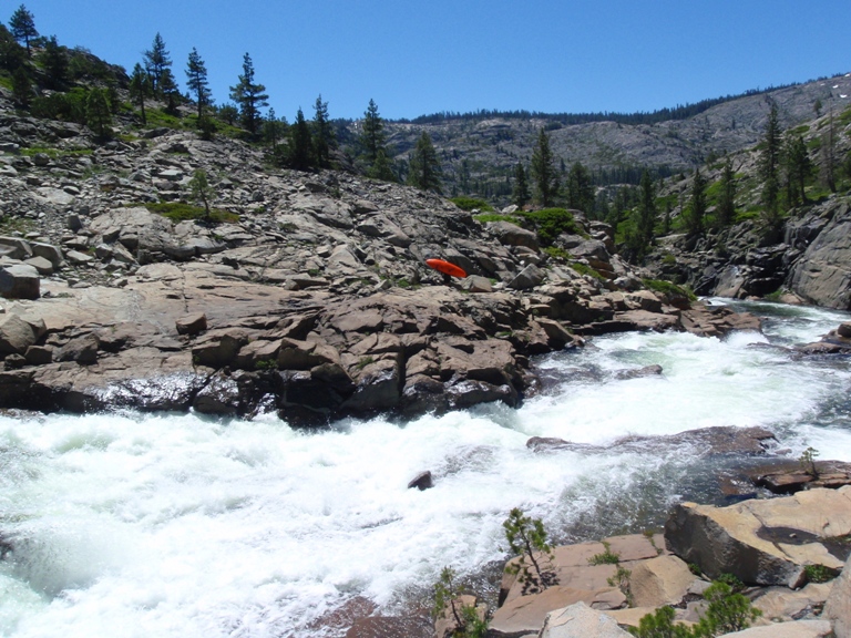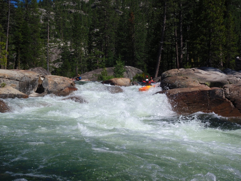 The river has some of the most spectacular scenery you can get for a class IV-V river. Normally to get granite scenery like this you would have to be a class V-V+ boater. However with Fordyce, a class IV+ boater can enjoy the feeling of being in the middle of nowhere, buried deep in the sierras. The river for the most part is class IV-IV+ with several long sections of class II that are occasionally interrupted by a quick III-IV. The exceptions are the start and the end which are action packed and are where the bulk of the time spent on the run will occur. The rapids in these sections are mostly class IV+ with a few V and a few V+ that many/most folks portage. All the hard drops on this run are portagable, and I believe all would be pretty simple to portage. If you don't know the lines, expect to take a full day to do this run. We had Hunkapillar, Bruckner and Tulley with us who had done the run before but with a large group and several of us documenting the river (pictures and video) in addition to a 45 minute lunch, took nearly 6 hours to complete the run including the lake paddle. With a smaller group and less picture taking you could finish in 3-4 hours your first time down I think. But then again, why hurry through such a pretty place?