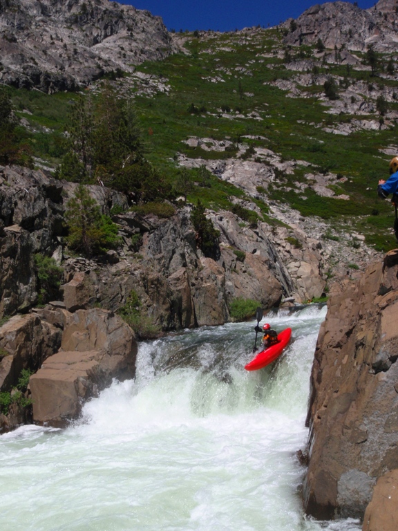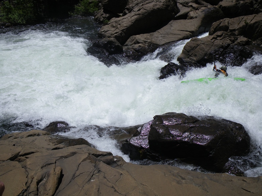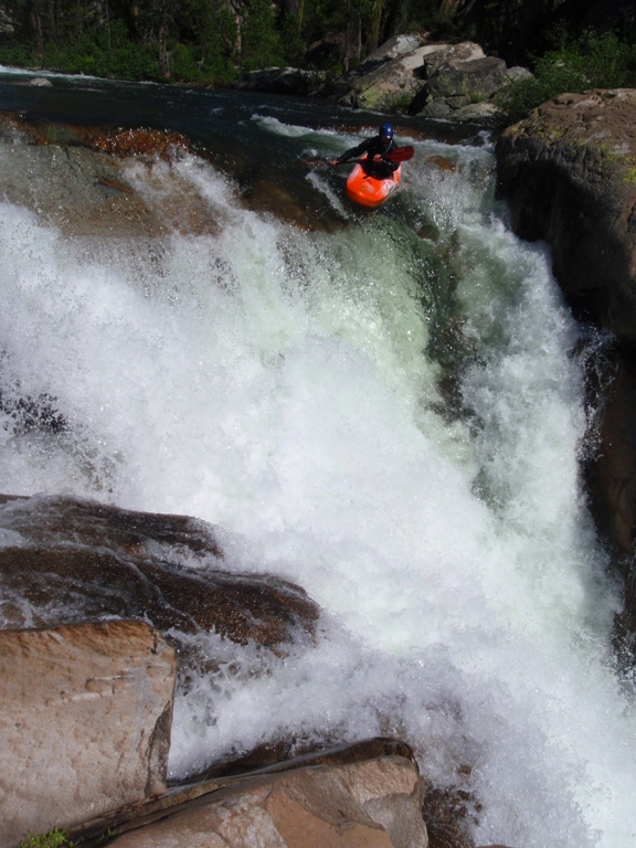 Insanity Falls Gorge (IV+). Putting in below the falls still allows for a fun drop to exit the gorge. The drop consists of a 3-4 foot boof followed by a 6-7 foot drop just below. The second drop needs to be run center or left, just not right. The right side tractor beams people into a crack and massive piton and has caused a fair share of ankle injuries. If desired, safety is easily set from above (the portage) or below after someone runs the drop.
