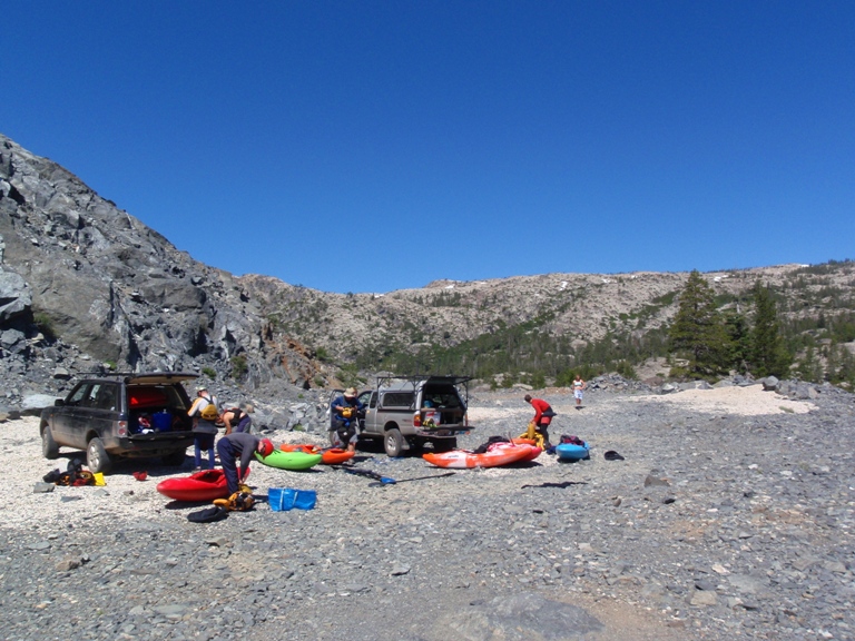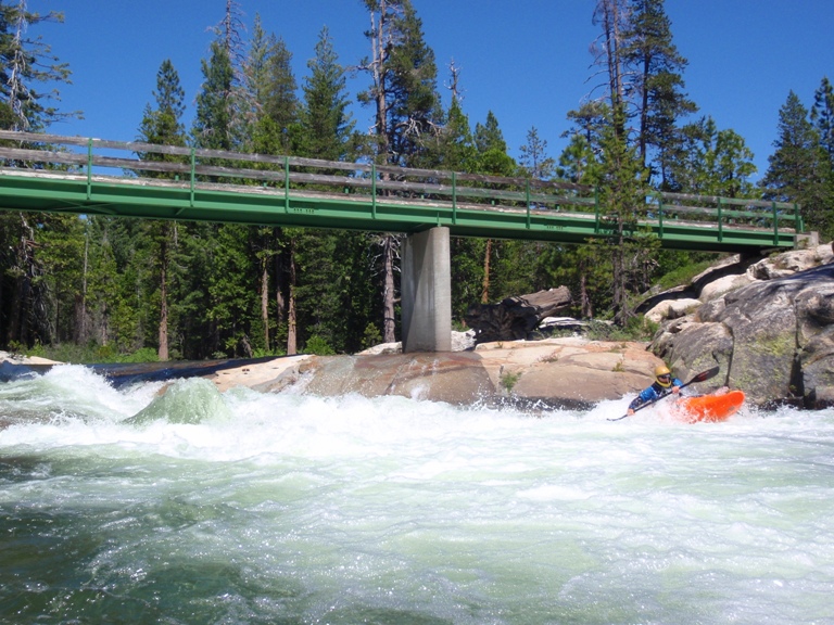 Put-in: Get back on Highway 80 and the Cisco Grove Exit. Cross the freeway (and South Yuba) to the North side and turn left. Take the first right after a few hundred feet. Quickly, s you pass some houses, stay right on Fordyce Lake Road (Road 85). This part of the road is dirt and is possible with a civic or minivan though I would certainly prefer more clearance. After you follow a cool creek a short ways you will climb up and over a ridge. Soon after the road forks, stay left. From this point, stay on the main road which involves staying left at a small fork or two which I believe are just campsites though I may be mistaken. As you climb one last time the road again gets bad. As you crest the ridge and start to drop down the rockiness continued. We passed a minivan with some kayakers beginning to hike from this point. What once was the worst part of the road was up next though now it is regarded and totally mellow. Drop down to the lake and continue at lake level until you reach the dam. Park at the end of the gravel lot. A trail starts on the far side of the trees at the end. Follow the arrows down the granite to the cable crossing. Put-in there. The drive is about 6.6 miles from the Highway to the lake and another 1.6 miles around the lake to the dam from there. Although the road has been improved, I would still shy away from taking my Highlander in as I still baby it a little. Any pickup truck or Range Rover would be fine. An Outback could also make it depending on the how much the owner babies it.