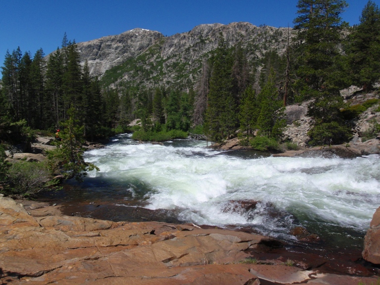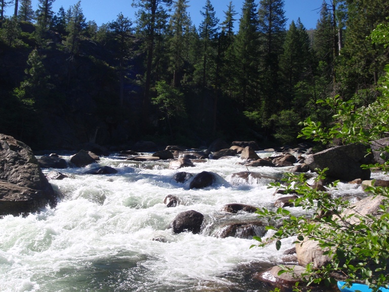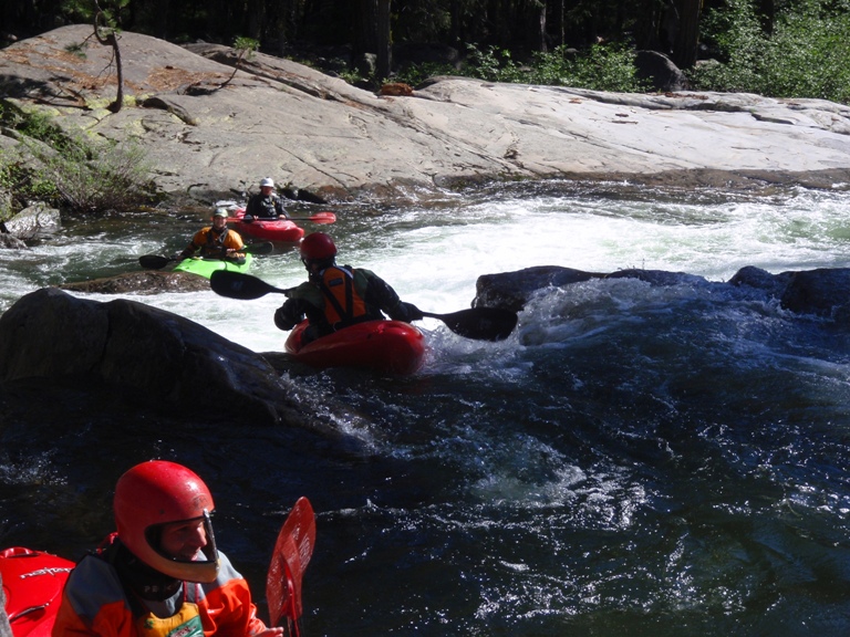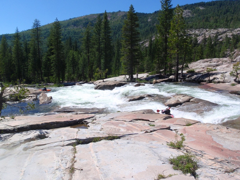 - Old Man (IV- to IV+). Several lines were available to challenge yourself. We ran down the right and moved center at the bottom. That was by far the easiest line but may not be open at low flows. There was also a start left and move right as well as a down the right that looked a lot harder. Just downstream of Old Man the river enters a wonderful pool with an amazing view a Manzanita covered granite slope. This is also an indication to get out on the right or left to portage.