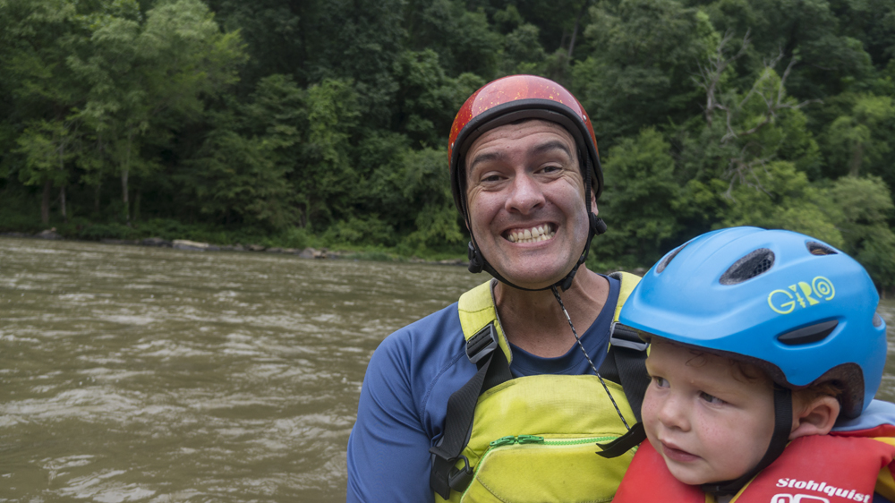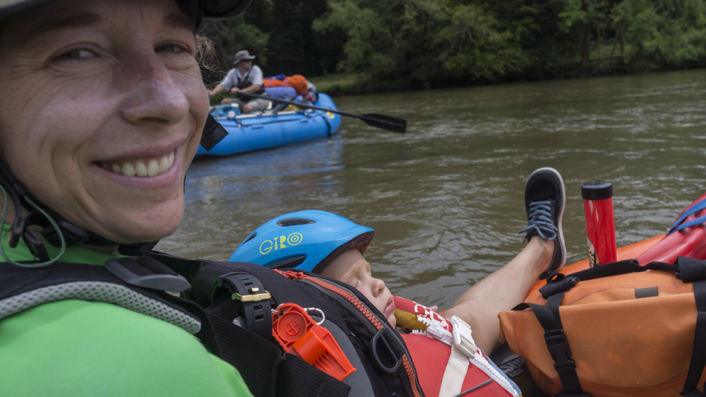 After borrowing an AIRE Super Lynx two person IK earlier this year on the Hiwassee, we decided that was the boat for us for our Aster boating days. The low profile tubes allowed for Aster to play with the water without risking falling out like in the canoe we also tried this year, plus it was easy to control in whitewater with just me paddling in the read, while Diane held on to Aster. So, we placed out order... but due to Covid everything is backordered so it took about 2 months to get here... which means Fall has set in. Bummer! Thankfully, this week we had a late October warm spell of 82 degrees so we made the plan to take the boat on its maiden voyage and decided on the French Broad! My parents were in town visiting, so we invited my mom to join us on the water and borrowed another IK for her to round out the day.