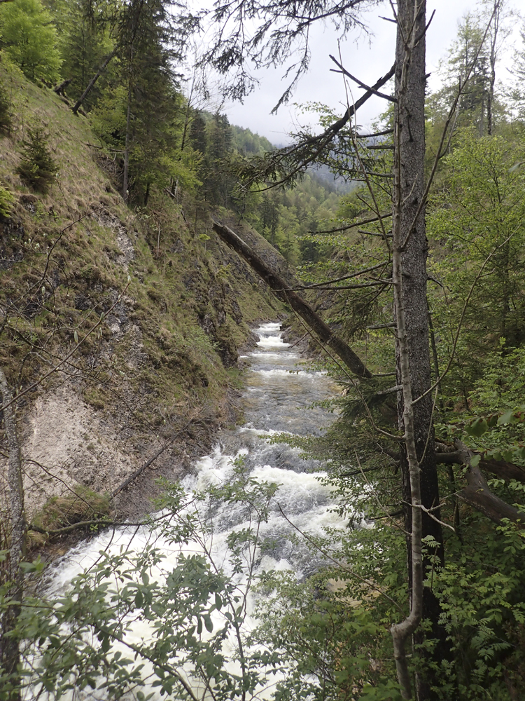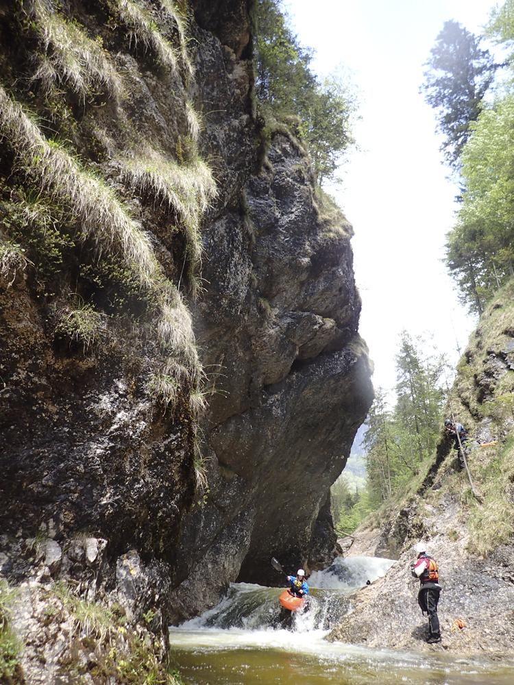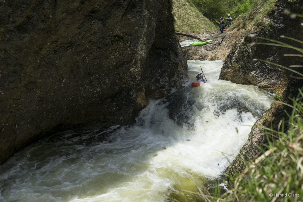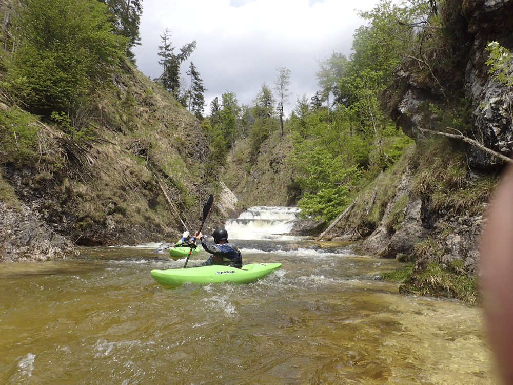 The plan was we would fly to Munich, Reiner would pick us up and we would "try" to get a river that day. As it turns out, we got three rivers that first day and got skunked due to high flow on another steep creek. Good thing I brought some 5-hour Energy with me just for this day! The Gimbach was our first stop and was ~2.5 hours from the airport. The time in the car flew by as we caught up with Reiner. Arriving at the river, we had a few minutes while we waited on Harry, Robert, and Jurgen to show up. Jim and I took the opportunity to hike a little ways up the creek. It surprised me just how small it was. Apparently we had "healthy" water, but that must have only been 150 cfs at the most. I can't believe that people run this a foot lower! I thought the flow we had was idea for forgiveness, though more water would have lubricated some of the drops better. But I could see a few rapids (like the mandatory) being more stout with more water. As it was, I thought it was a great first run for us. It was Jim's first time in a Flying Squirrel, I was sleep deprived etc. I would say it is fair to call it IV+. Maybe at lower flows it is more class IV. I understand it is a lot of peoples first waterfall run, and I imagine that is at lower flows. The only downside to this run I would say, is that you have to schlep your kayak from the bottom to the top. The start of the hike is really steep but then it meets a road and calms down for the rest of the way. There are a few drops that are worth scouting on your way up so keep an eye for those on the hike.