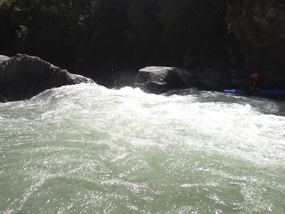 Slot #1 (III+ to IV). The first blind rapid is just before the left bend in the river at the end of one of the two or three long rapid mentioned above. There is a slot down the center/right that you want to run down the center. Eddy out right below as the most consequential drop of the run is below.