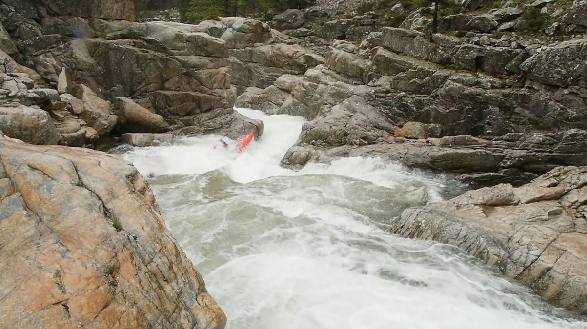 Right Wall (IV). Just downstream scout left. The easier line is down the right, boofing the right wall. There is a challenge line in the left slot, but it is less pretty. Exit anywhere at the bottom ledge.