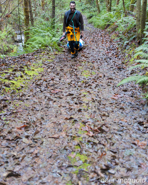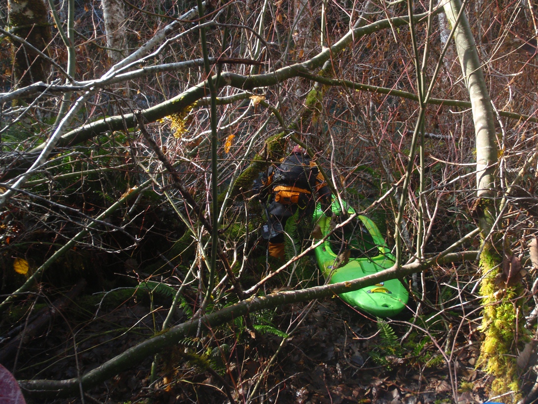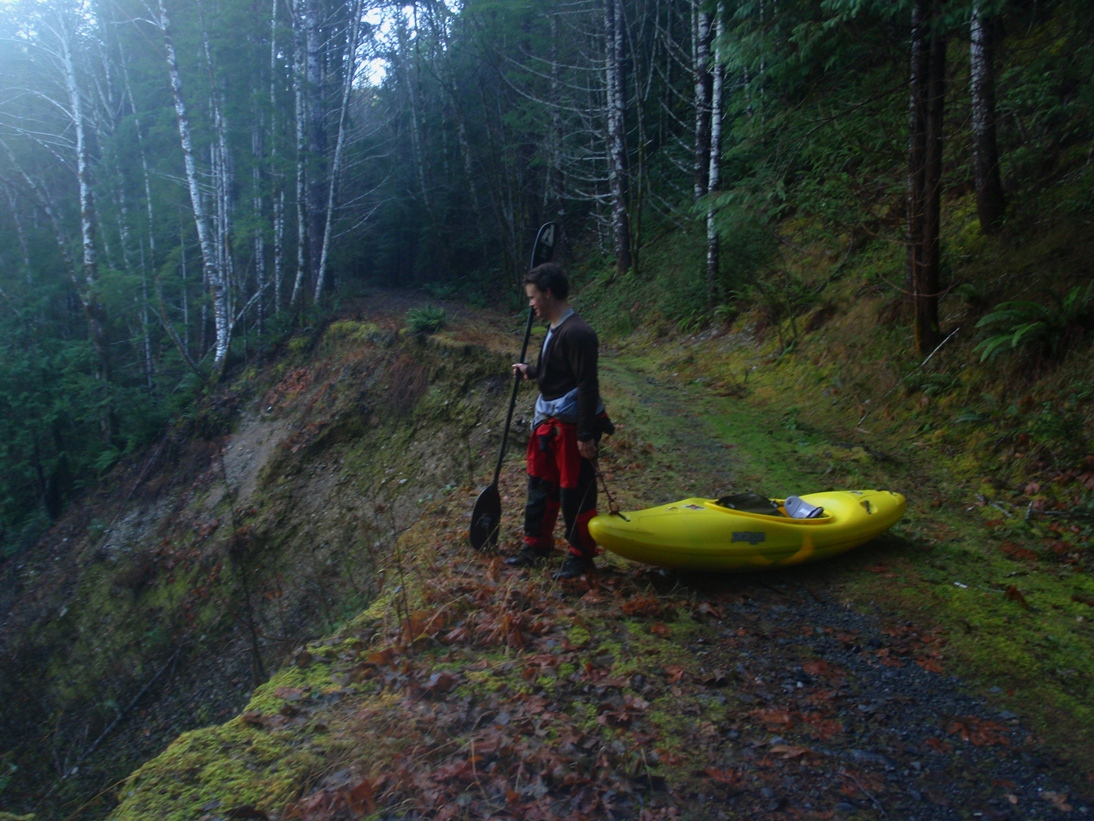 Waking up on New Year's (2012), with the huge storm that came through behind us and flows dropping steadily and predictably down, we decide to do either Hardscabble, Hurdygurdy, or Goose Creek. By the time we left the hotel, it was after 10 am, so we resigned to the easiest and least mission-y of the runs, Goose. I had tried to do this run 3 years ago, but the road to put-in had recently been blocked in, affectively closing the road for all motorized travel. Without knowledge of how long the hike was, we backed out and boated on the South Smith instead. This time around, we knew the hike was going to be about 2.5 miles (actually 3.4 miles) and were prepared mentally for it. So arriving at put-in at about noon, we hiked an hour down the perfectly drivable road to the creek far far below. The only reason for the road closure is a washout that happens at mile 2.8 or so. About a quarter mile before that there is also a creek crossing that would be tricky in the car. But there were plenty of turnouts up-road from those two points... so if you can manage your way around the dirt pile blocking the road, I would knock off a mile or two of the drive...