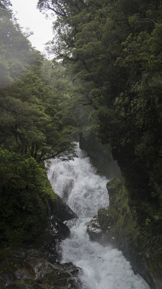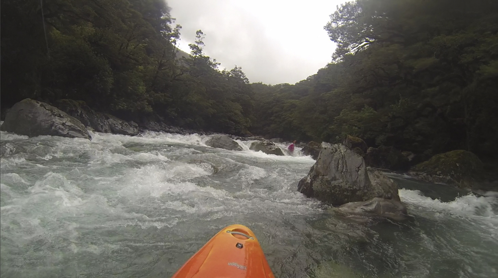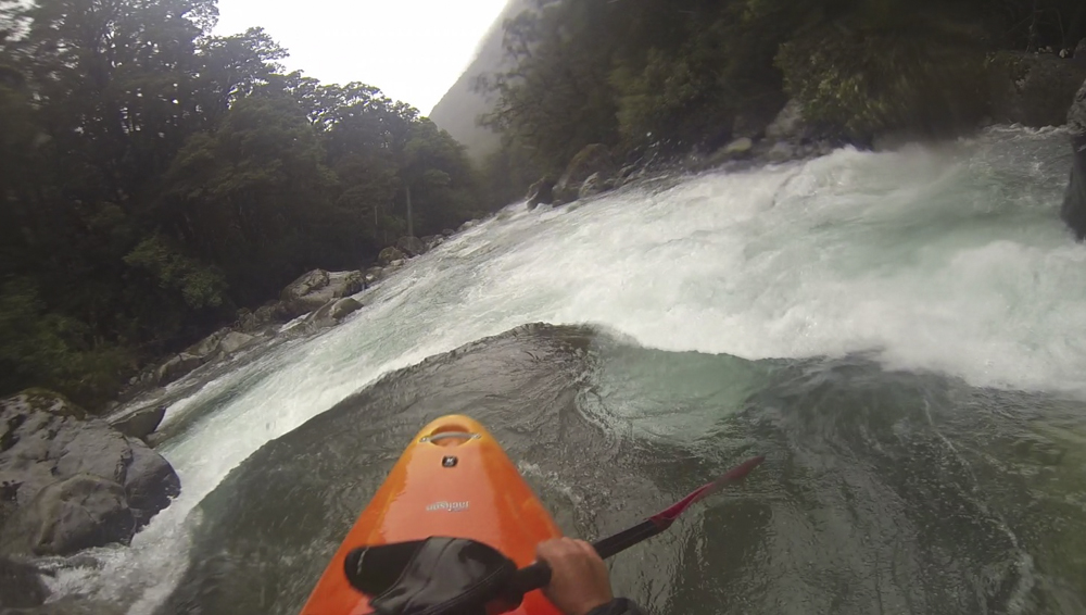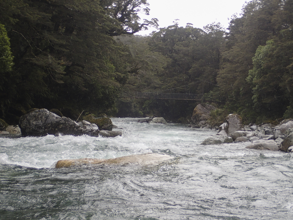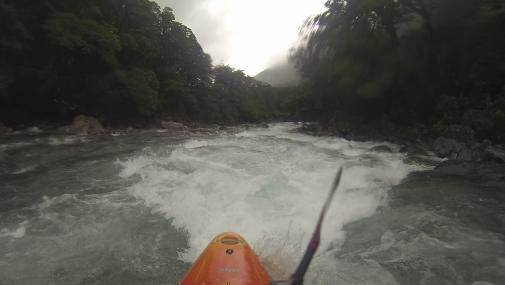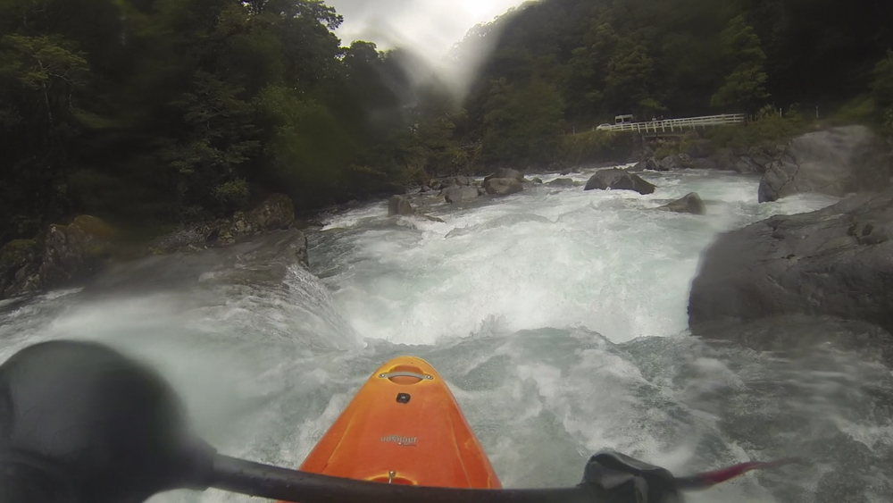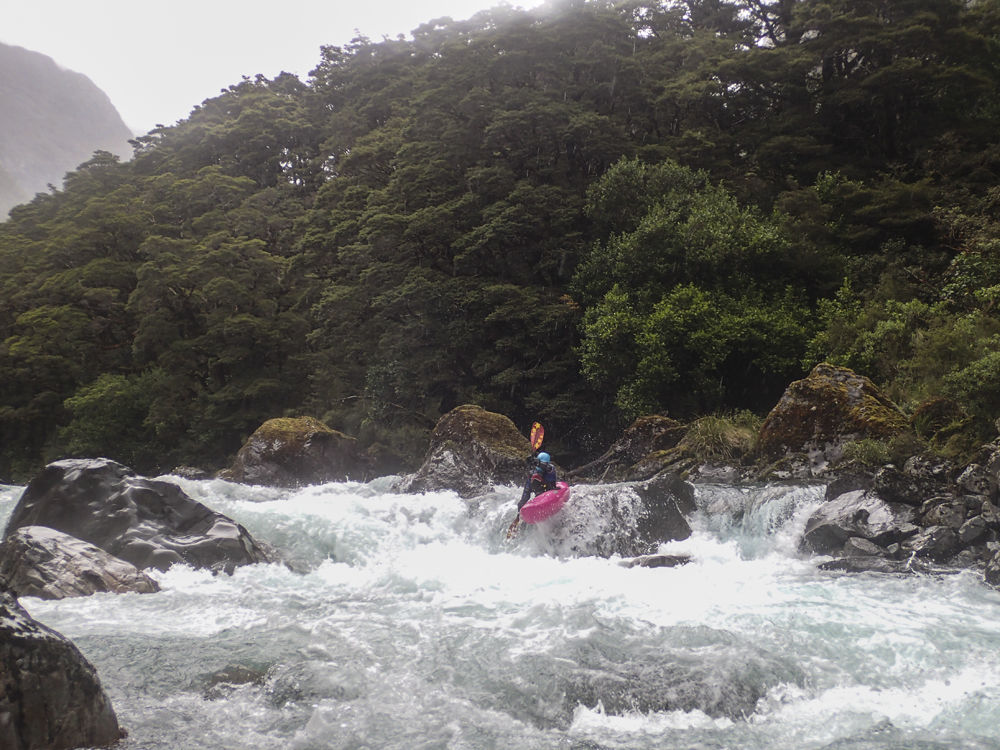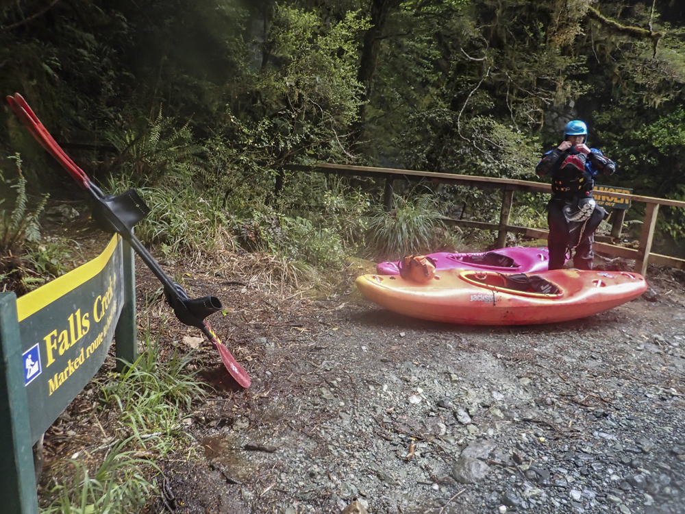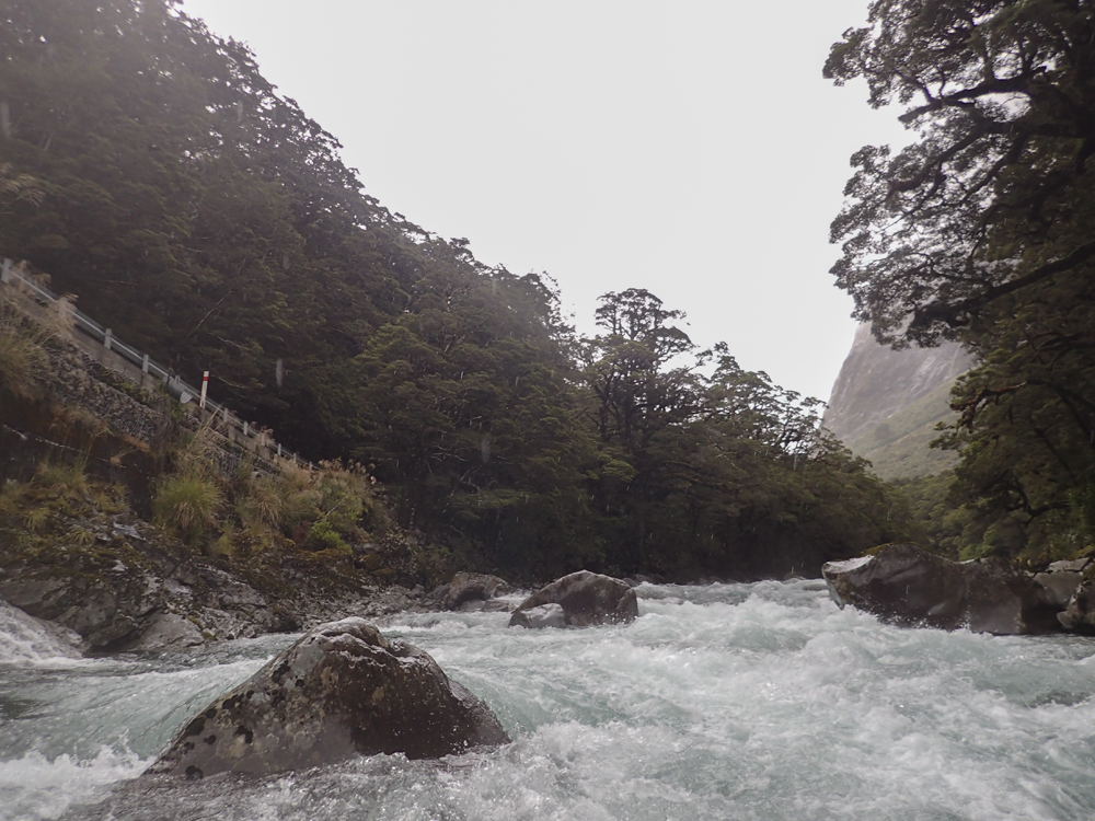 Put-in: Go back out to Highway 94, and continue towards Milford Sound. After 1.4 km you will come to Falls Creek. We parked at the small turn out just before the bridge. There is also some access points just after the creek.