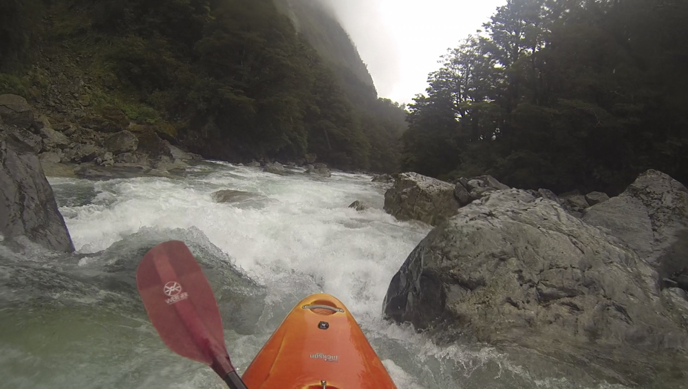 The Arthur had water for sure, maybe the Tutoko (it did). But Diane and I both decided that hiking was not in the cards for us that day so both of these runs were scrapped. However since it was another day of just us, we also needed a section we could hitch or jog the shuttle on. So we went back over the pass to the Hollyford to do the upstream, and easier, Falls Creek section of the Hollyford. I think Diane and I were both getting tired by this point in the trip as we had started to snip at each other a little. In hindsight maybe I should have waited longer to ask "why didn't you boof?" after she plugged a big hole, back-endered and was pushed against an undercut. It worked out ok as she got herself off of the undercut and stayed in her boat. But my question was not received well. Who would have thought?