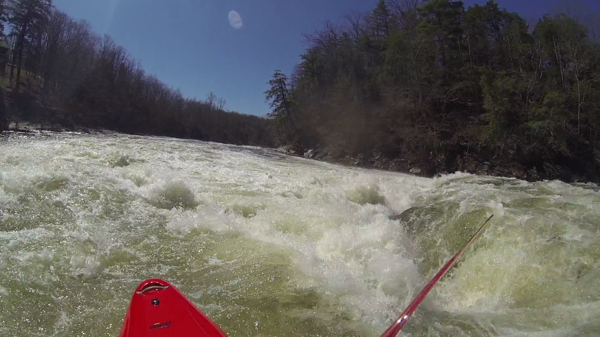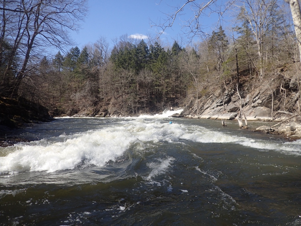 Pencil Sharpener (III+ to IV). Immediately downstream, at our flow it seemed like one rapid, you enter Pencil Sharpener. We caught eddies at the "lip" on the right and saw a clean line left of center so we ferried out to run down the straight forward rapid. Just dodge the holes and rocks! Below, it is flat water for 1.4 miles.