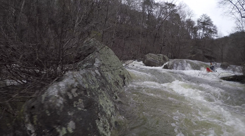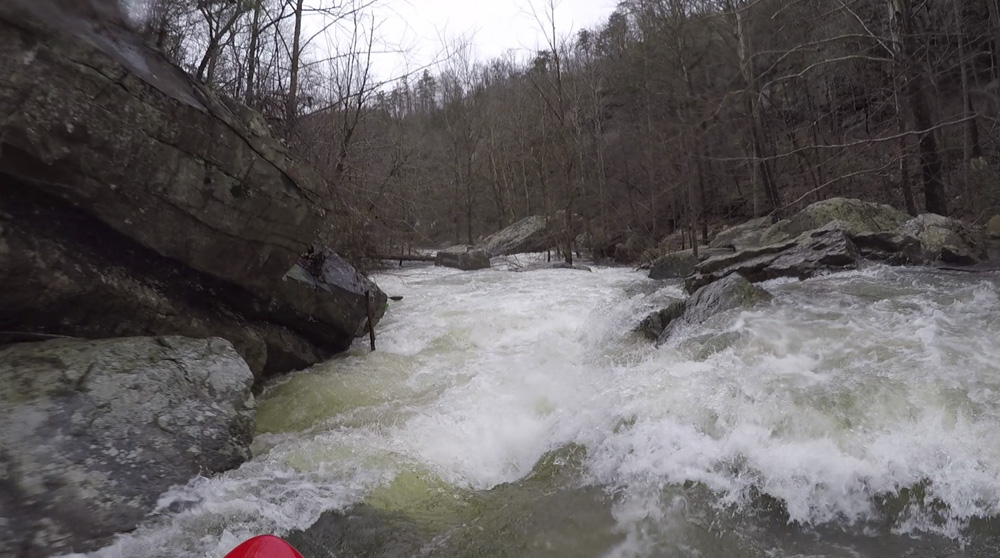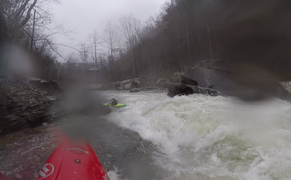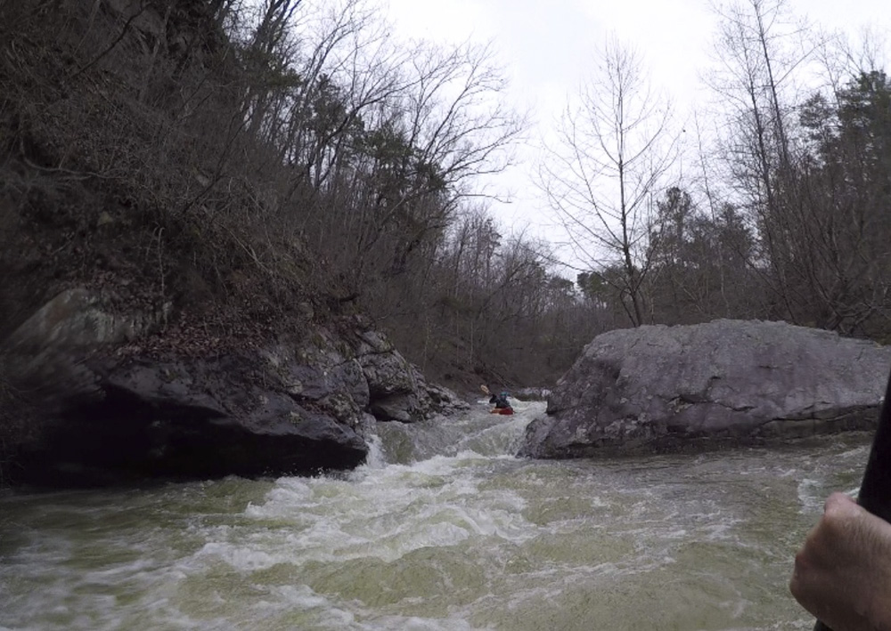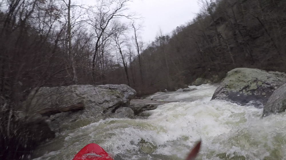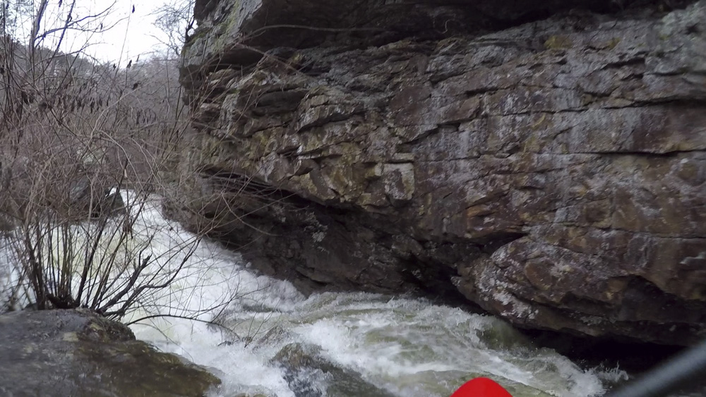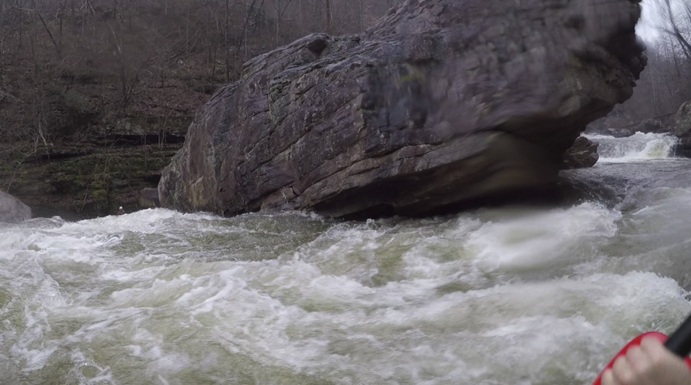Cliff Right (IV). Immediately below, the river goes right around a house sized rock. We eddied out on the left, note there is a big sieve there. This then allows you to see the rapid. Run along the backside of the house sized rock to the right, boof a small ledge, then straighten out and go down the right wall with a little left angle.
