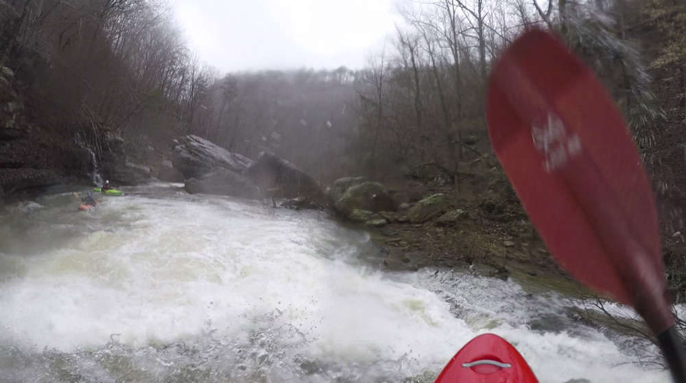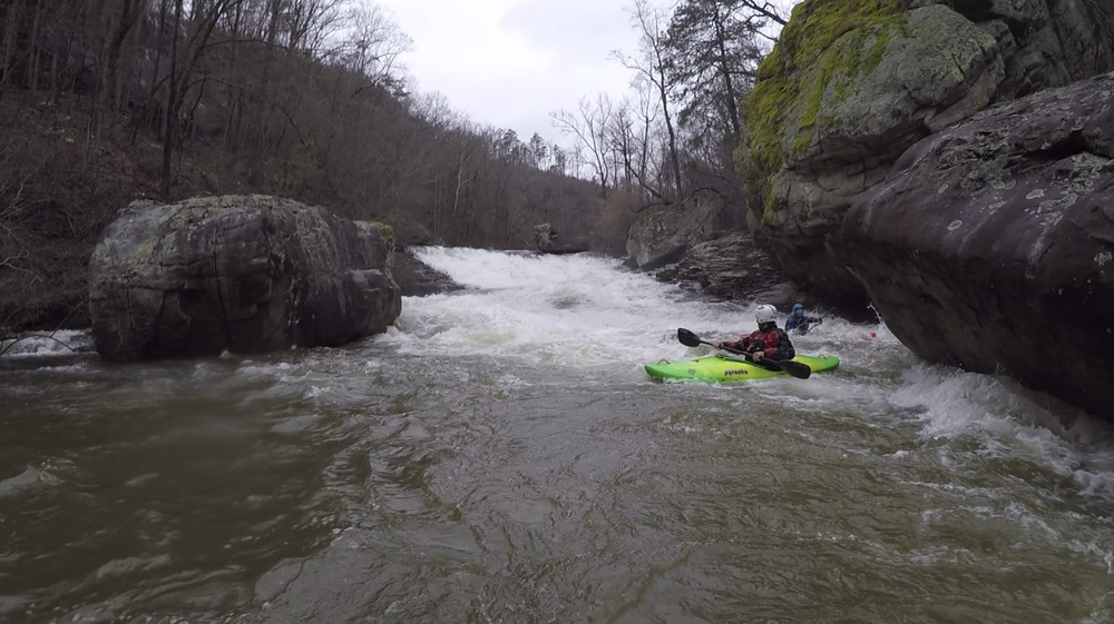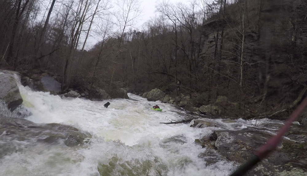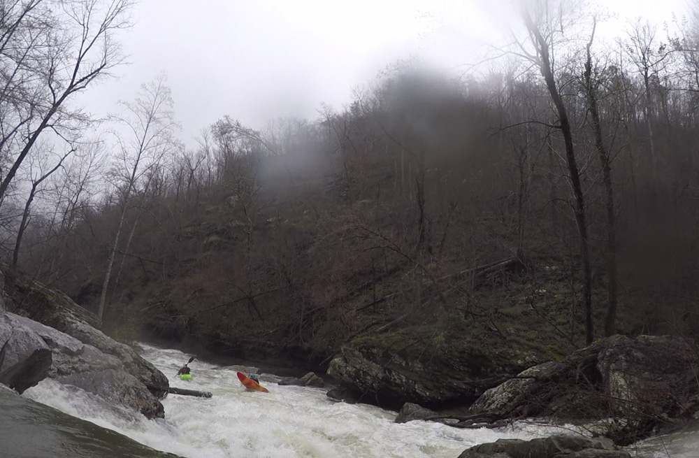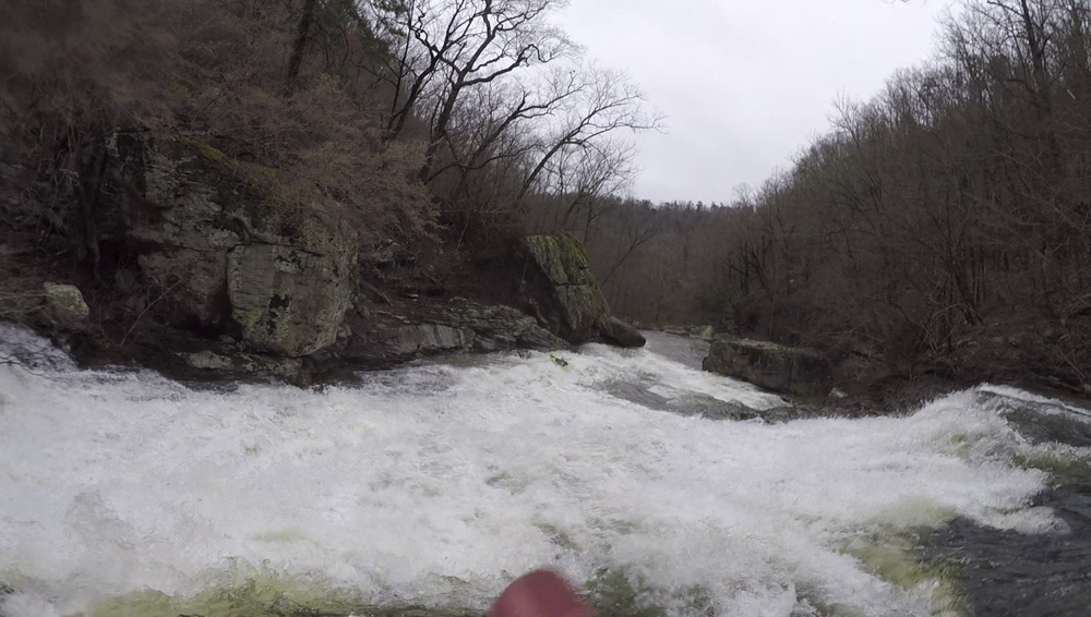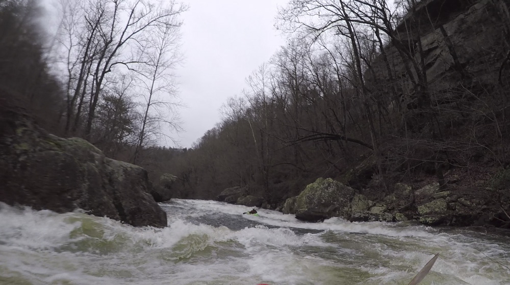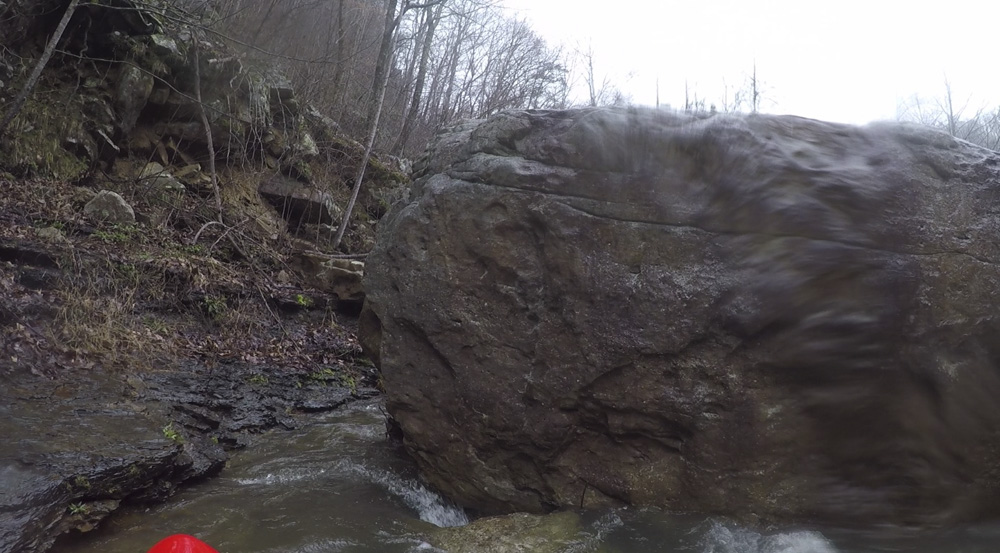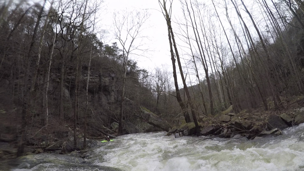 Cliff Right (IV). Immediately below, the river goes right around a house sized rock. We eddied out on the left, note there is a big sieve there. This then allows you to see the rapid. Run along the backside of the house sized rock to the right, boof a small ledge, then straighten out and go down the right wall with a little left angle.