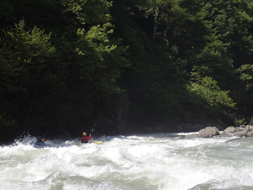 Waking up in the morning we quickly saw that the water had come up, and was now too high to do the Upper section. So our plan was changed to just have a mellow and short day, kayaking the lower class III section of river only. This run would have been a great run for a playboat at our high flow with numerous nice features. For us in our creekboats, it offered plenty of fun ferries and moves to make to spice it up a little, though only one rapid was harder than class III. The scenery on the run was very nice, though not rugged canyon like many of the other rivers we ran. Instead it was lush forest that could have been in Ecuador or North Carolina.
