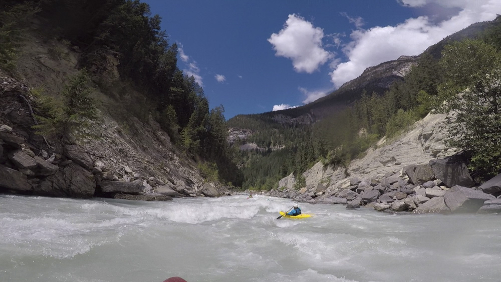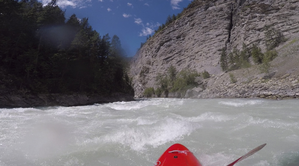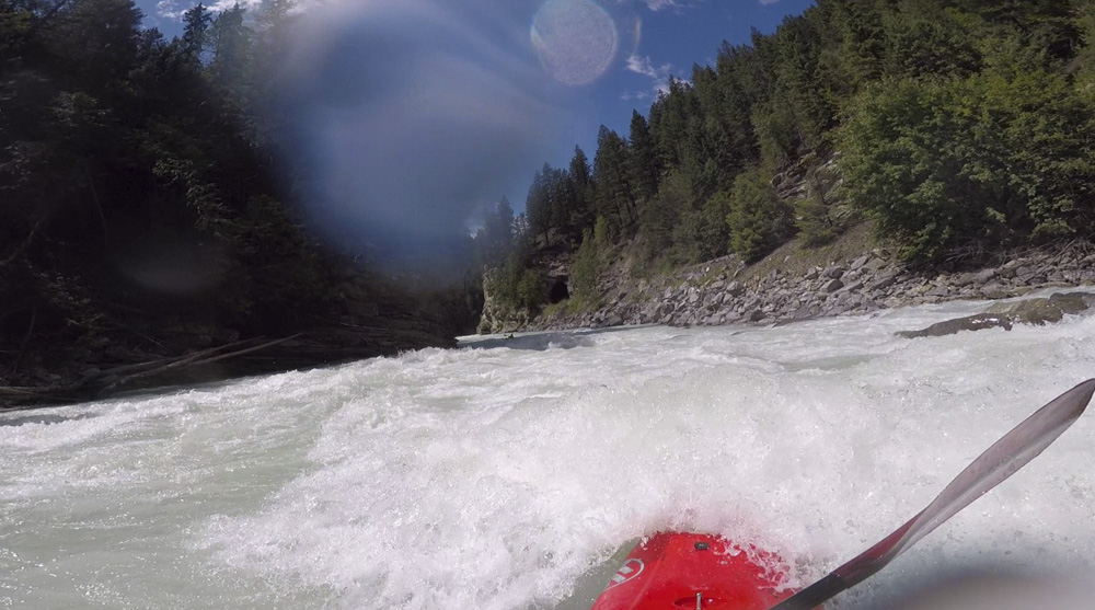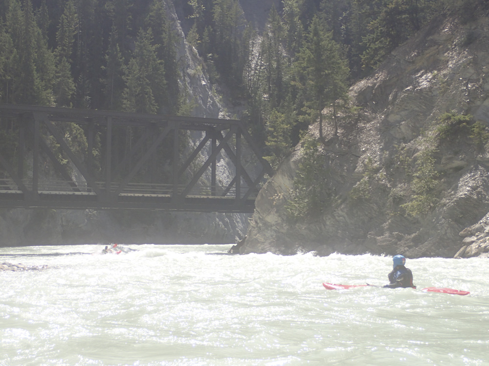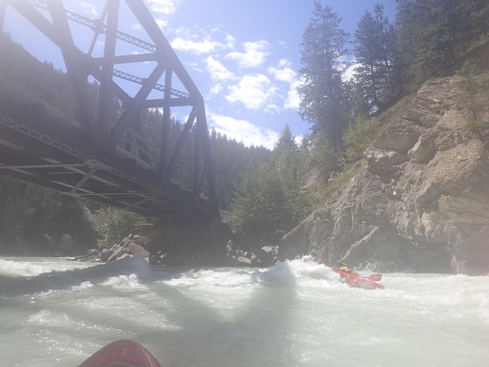 Put-in: Go back out of Golden, cross the river and get out to Highway 1. Take it East for 15.9 km. Just before the bridge over the river you can park and walk down to the river. Note, you have to cross the railroad lines which is technically illegal so you do risk fine. Since the powers that be made that rule, most put in on the Middle and paddle down both. Maybe in the future this will change again. The rafting companies certainly are working to make it legal to access here as it has shut down their ability to commercially raft this run.