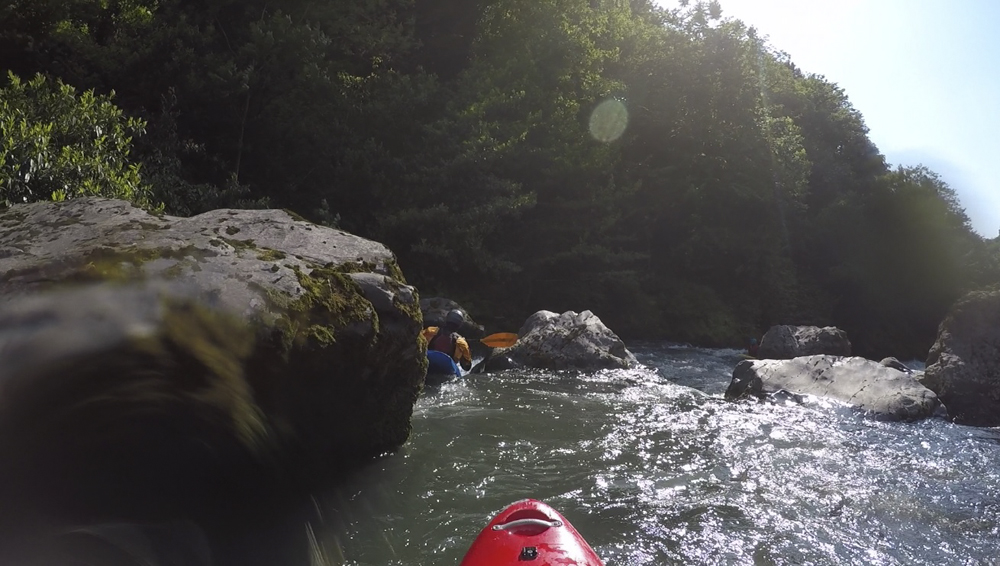 Sieves (II+ to III-). This rapid is just after it opens up a little. There is a wall of large rocks, we snuck around to the left and dropped through a small slot to get around the bulk of it. Be on your toes for wood.