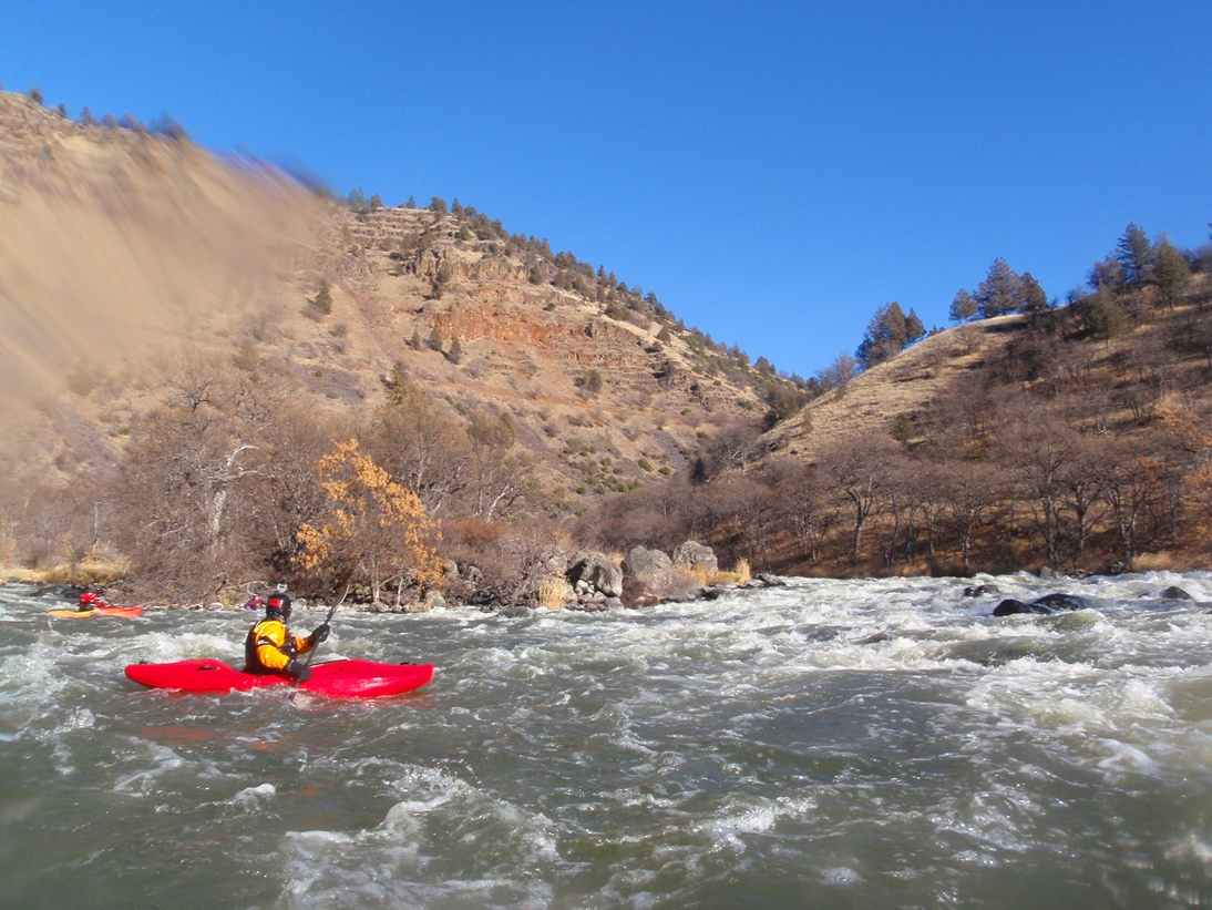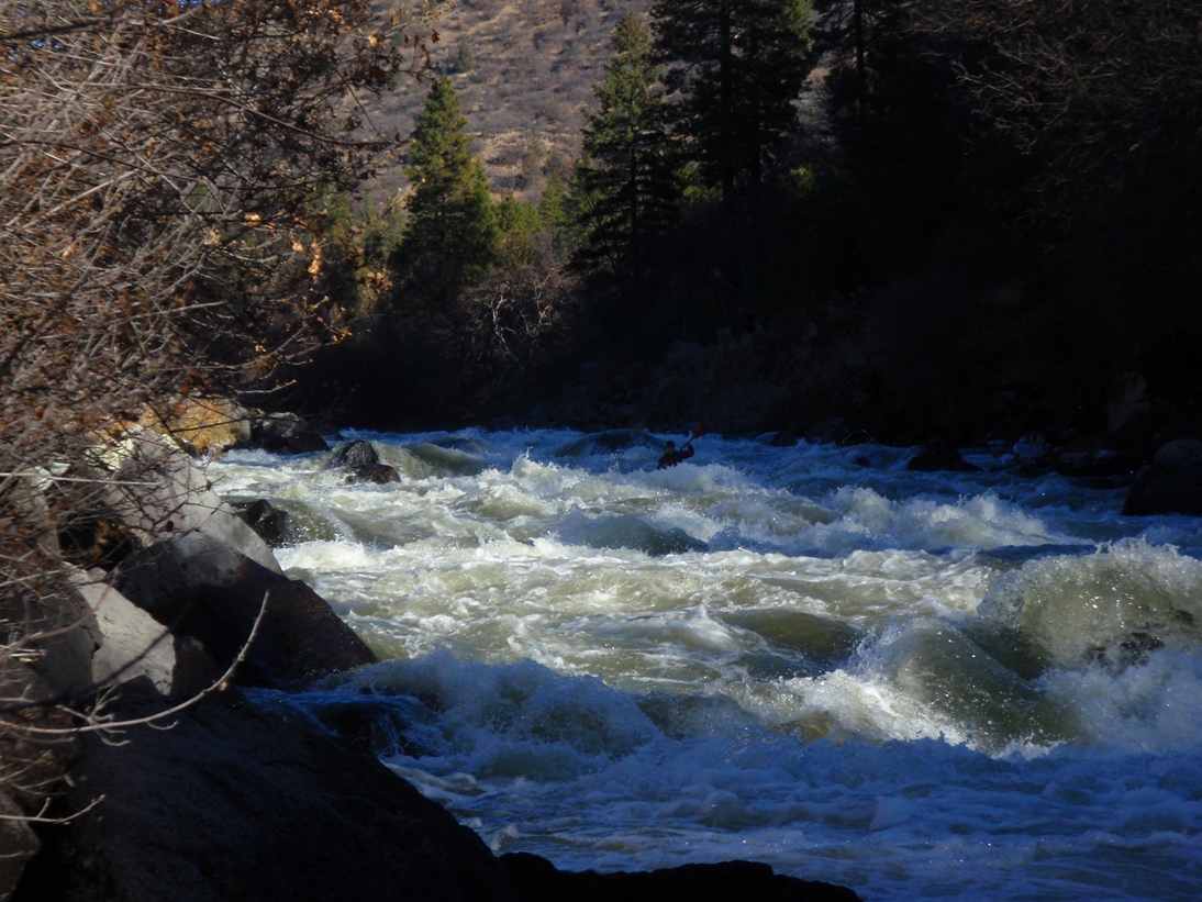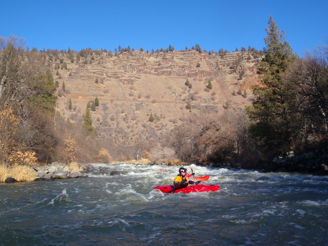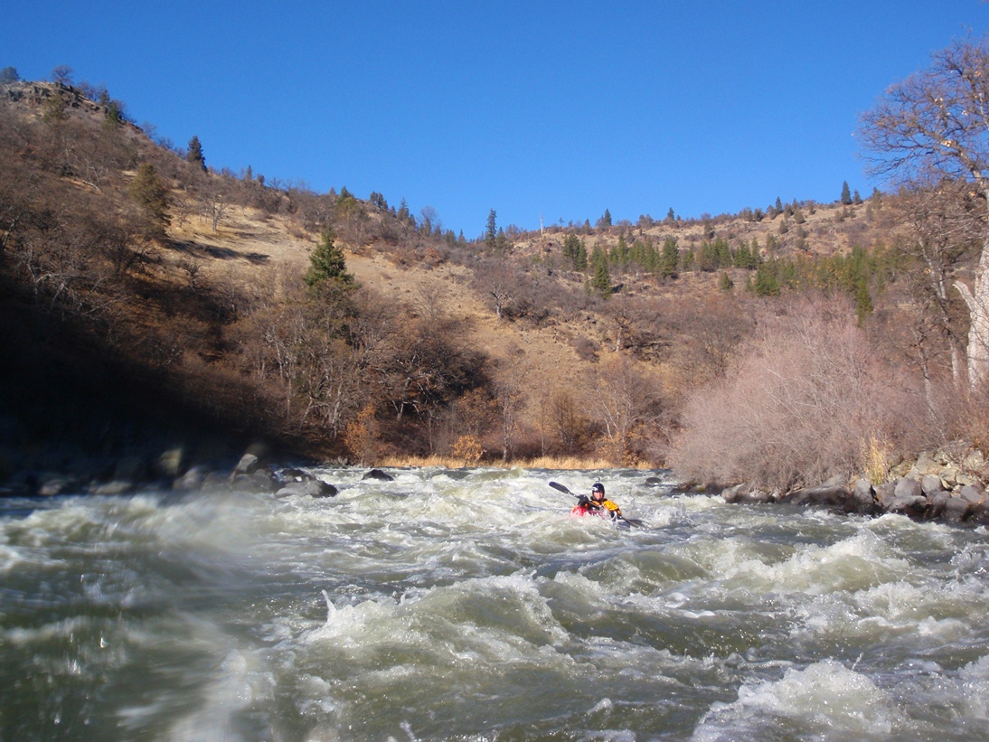 - Caldera (IV+). Putting in at Frain Ranch means that after a class I riffle, you paddle across a short flat water pool and enter the gorge. This rapid is the biggest set of moves, though it is pretty open. Several lines were available, kayakers could move left or right around the large midstream wrap-rock and then finish center away from the shallow shores. Rafts would have a much harder time with this rapid as many rocks could dump paddlers are wrap rafts.