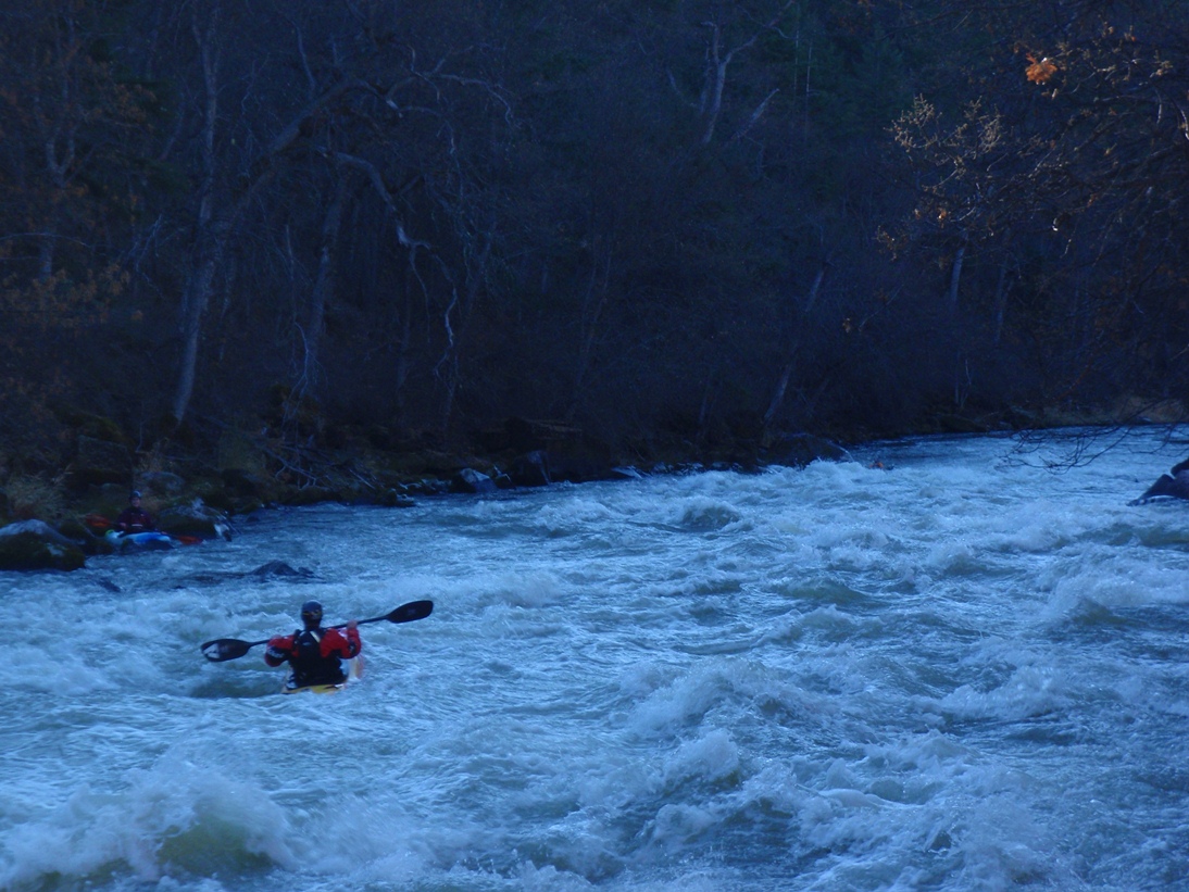 The Klamath has less than a full, warm hearted endorsement in the bible, something about a "warning to the unwary" and "only reason" for being included. That with the mention of a multiple hour shuttle or super rowdy 4x4 shuttle has kept me from making the 5.5 hour drive to the upper Klamath. This (2011) winter however, we are approaching the end of December and still are without natural flowing rivers. The memories of last winter are quickly fading and desperation for boating is quickly setting in. With that, as the unexpected flows on the North feather and San Joaquin dropped out, the only option for entertainment was the Klamath with its dependable release. So the drive was made under the pressuring of Darin's "But it is my birthday, so you have to come." Once at the river, we found the rapids to be fun and continuous class IV. However, due to the nature of the rapids, flipping is a big time no-no. The muddy water hides many rocks just under the surface level. Flipping would be a roll of the dice on whether you would develop an intimate relationship with a rock. Also, several rapids are over a quarter mile long. The longest, Hell's Corner, is a half mile long of non-stop action. This of course brings me to my next point, that swimming is also a non-option. Cacreeks tells a story about a raft swimmer Hells Corner which after going to the river, I fully believe (not that I didn't before).