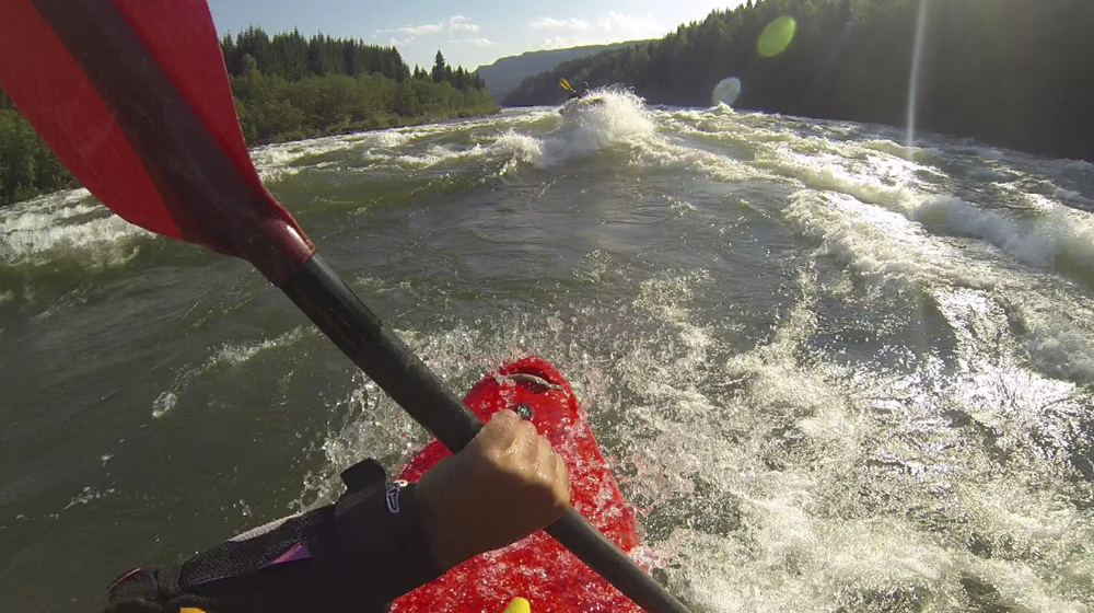 - Sneak (IV to V). The sneak was easy enough down the right amongst outcroppings of bedrock. If it was higher still though, this might even close out some and turn into pour overs. The left side of the river had a huge curler (like 15 feet tall) that folded right into a mammoth pocket hole against the island. The challenge would be that there is also a huge eddy line that would prevent you from getting left enough to clear through the curler without dropping into the hole. At our flow, sneaking was the only viable option.