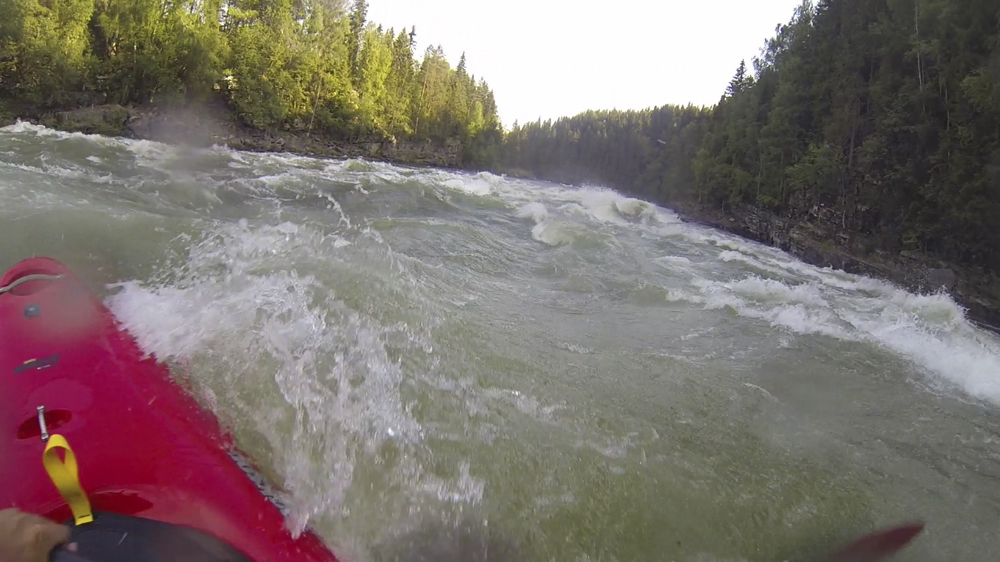 With a drive from Sjoa to Oslo still ahead of us for our flights the next morning, we still weren't satiated. Reiner had driven north just a day prior and had noticed that the Hunderfoss damn was still a significant amount of water. With the knowledge we decided to head south to it as it was very much on the way to the airport for us. Arriving in the evening, we noticed that it had a lot of water. The guidebook says it is good to 500 cms (~15,000 cfs)... but we estimated it had to be at least 1,000 cms. But the run was only supposed to be class III to IV right? Deciding to further investigate we drive up either side of the river hoping for a glimpse. We do manage one on the main river left road. The rapid we see looks surprisingly large. Is this the rapid that the book says is a sneak on the right away from huge holes at higher water? The right looks to have some poor overs as well... dang. Ah screw it, let's put on anyways... it is our last day and I am not ready to dry my gear yet!