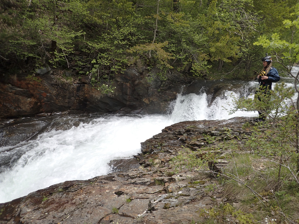 Slab Boof (V). Immediately downstream was another scout. Scout left. Only Diane and I wanted to run this one as the middle teir was maybe 8-10 feet tall and landed on a slab. But it was like stuff we do in the South East all the time so we decided to go and let the bow drop to take the impact. The first tier is a slopping hole that we drove down the middle for. The second tier was boofing the right side onto the slab, and the exit was a small ledge that could be run anywhere. The very next rapid is actually maybe just the exit of this, and should be run in the far right small channel as the left side has a hidden large rock just over the horizon.
