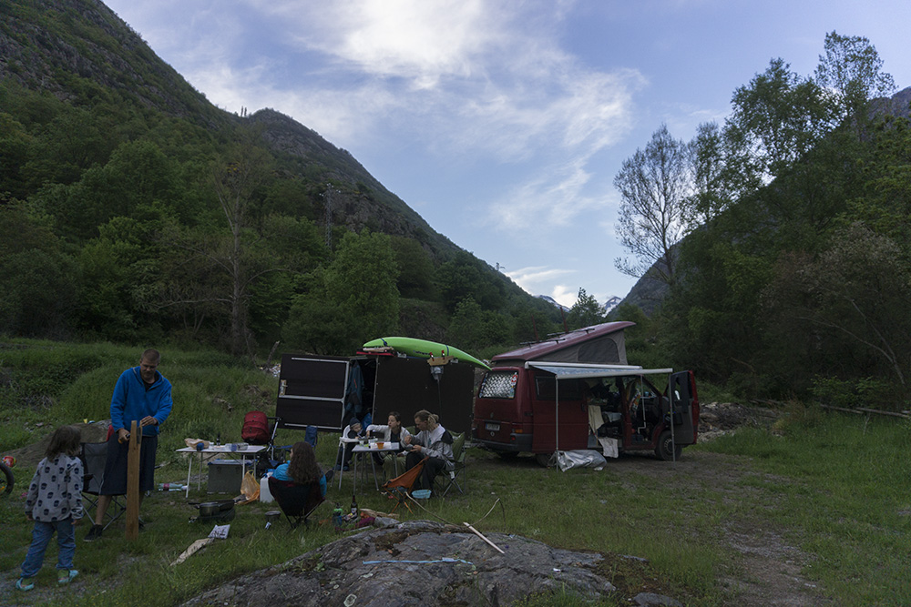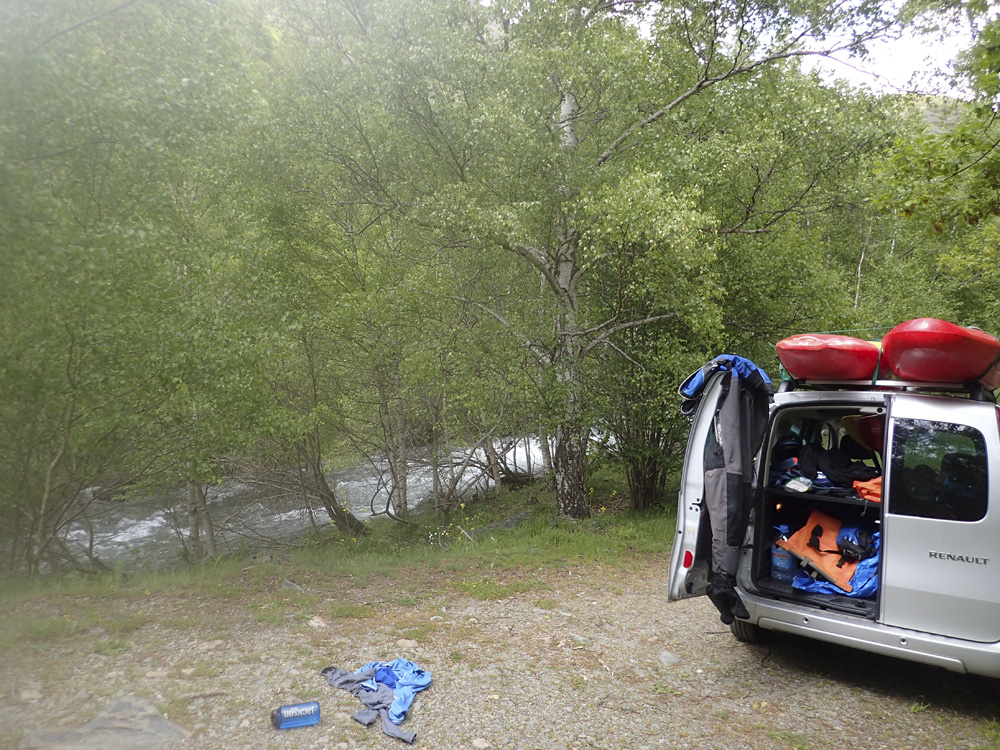 Waking up we found the water lower. Tentatively we thought we would get perhaps two sections this day. I think we under sold the Boavi, the number of rapids on it, and how long they would take to scout. But we decided to start with it, as we were told that it was the best section of river in Sort.