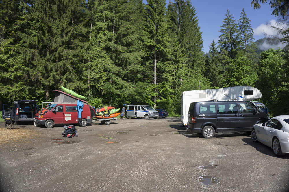 Take-out: Garmisch-Partenkirchen is a pretty major town along B23 and the Loisach River. On the West side of town, follow B23 out of town. Just on the edge of town you will pass Camping Erlebnis Zugspitze which is a busy campground... the one we did not stay at. In another 650 yards turn right on a little road that drops down to a parking area at the take-out. This is also where we, along with several other vans camped.