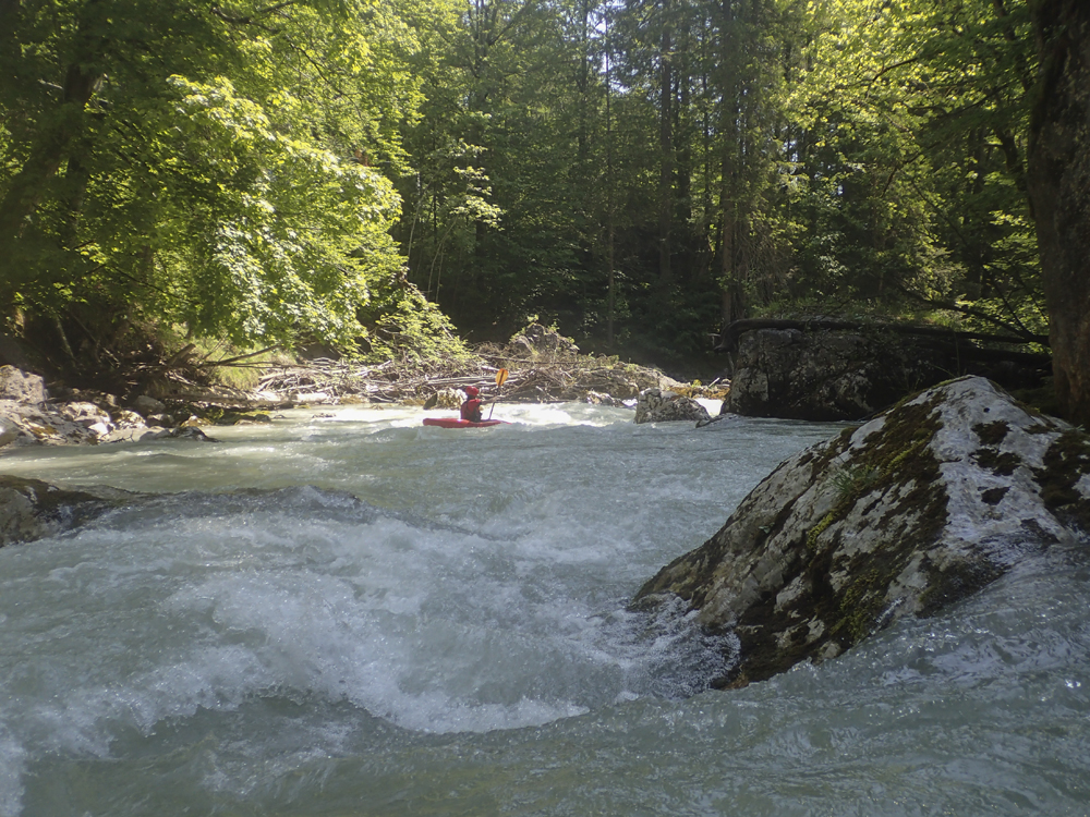 - Crux (III to III+). We entered a section where large rocks made for a blind rapid. Approach with caution to ensure no wood fills any of the channels. Just downstream is a ledge that we ran far left that had a moderately sticky hole at the base. Just keep it straight!
