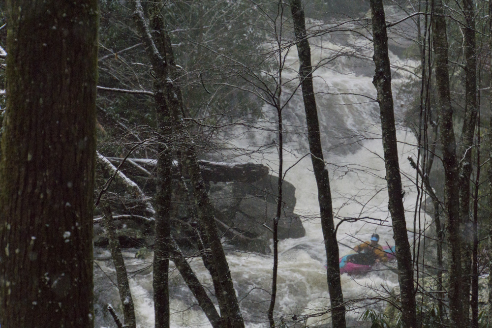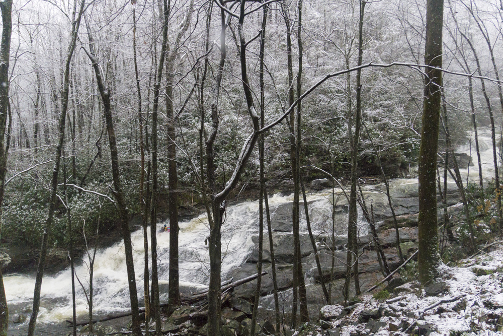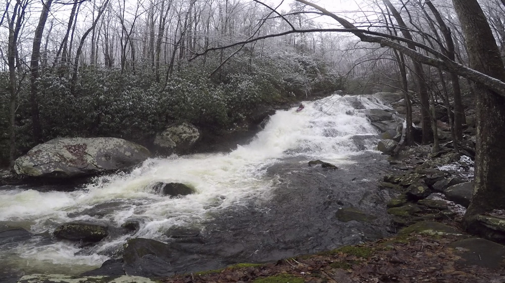- Kick Yer Dog Falls (V+). One of the biggest rapids in the Smokies, this drop is the real deal. There are two parts, the entrance ledges which end in a non-vertical falls that you want to run right, and then the final ramping falls that you again, want to run right. It is all easily scoutable from the trail, safety is good on the top non-vertical falls as it can pack a good size hole, as it is on the bottom slide in case anyone flips at the bottom and is unconscious.