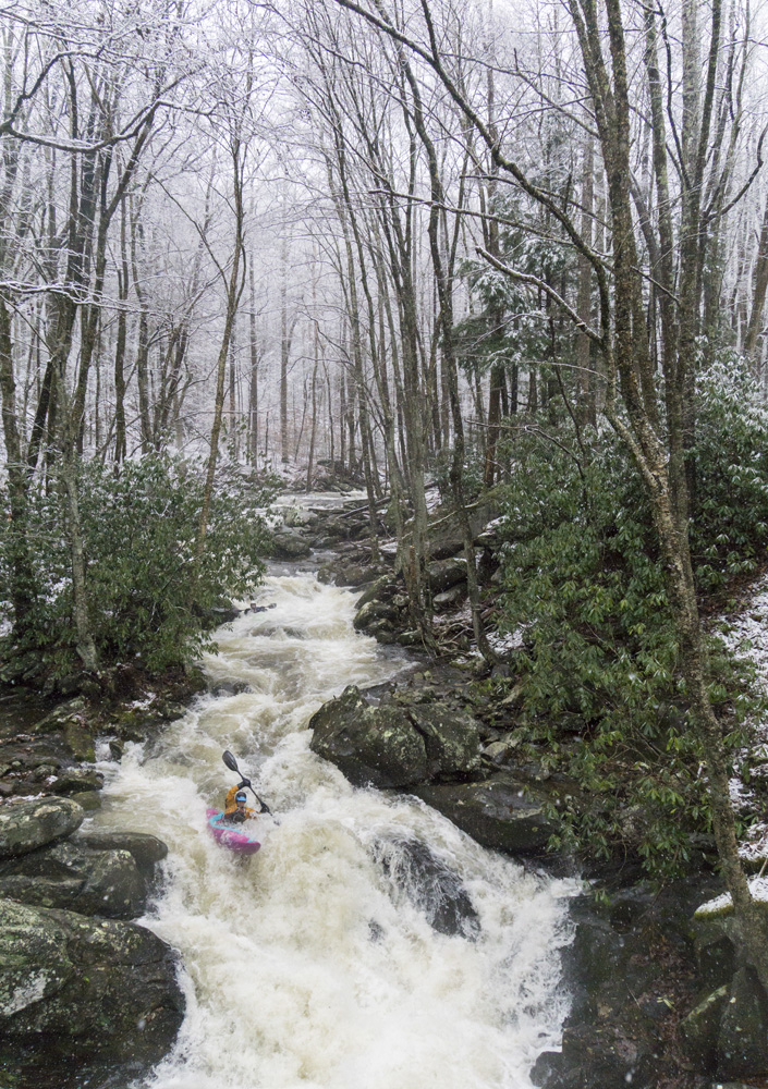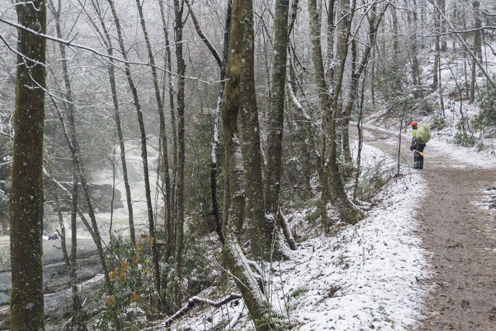 Put-in: Cross the foot bridge and bear left, going straight would take you up the Thunderhead Prong. So, go left and walk the 0.45 miles up to Kick Yer Dog Falls. It is a decommissioned forest road so the hiking is easy.