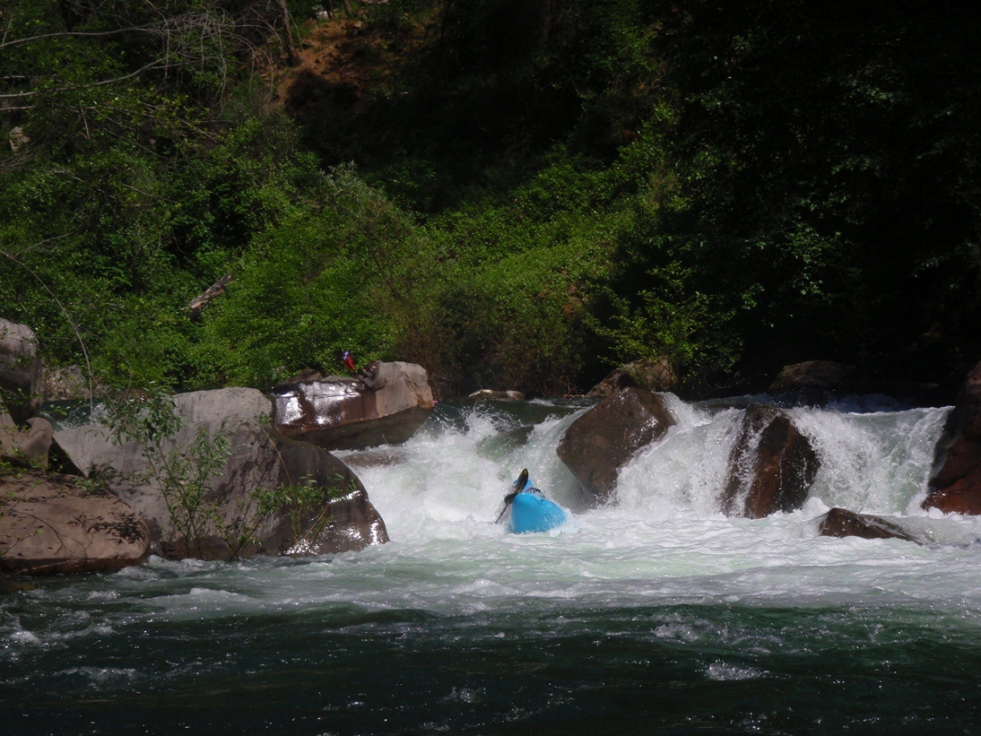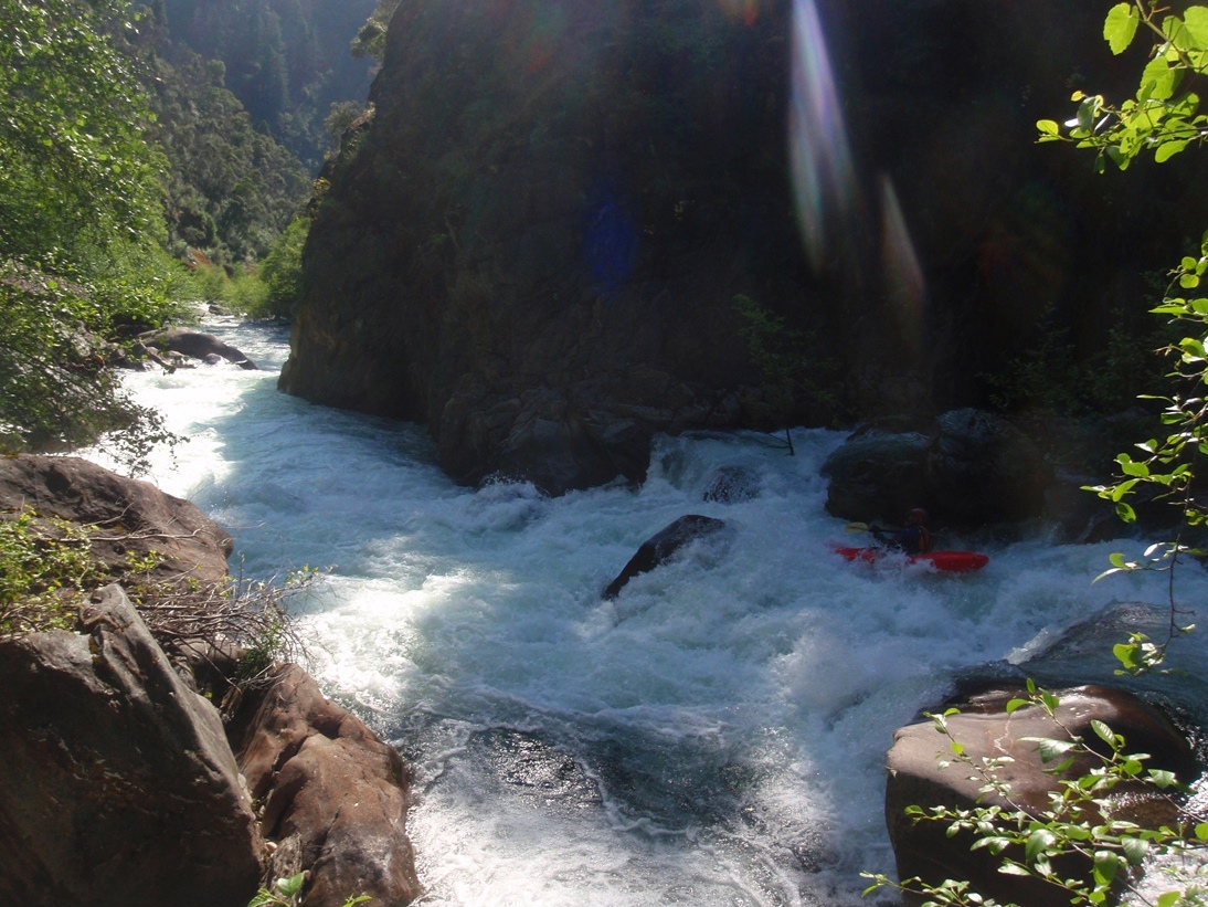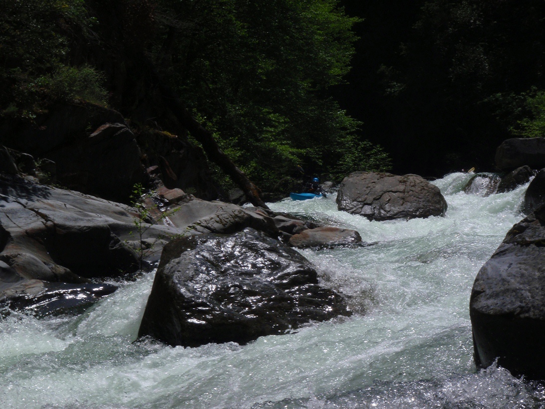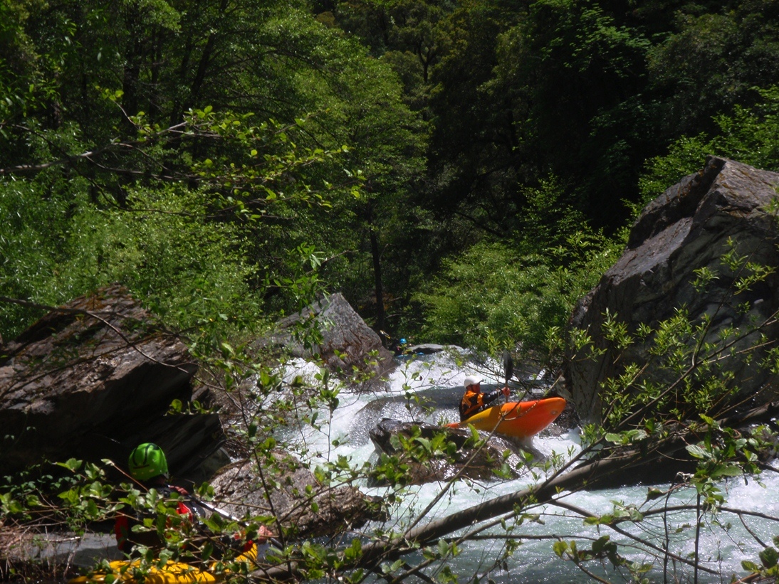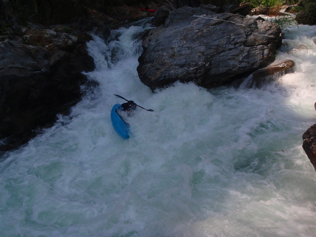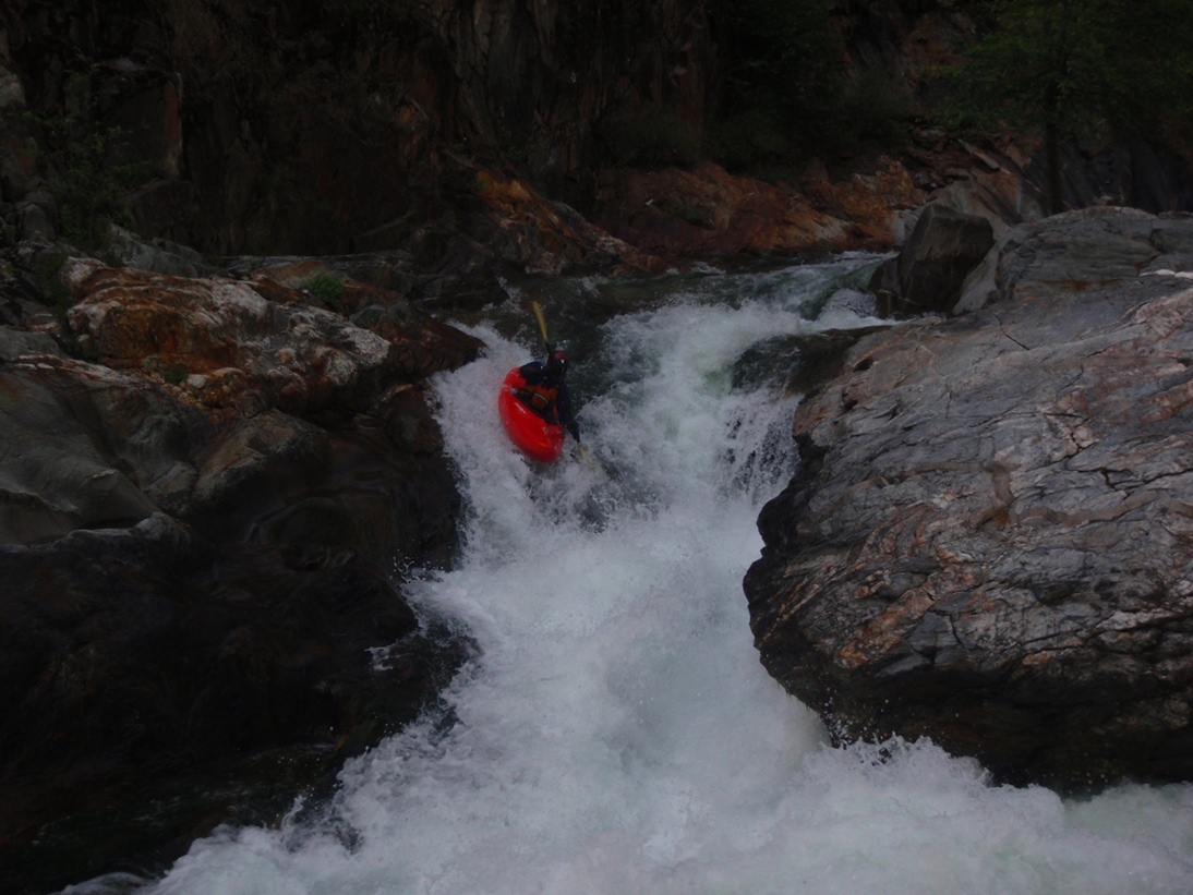 So, let's start with the positive. The scenery is superb. The tall forest canyon rises around you with scenic creeks splashing down the cliff faces. The water is crystal clear with a sparkle of turquoise that please your senses as it falls down the rapids. The rapids for the most park of unique character though the routine of rocks placed in bad places does get old. Though several of the rapids are as good as it gets, nice clear lines with fluffy holes and fun boofs. The downside of the run is the last quarter-mile of the rapids. After some fun class IV+ to V- you get to a sizeable class V that we all ran, this leads immediately into a scout with dangerous sieve/undercut in play. This immediately leads to a cascade which I am not sure has ever been run. A tall drop with a large undercut/sieve and hole I think this drop goes but needs a probe unit to prove so, and several capable probe units have walked it. This then leaves to a ledge that is not always run, which then leads to a class IV+/V- lead in to a normally walked drop that packs a powerful hole, very large uncut, and a cave behind the falls. The problem with the lead in is that you have to catch a very large eddy with a very small entrance at the lip of the falls. Although the eddy is 20 feet wide, the entrance is only 5 feet wide. It is wise to station someone at the entrance to catch people. I know of a few people who have made the eddy only because someone was there to pull them in. So, although there are no portages up to the final gorge, there are at least two, possibly 4 in the last quarter mile. To boot, the portages are in vine and poison oak infested areas that make for a major pain both real-time and down the line (itching as I type this).