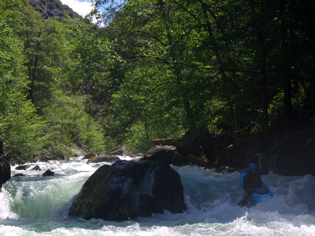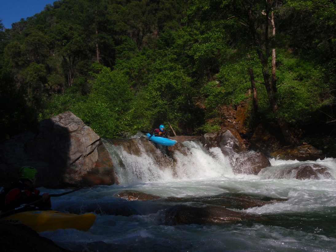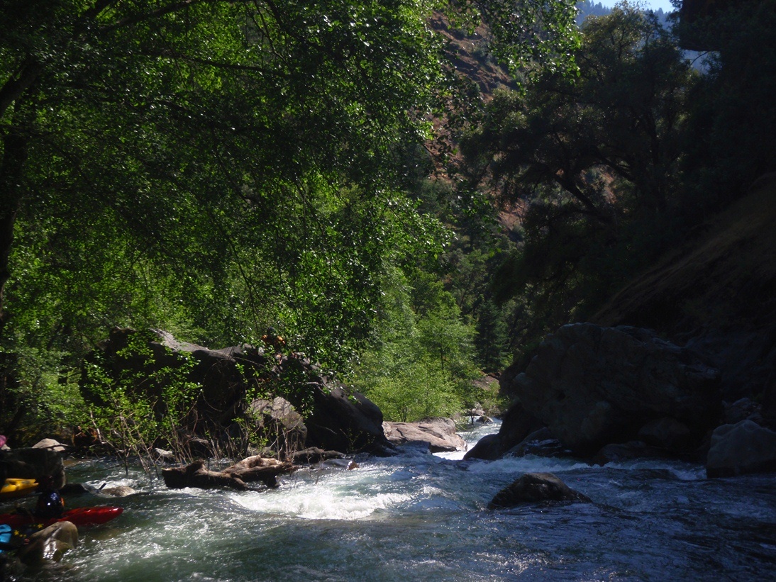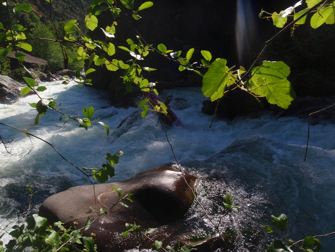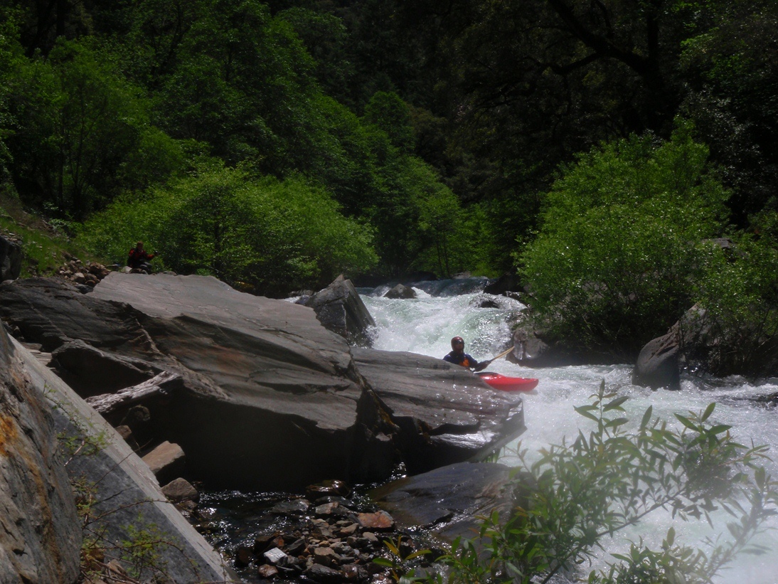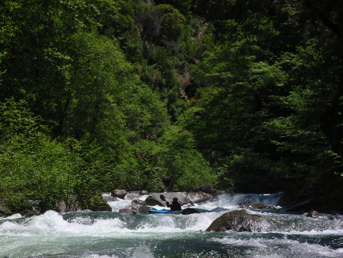 So, let's start with the positive. The scenery is superb. The tall forest canyon rises around you with scenic creeks splashing down the cliff faces. The water is crystal clear with a sparkle of turquoise that please your senses as it falls down the rapids. The rapids for the most park of unique character though the routine of rocks placed in bad places does get old. Though several of the rapids are as good as it gets, nice clear lines with fluffy holes and fun boofs. The downside of the run is the last quarter-mile of the rapids. After some fun class IV+ to V- you get to a sizeable class V that we all ran, this leads immediately into a scout with dangerous sieve/undercut in play. This immediately leads to a cascade which I am not sure has ever been run. A tall drop with a large undercut/sieve and hole I think this drop goes but needs a probe unit to prove so, and several capable probe units have walked it. This then leaves to a ledge that is not always run, which then leads to a class IV+/V- lead in to a normally walked drop that packs a powerful hole, very large uncut, and a cave behind the falls. The problem with the lead in is that you have to catch a very large eddy with a very small entrance at the lip of the falls. Although the eddy is 20 feet wide, the entrance is only 5 feet wide. It is wise to station someone at the entrance to catch people. I know of a few people who have made the eddy only because someone was there to pull them in. So, although there are no portages up to the final gorge, there are at least two, possibly 4 in the last quarter mile. To boot, the portages are in vine and poison oak infested areas that make for a major pain both real-time and down the line (itching as I type this).