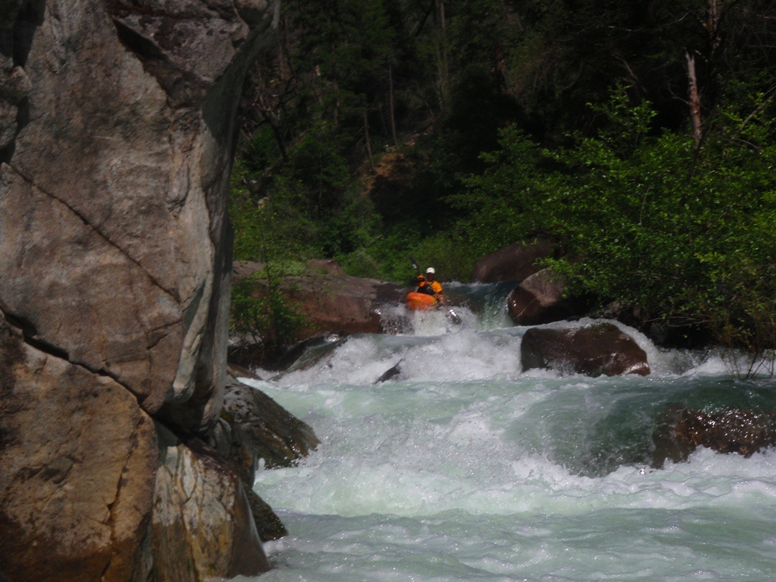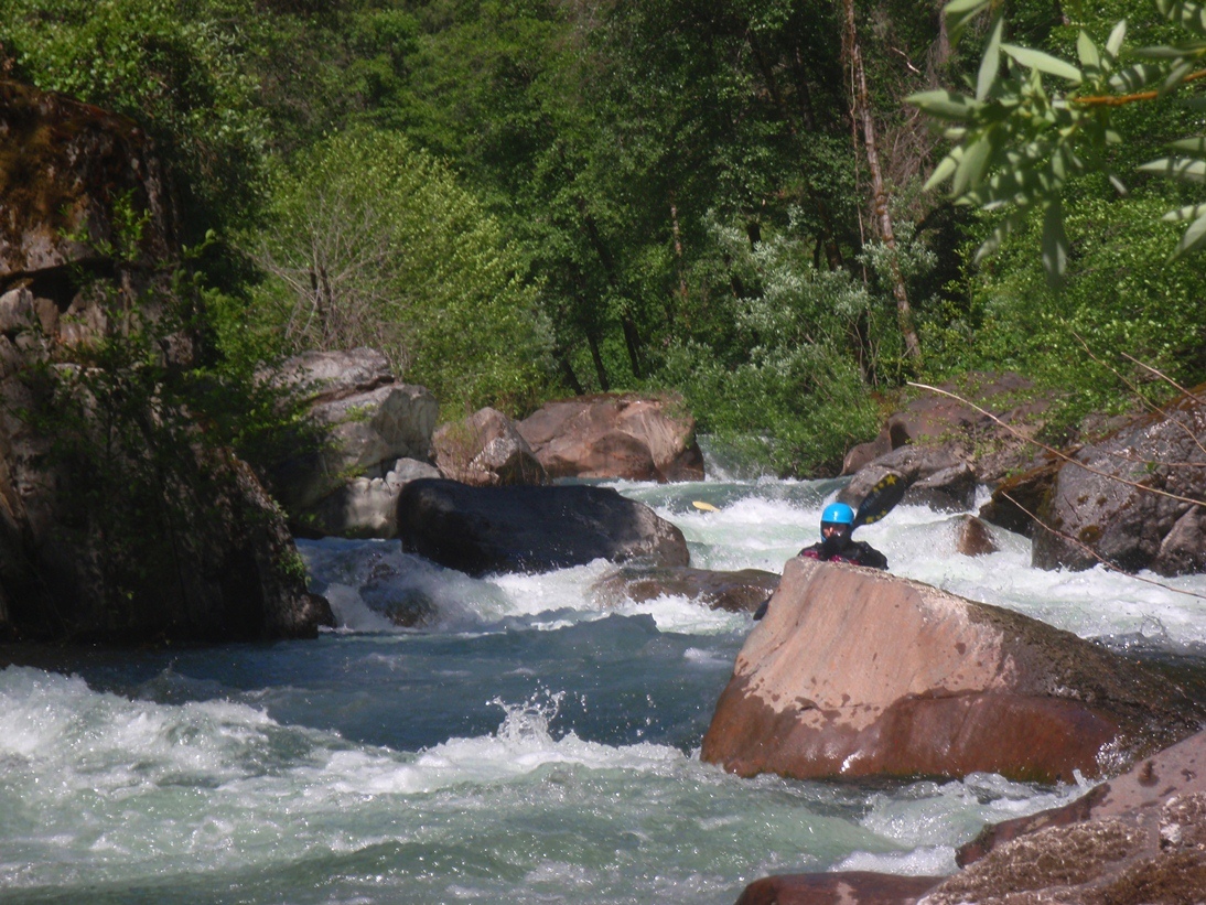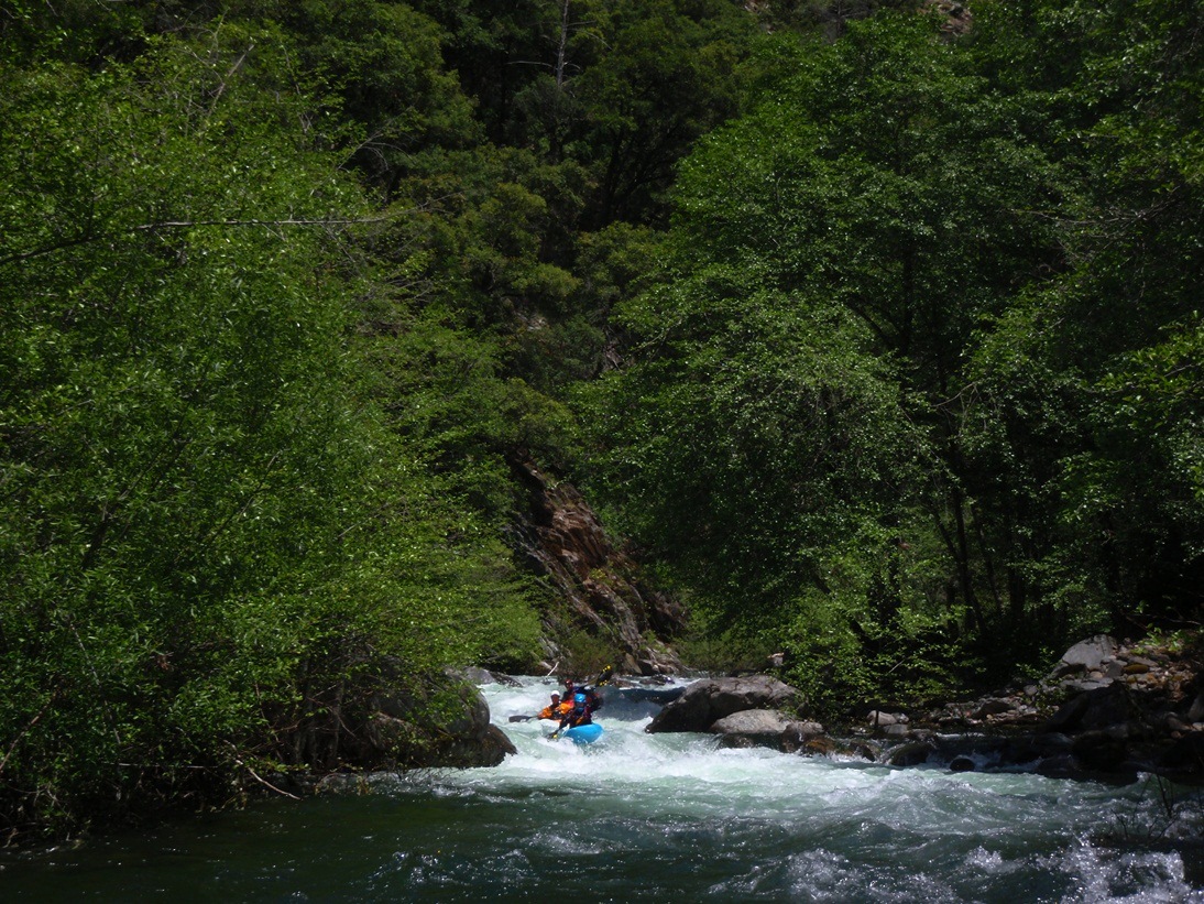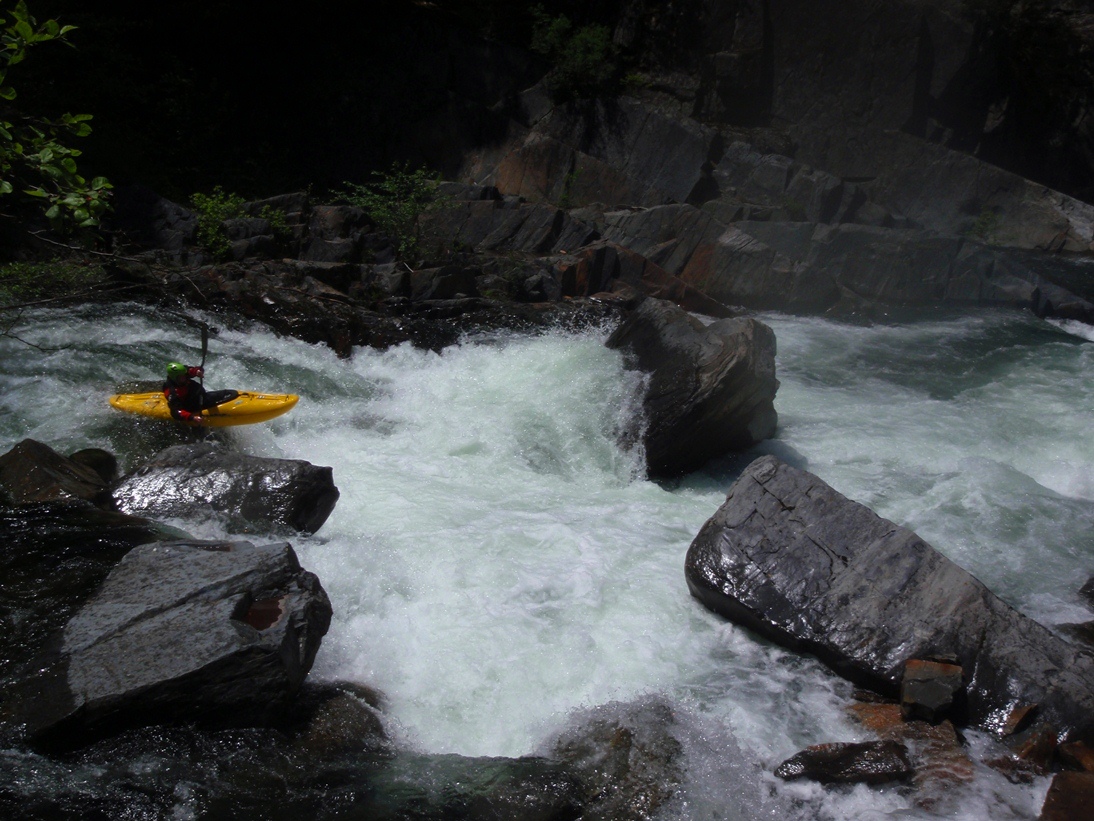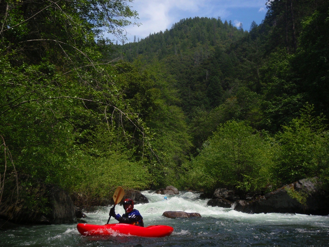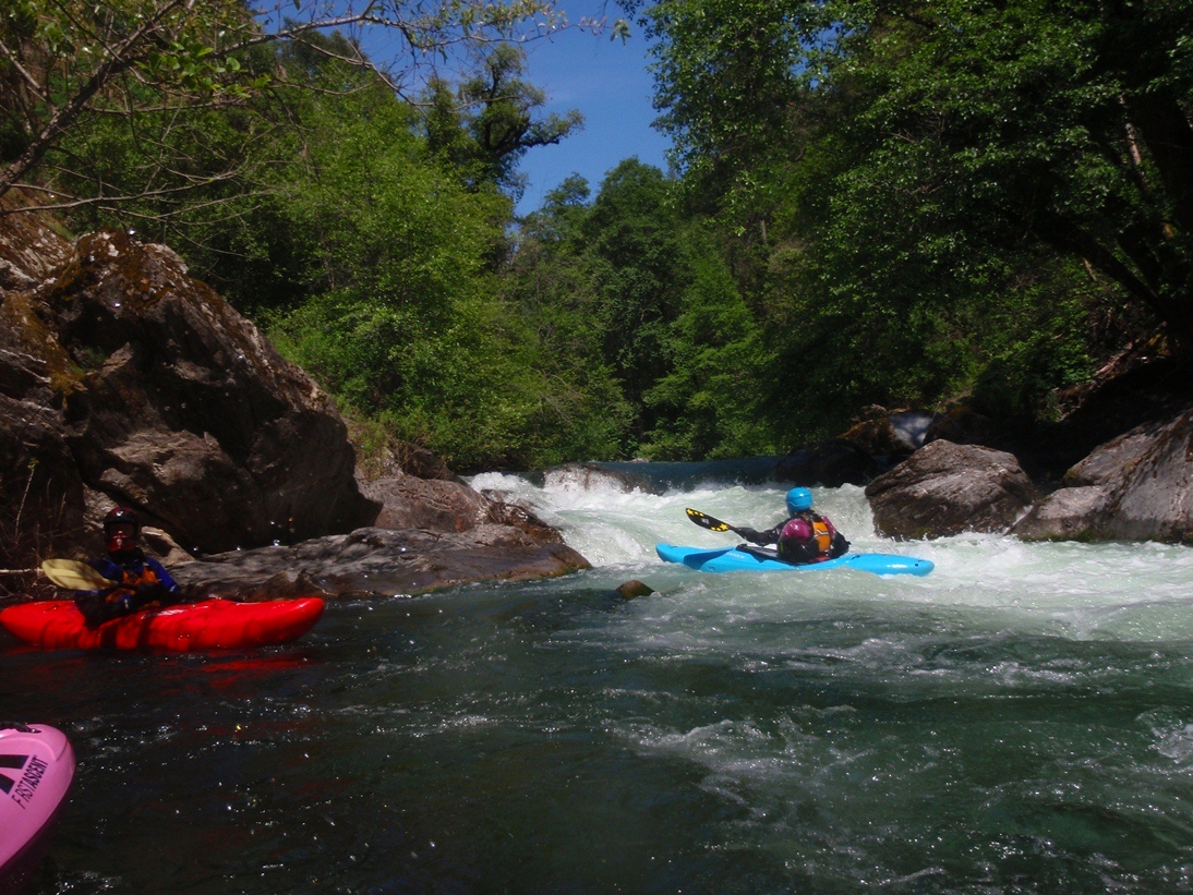 So, let's start with the positive. The scenery is superb. The tall forest canyon rises around you with scenic creeks splashing down the cliff faces. The water is crystal clear with a sparkle of turquoise that please your senses as it falls down the rapids. The rapids for the most park of unique character though the routine of rocks placed in bad places does get old. Though several of the rapids are as good as it gets, nice clear lines with fluffy holes and fun boofs. The downside of the run is the last quarter-mile of the rapids. After some fun class IV+ to V- you get to a sizeable class V that we all ran, this leads immediately into a scout with dangerous sieve/undercut in play. This immediately leads to a cascade which I am not sure has ever been run. A tall drop with a large undercut/sieve and hole I think this drop goes but needs a probe unit to prove so, and several capable probe units have walked it. This then leaves to a ledge that is not always run, which then leads to a class IV+/V- lead in to a normally walked drop that packs a powerful hole, very large uncut, and a cave behind the falls. The problem with the lead in is that you have to catch a very large eddy with a very small entrance at the lip of the falls. Although the eddy is 20 feet wide, the entrance is only 5 feet wide. It is wise to station someone at the entrance to catch people. I know of a few people who have made the eddy only because someone was there to pull them in. So, although there are no portages up to the final gorge, there are at least two, possibly 4 in the last quarter mile. To boot, the portages are in vine and poison oak infested areas that make for a major pain both real-time and down the line (itching as I type this).