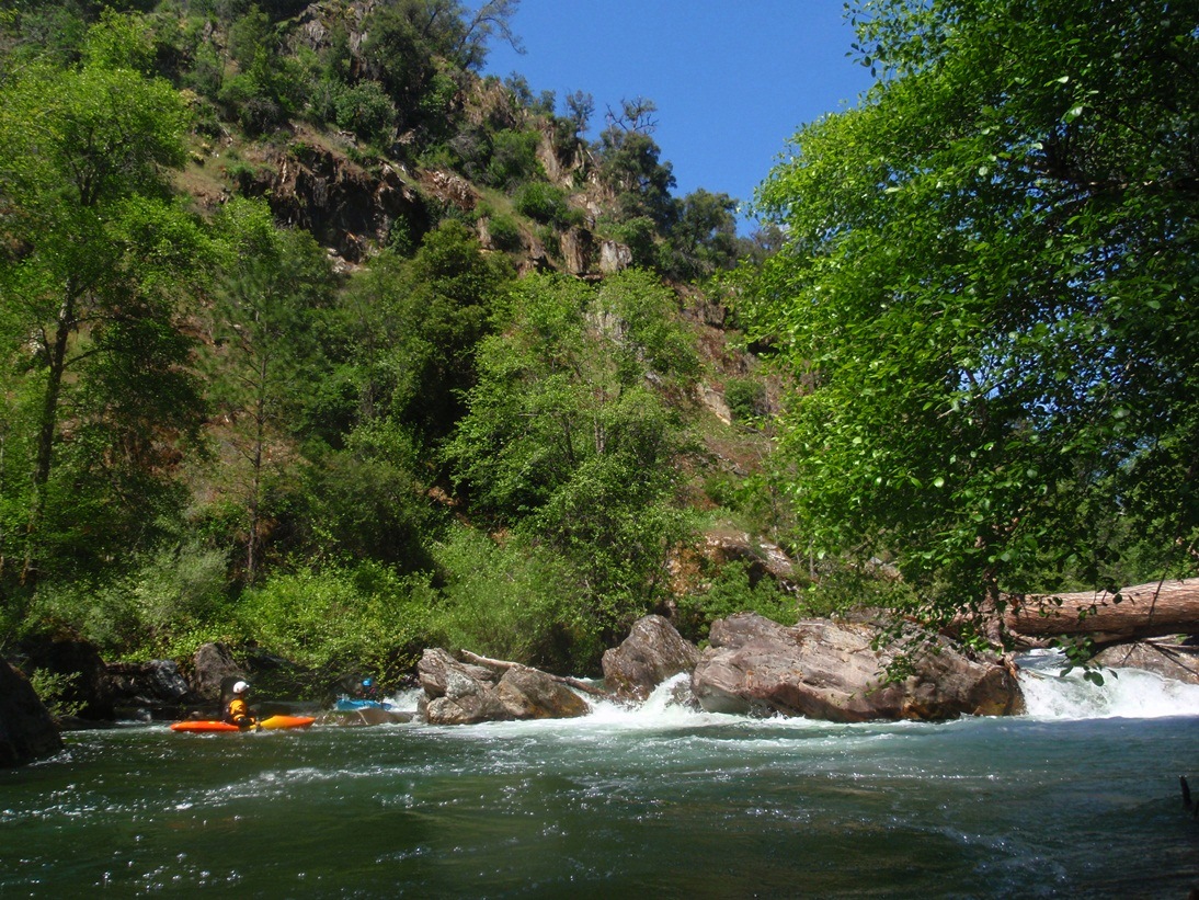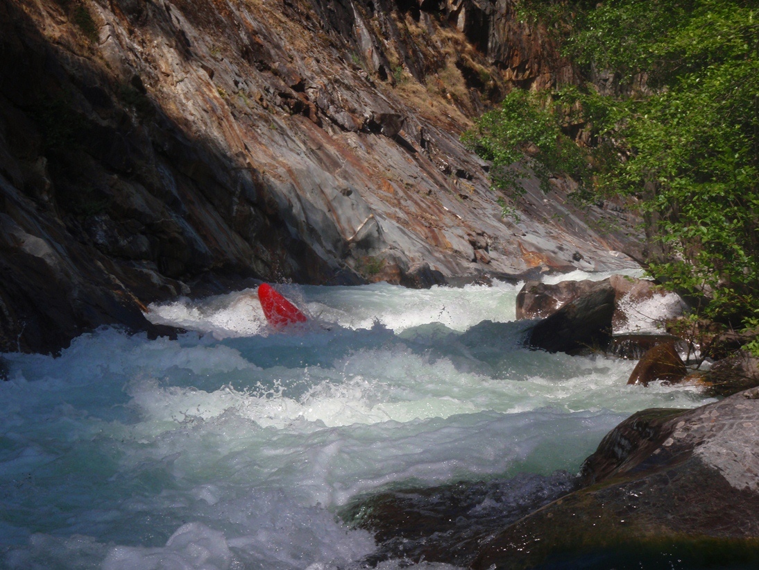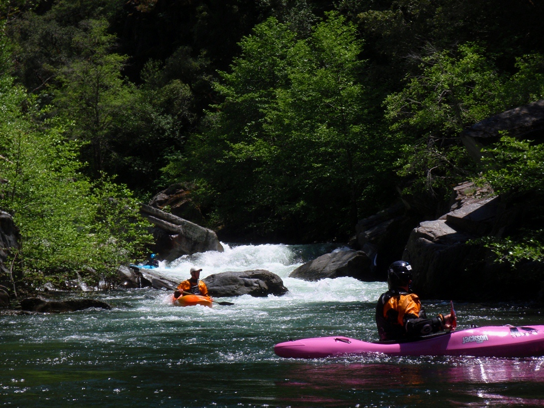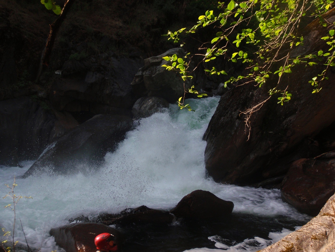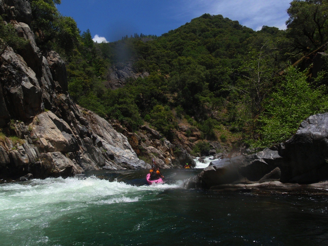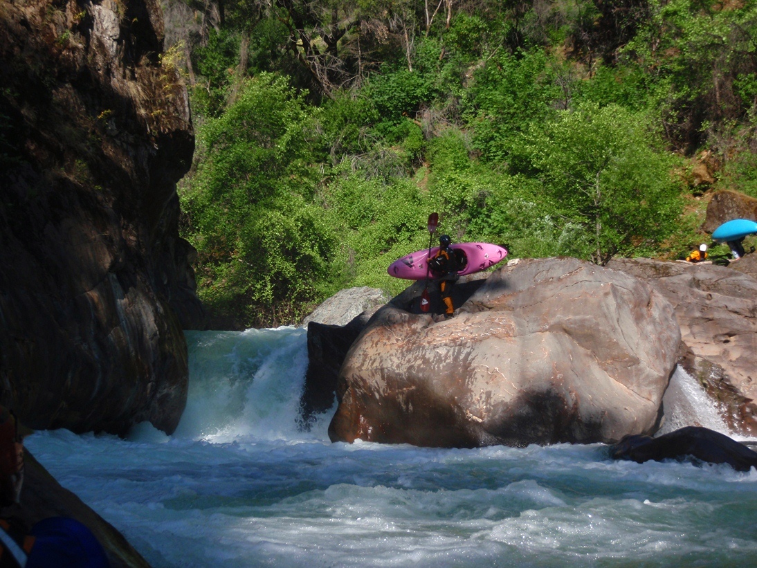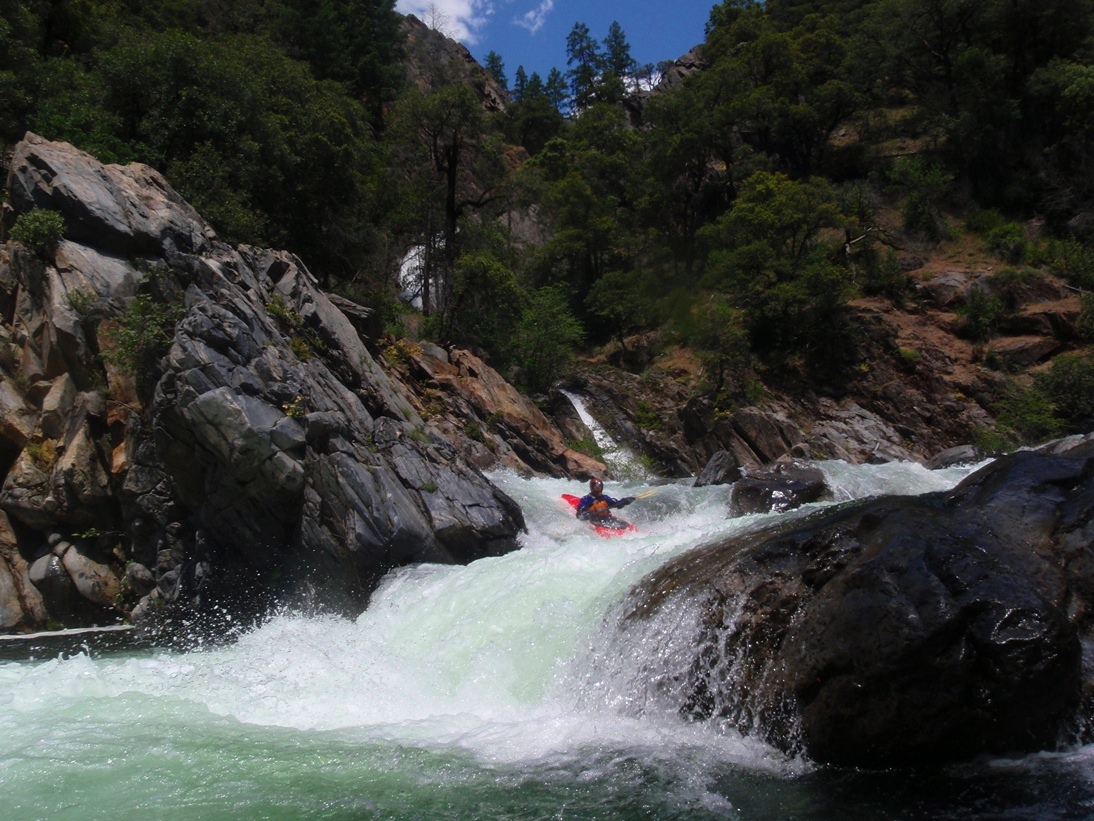 So, let's start with the positive. The scenery is superb. The tall forest canyon rises around you with scenic creeks splashing down the cliff faces. The water is crystal clear with a sparkle of turquoise that please your senses as it falls down the rapids. The rapids for the most park of unique character though the routine of rocks placed in bad places does get old. Though several of the rapids are as good as it gets, nice clear lines with fluffy holes and fun boofs. The downside of the run is the last quarter-mile of the rapids. After some fun class IV+ to V- you get to a sizeable class V that we all ran, this leads immediately into a scout with dangerous sieve/undercut in play. This immediately leads to a cascade which I am not sure has ever been run. A tall drop with a large undercut/sieve and hole I think this drop goes but needs a probe unit to prove so, and several capable probe units have walked it. This then leaves to a ledge that is not always run, which then leads to a class IV+/V- lead in to a normally walked drop that packs a powerful hole, very large uncut, and a cave behind the falls. The problem with the lead in is that you have to catch a very large eddy with a very small entrance at the lip of the falls. Although the eddy is 20 feet wide, the entrance is only 5 feet wide. It is wise to station someone at the entrance to catch people. I know of a few people who have made the eddy only because someone was there to pull them in. So, although there are no portages up to the final gorge, there are at least two, possibly 4 in the last quarter mile. To boot, the portages are in vine and poison oak infested areas that make for a major pain both real-time and down the line (itching as I type this).