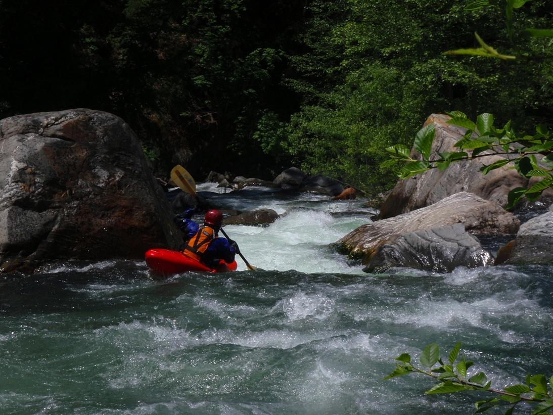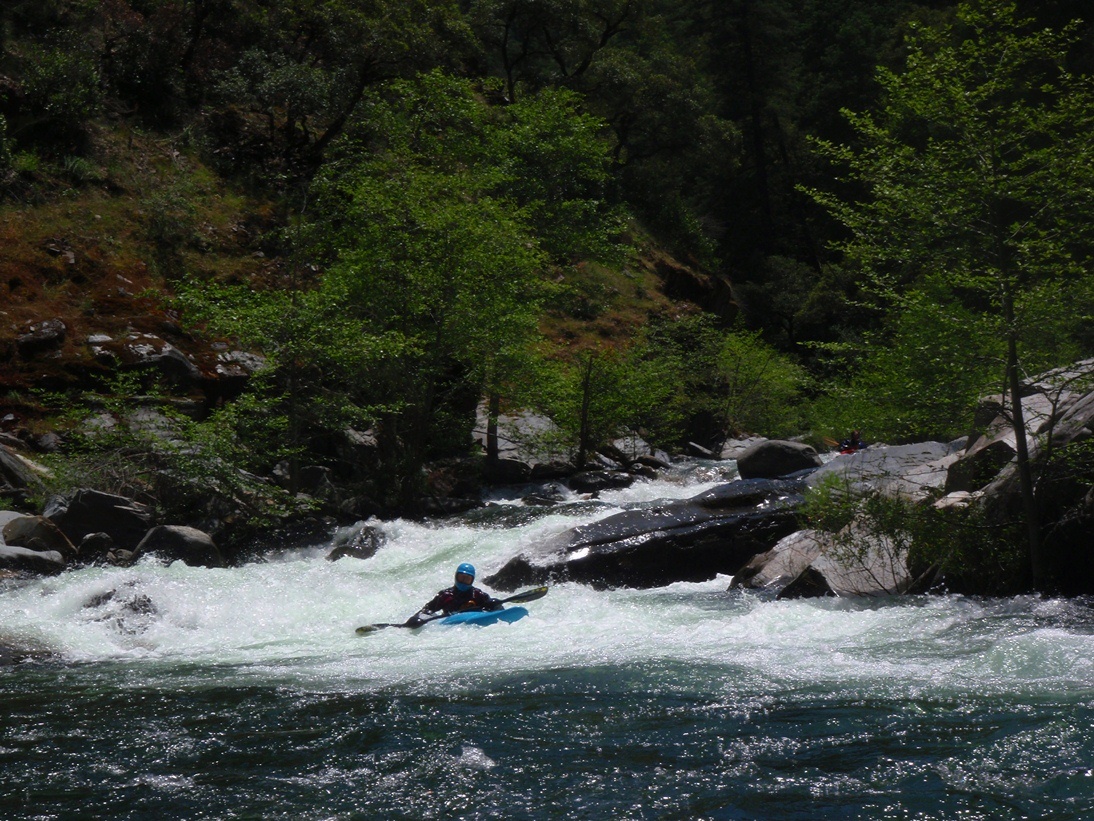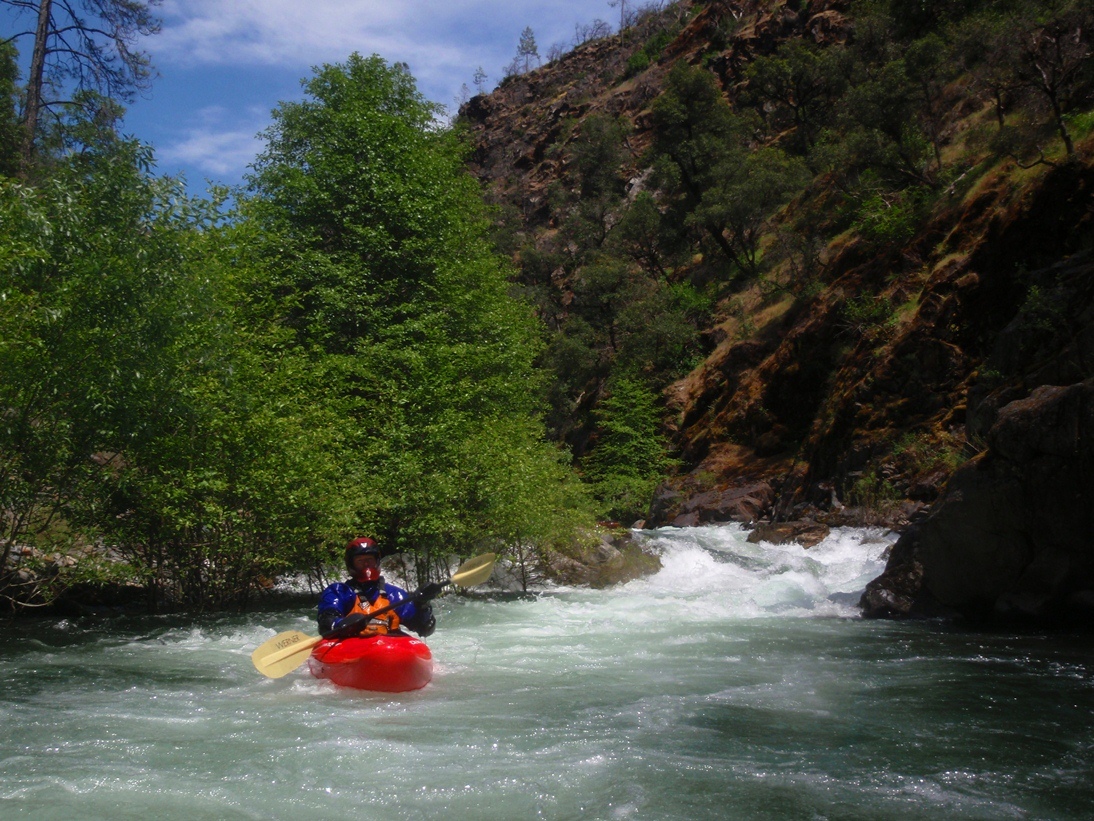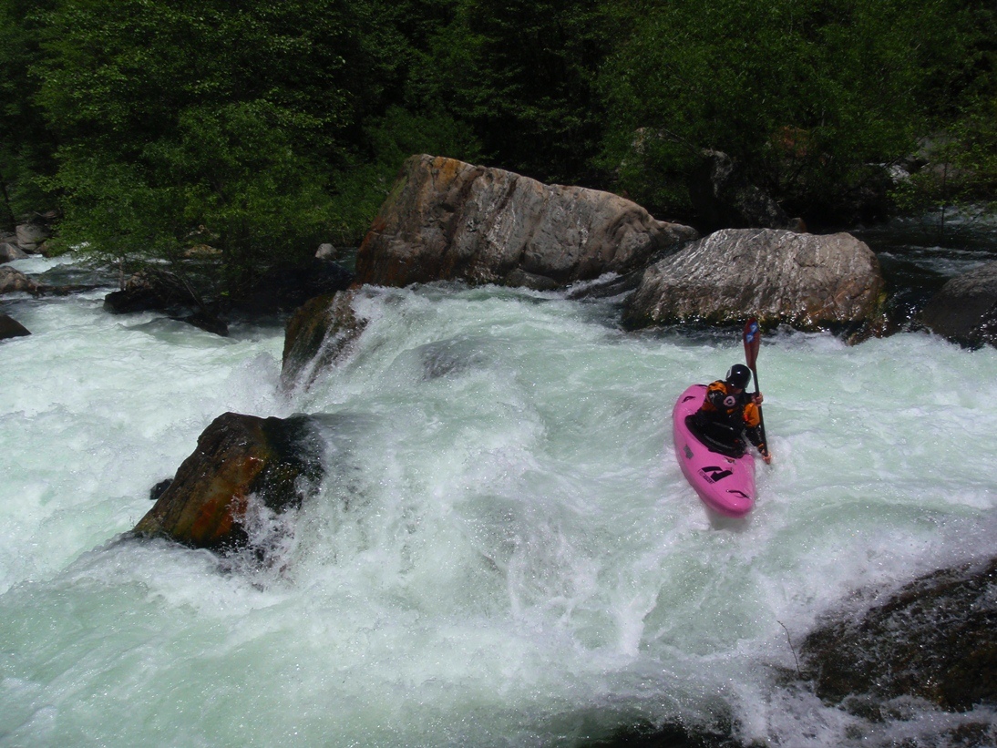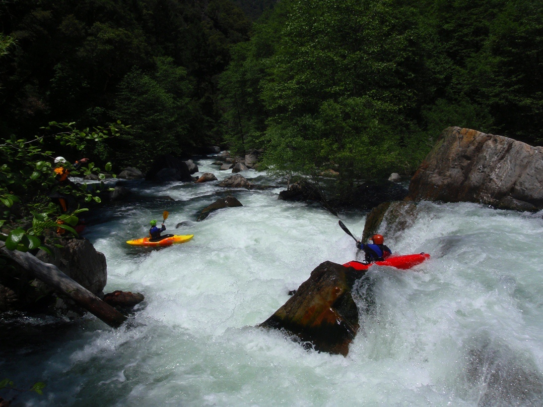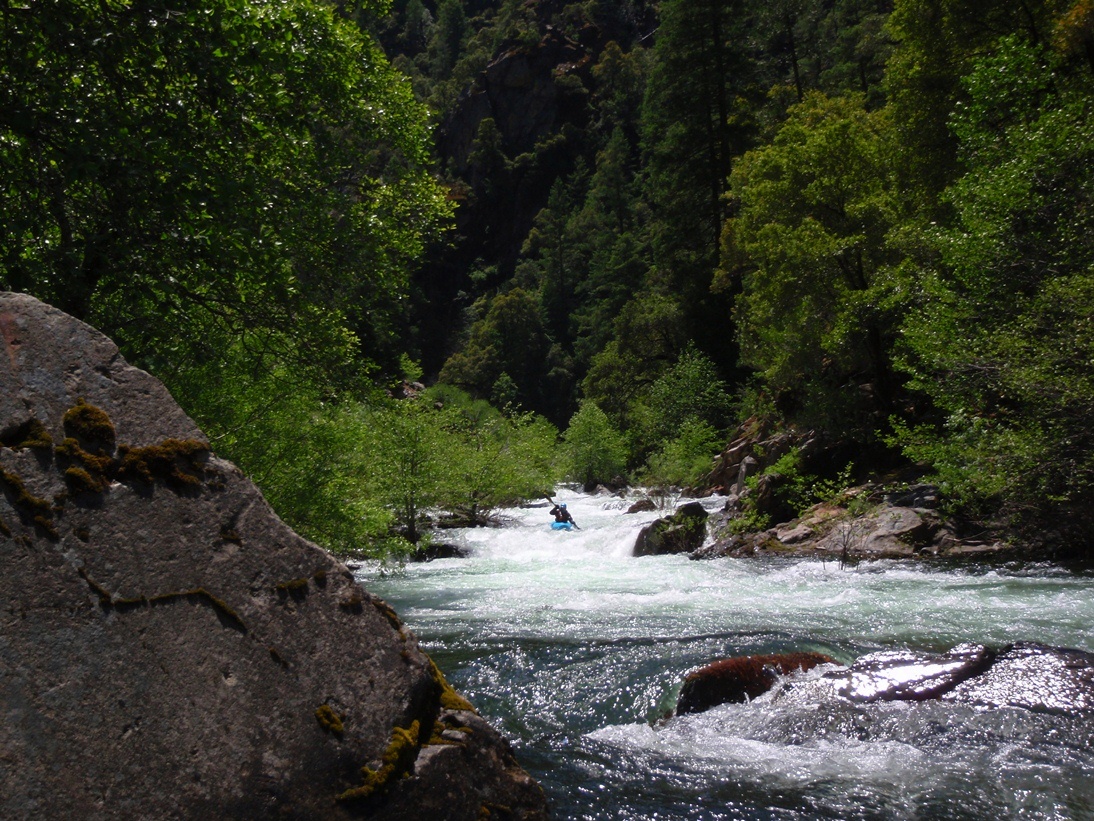 So, let's start with the positive. The scenery is superb. The tall forest canyon rises around you with scenic creeks splashing down the cliff faces. The water is crystal clear with a sparkle of turquoise that please your senses as it falls down the rapids. The rapids for the most park of unique character though the routine of rocks placed in bad places does get old. Though several of the rapids are as good as it gets, nice clear lines with fluffy holes and fun boofs. The downside of the run is the last quarter-mile of the rapids. After some fun class IV+ to V- you get to a sizeable class V that we all ran, this leads immediately into a scout with dangerous sieve/undercut in play. This immediately leads to a cascade which I am not sure has ever been run. A tall drop with a large undercut/sieve and hole I think this drop goes but needs a probe unit to prove so, and several capable probe units have walked it. This then leaves to a ledge that is not always run, which then leads to a class IV+/V- lead in to a normally walked drop that packs a powerful hole, very large uncut, and a cave behind the falls. The problem with the lead in is that you have to catch a very large eddy with a very small entrance at the lip of the falls. Although the eddy is 20 feet wide, the entrance is only 5 feet wide. It is wise to station someone at the entrance to catch people. I know of a few people who have made the eddy only because someone was there to pull them in. So, although there are no portages up to the final gorge, there are at least two, possibly 4 in the last quarter mile. To boot, the portages are in vine and poison oak infested areas that make for a major pain both real-time and down the line (itching as I type this).