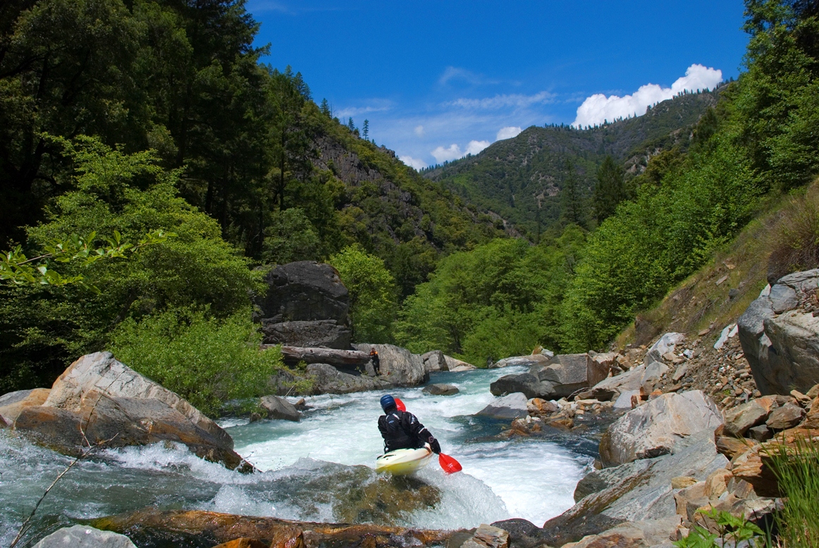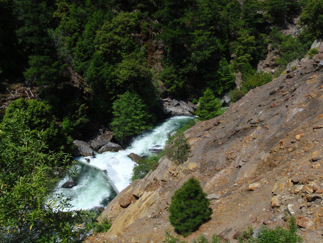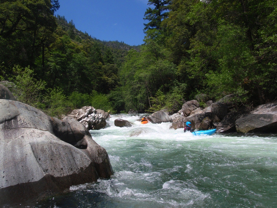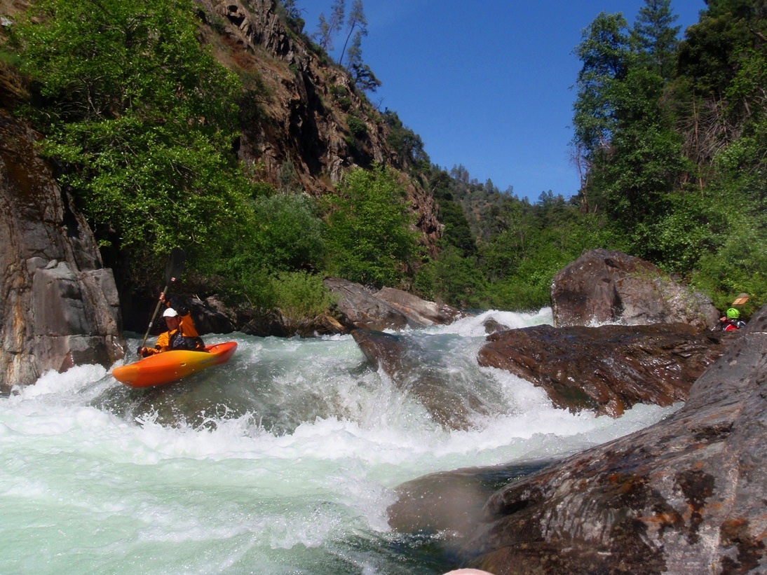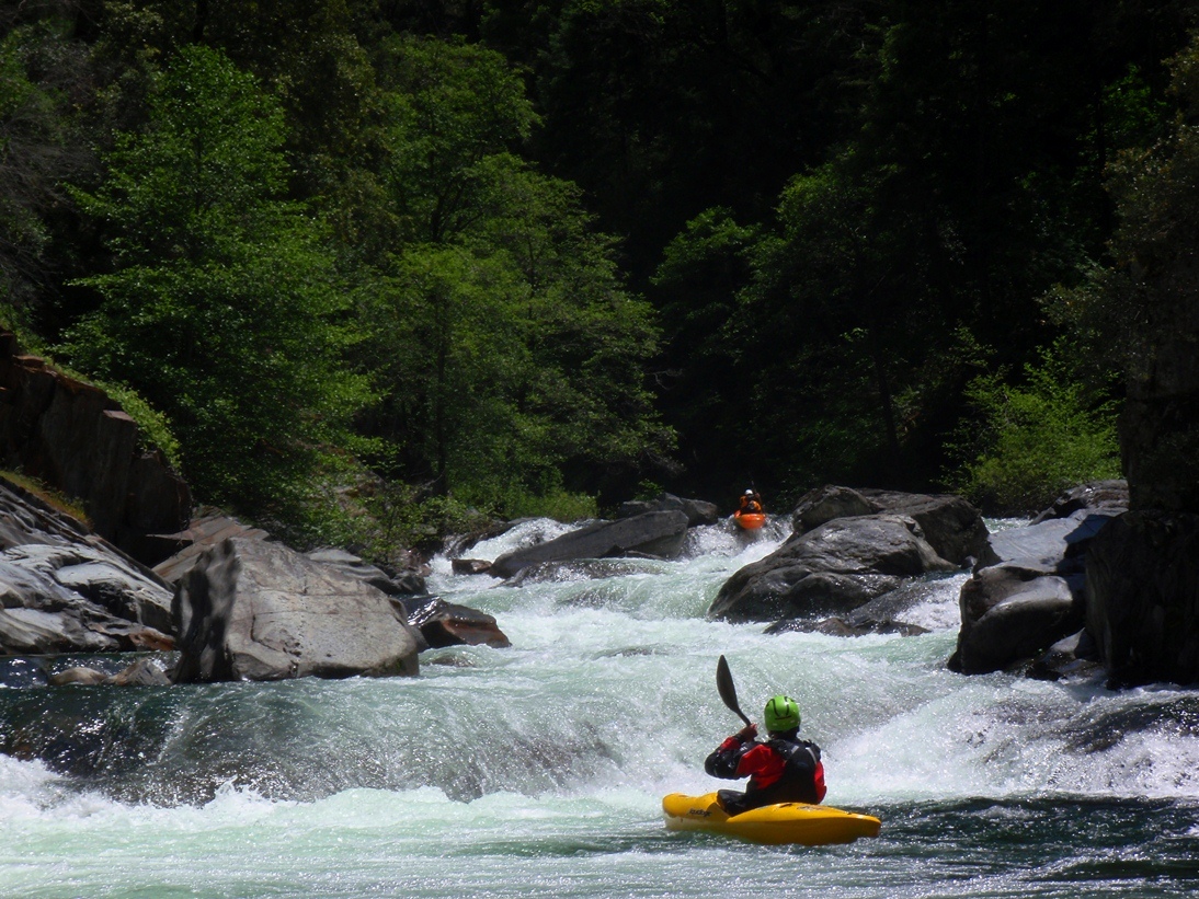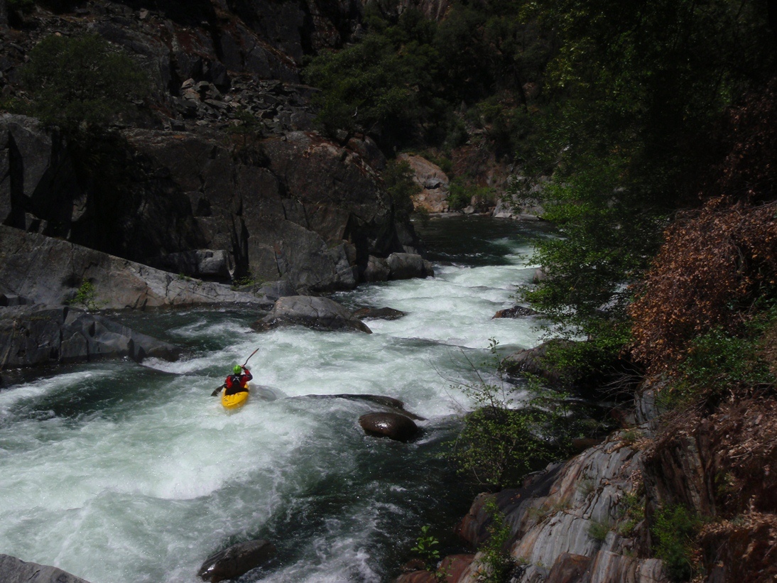 So, let's start with the positive. The scenery is superb. The tall forest canyon rises around you with scenic creeks splashing down the cliff faces. The water is crystal clear with a sparkle of turquoise that please your senses as it falls down the rapids. The rapids for the most park of unique character though the routine of rocks placed in bad places does get old. Though several of the rapids are as good as it gets, nice clear lines with fluffy holes and fun boofs. The downside of the run is the last quarter-mile of the rapids. After some fun class IV+ to V- you get to a sizeable class V that we all ran, this leads immediately into a scout with dangerous sieve/undercut in play. This immediately leads to a cascade which I am not sure has ever been run. A tall drop with a large undercut/sieve and hole I think this drop goes but needs a probe unit to prove so, and several capable probe units have walked it. This then leaves to a ledge that is not always run, which then leads to a class IV+/V- lead in to a normally walked drop that packs a powerful hole, very large uncut, and a cave behind the falls. The problem with the lead in is that you have to catch a very large eddy with a very small entrance at the lip of the falls. Although the eddy is 20 feet wide, the entrance is only 5 feet wide. It is wise to station someone at the entrance to catch people. I know of a few people who have made the eddy only because someone was there to pull them in. So, although there are no portages up to the final gorge, there are at least two, possibly 4 in the last quarter mile. To boot, the portages are in vine and poison oak infested areas that make for a major pain both real-time and down the line (itching as I type this).