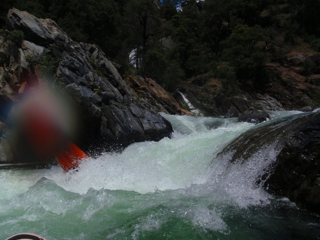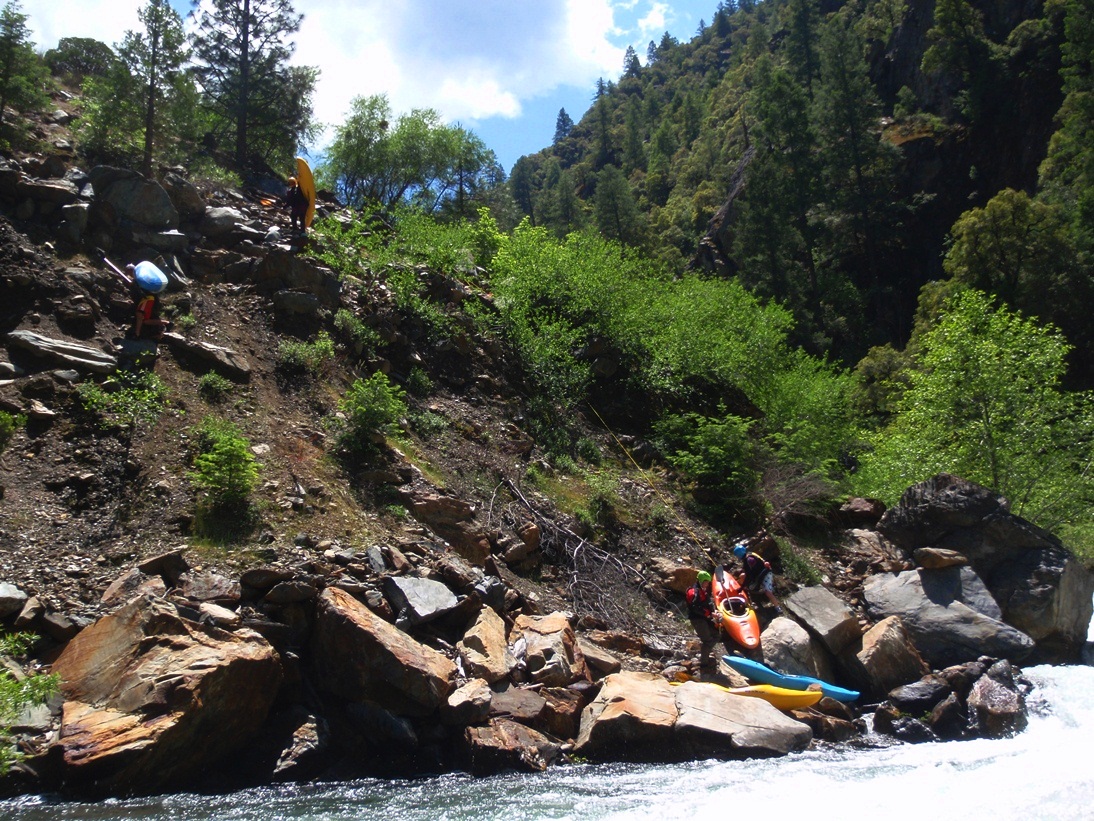 Portage Lead-in (IV+ to V-). If it weren't for the ledge downstream this rapid wouldn't be as bad. Scout for sure. Set safety in the eddy below. Some ran left and bashed rocks, nearly flipped and nearly missed the eddy on the left. One ran left and based rocks but caught the eddy easier. I think I would run right. But I would prefer to portage with some effort and some poison oak on the left.