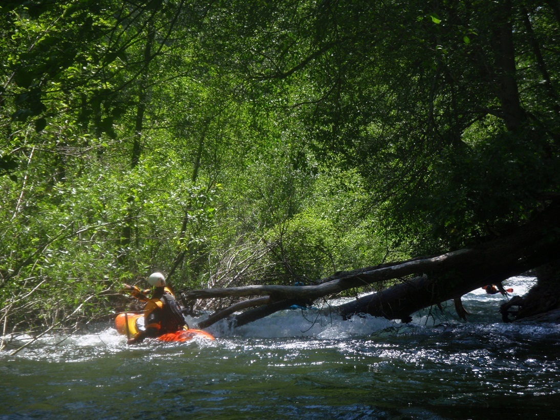 - Possible Portage (IV+ to V). On the very first left bend is a challenging rapid that is walked at low flows. At our medium flows there was just enough water to get through the pinch, though I pinned briefly. Just downstream is a fun boogie rapid leading to a good size drop easily boofed on the far right.