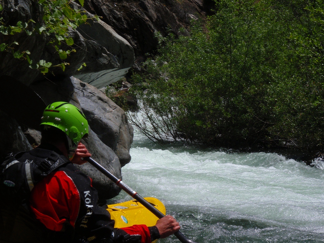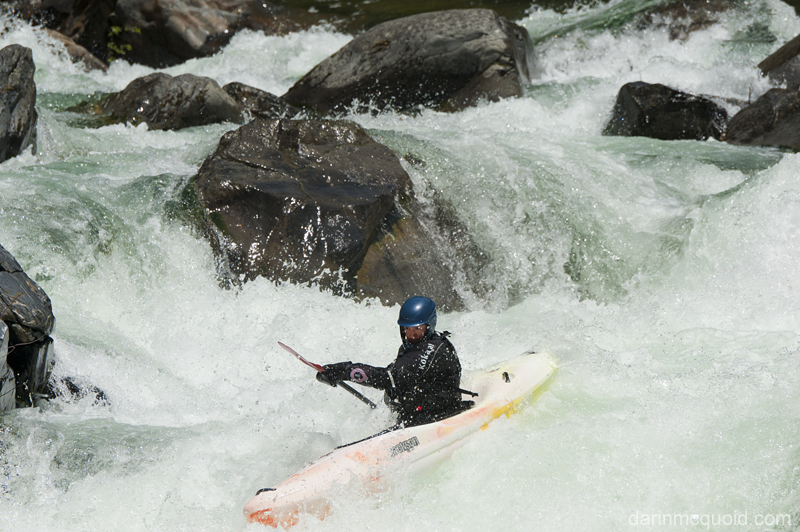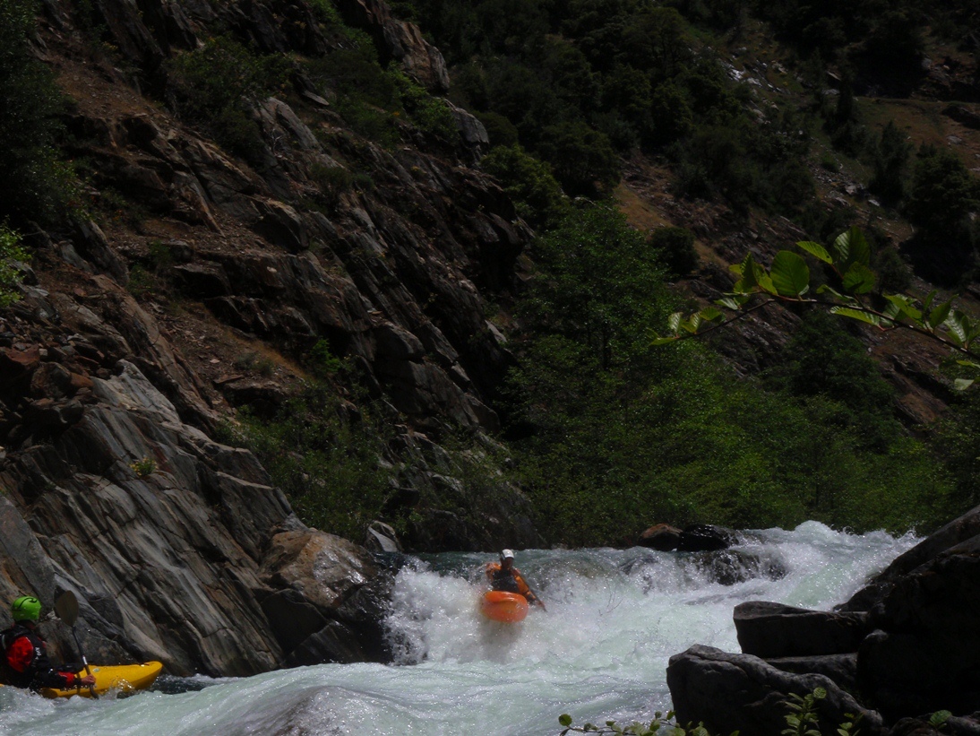 "Kinda" (V). Jonas and Darin entered far right in the pinch (boof the wall, or you totally pinch off as I found out) and then ran down a ramp dodging a few holes and eddied out. As I dropped in I saw them pointing left so I went further left and saw I was not going to have a chance in hell to catch their eddy. I call out, "does the rest go?" To which Darin responded, "kinda." Downstream lay two large holes. Best run far left. Eddy out immediately and scout on the left.