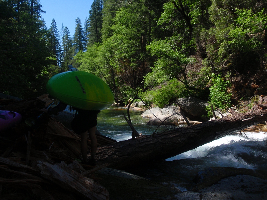 Wood (IV). A small rapid with wood very in play drove us for a very quick portage. Put in, ferry across the river and scout the next drop on the right.
