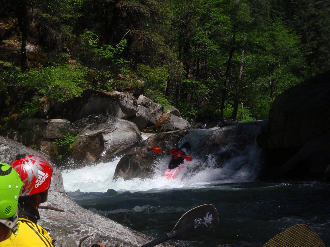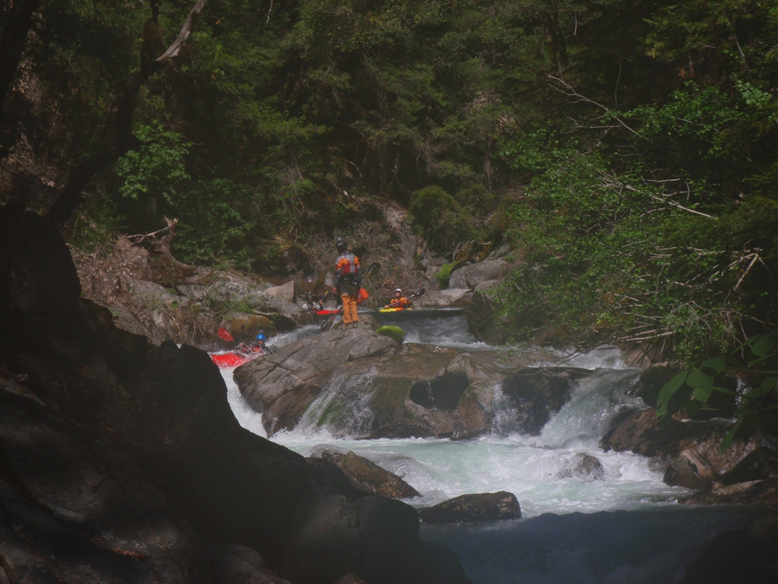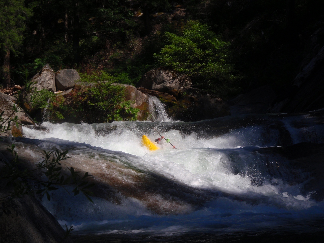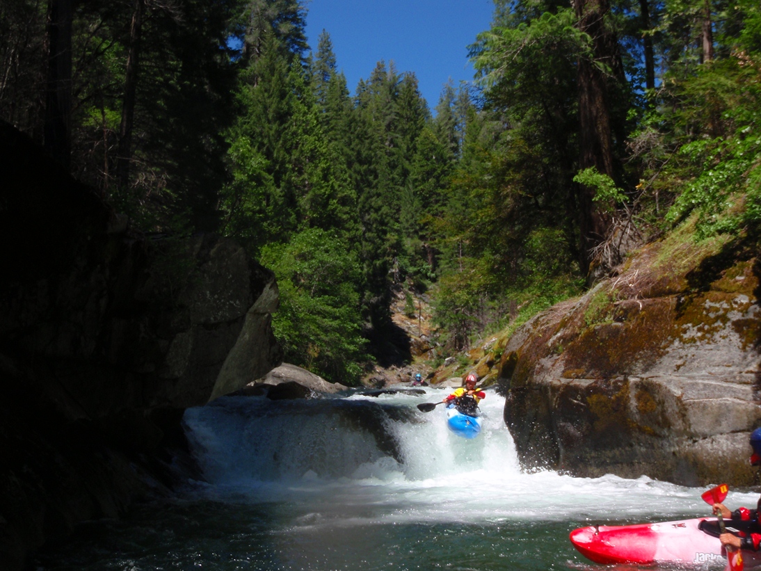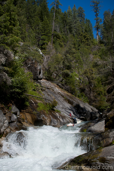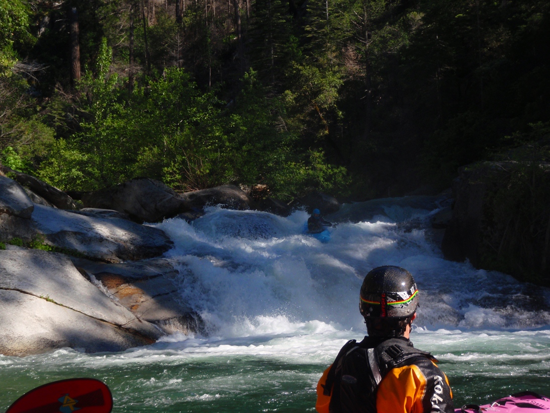 The first bit of the run is mostly class II-III with a few IV thrown in. Things then step up a notch and become more class IV-V but generally rapids in nature, some of which aren't the cleanest things around. These first sections will likely take you 1/2 of the time you spend on the river though it is well over ¾ of the length of the river. Below, the river begins to fall off the face of the earth. Although everyone is familiar with the most commonly video'd and photographed rapids on the run, what you don't see is the plethora of other slides and falls that would require scouts if no one is present who knows the lines. With experienced groups, the entire run can take less than 2 hours. With scouts, the run can easily push 4 or 5 hours. We put on at 2 pm in June (2011), took lots of photos and video, scouted only the big drops, and still took 5 hours followed by hiking out, loading up, we arrived back at put-in at 9 pm (and getting back to Sac at 1:30 am... work the next day was not optimally productive... unless you count this write-up).