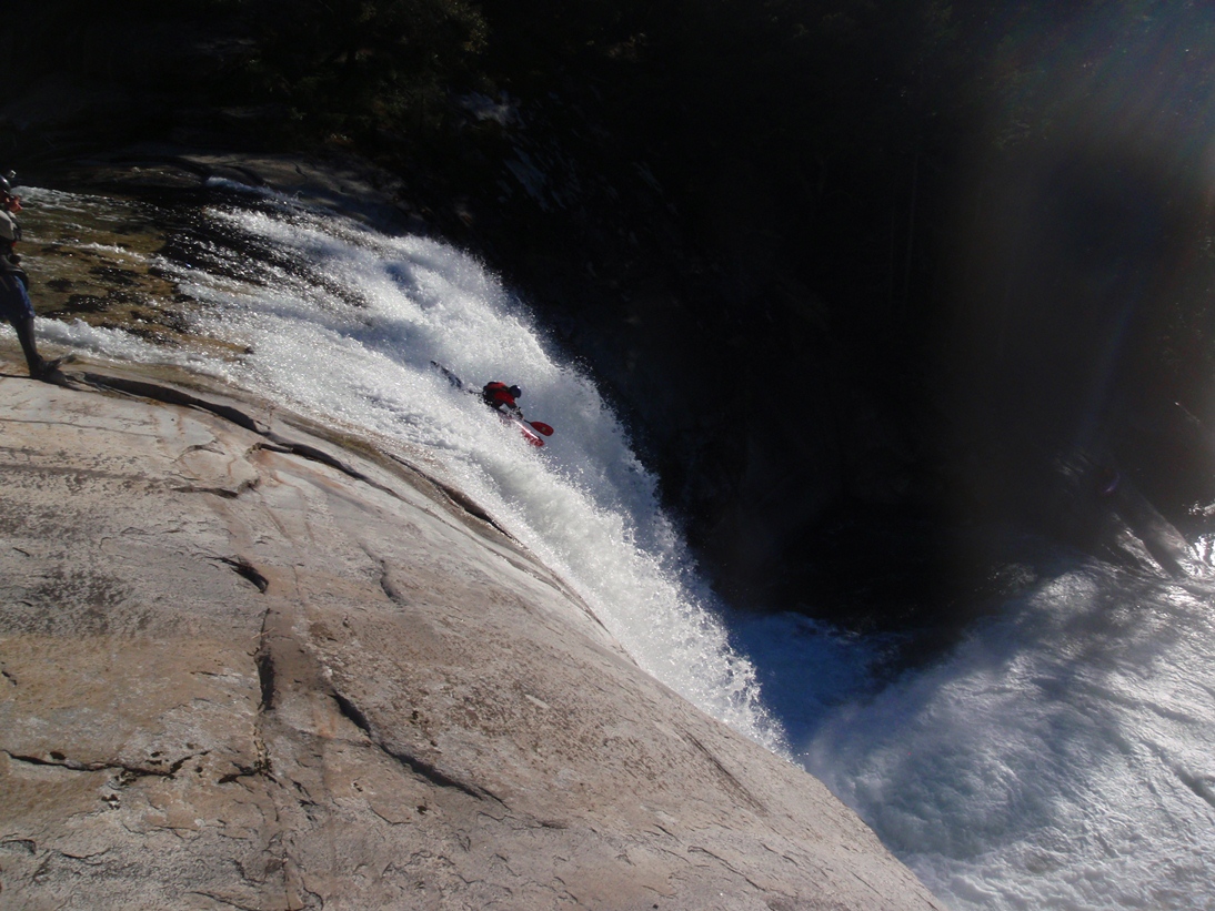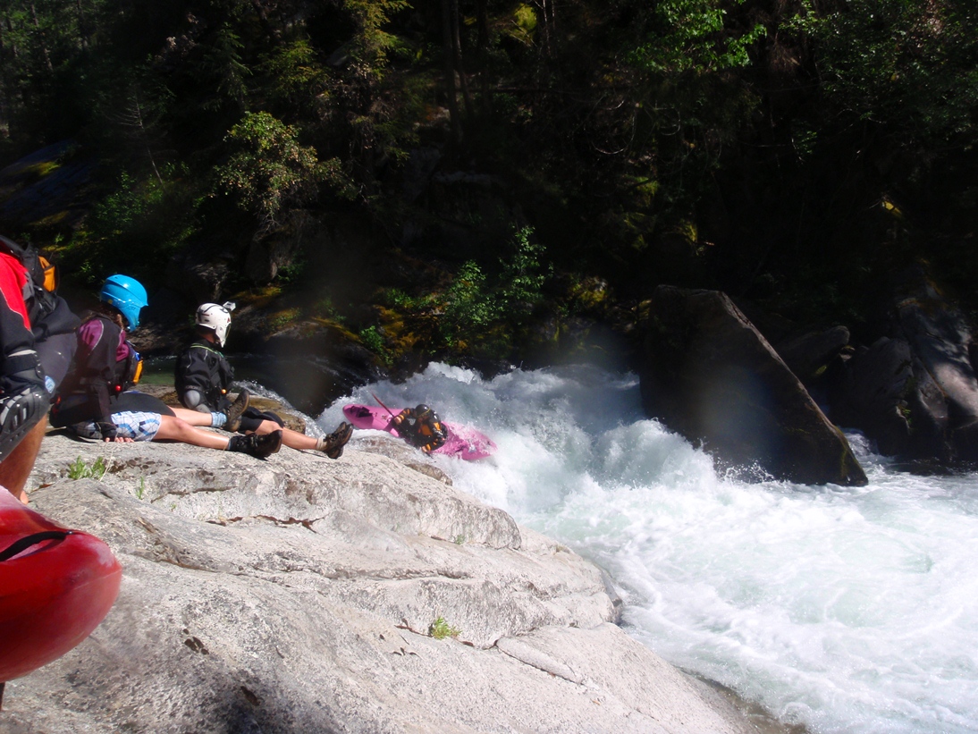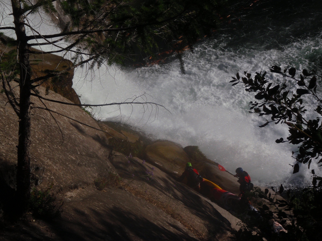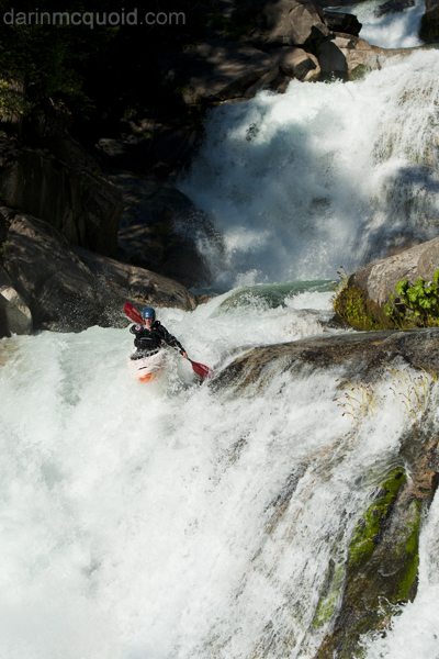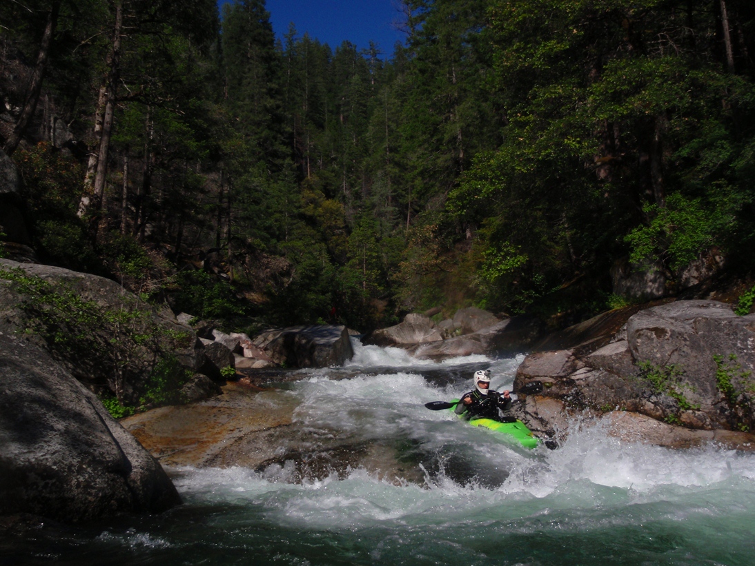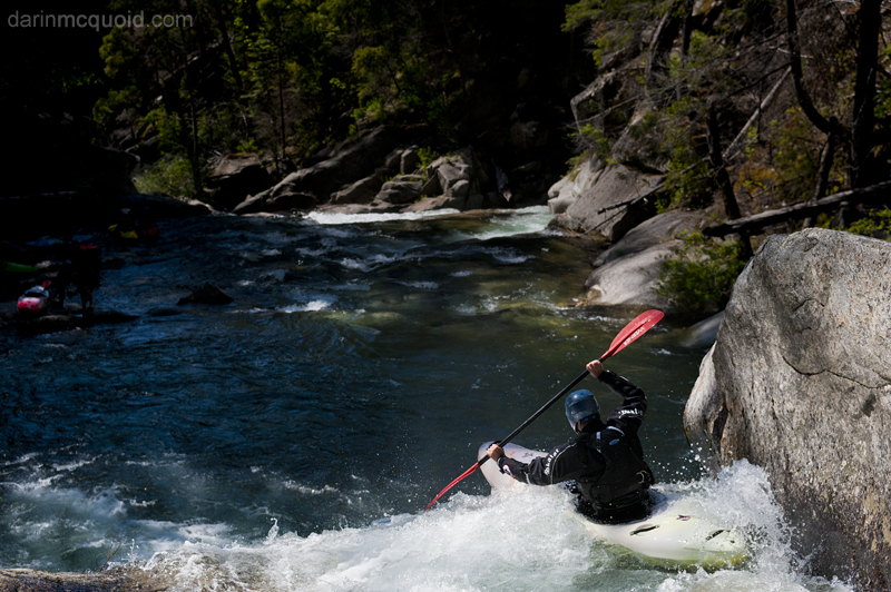 The first bit of the run is mostly class II-III with a few IV thrown in. Things then step up a notch and become more class IV-V but generally rapids in nature, some of which aren't the cleanest things around. These first sections will likely take you 1/2 of the time you spend on the river though it is well over ¾ of the length of the river. Below, the river begins to fall off the face of the earth. Although everyone is familiar with the most commonly video'd and photographed rapids on the run, what you don't see is the plethora of other slides and falls that would require scouts if no one is present who knows the lines. With experienced groups, the entire run can take less than 2 hours. With scouts, the run can easily push 4 or 5 hours. We put on at 2 pm in June (2011), took lots of photos and video, scouted only the big drops, and still took 5 hours followed by hiking out, loading up, we arrived back at put-in at 9 pm (and getting back to Sac at 1:30 am... work the next day was not optimally productive... unless you count this write-up).