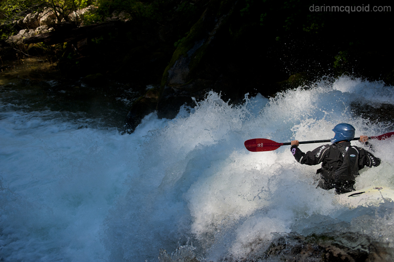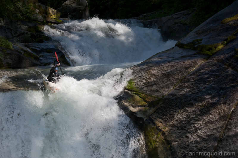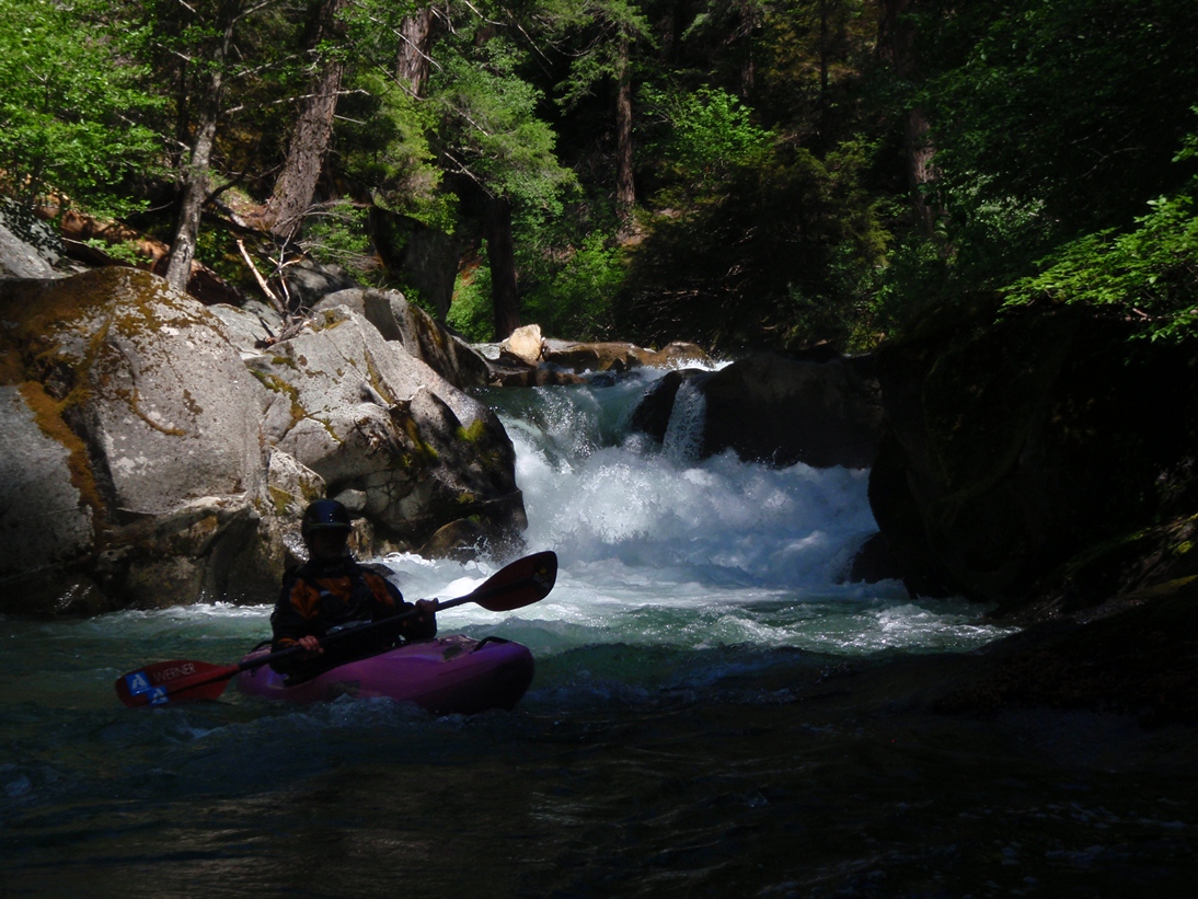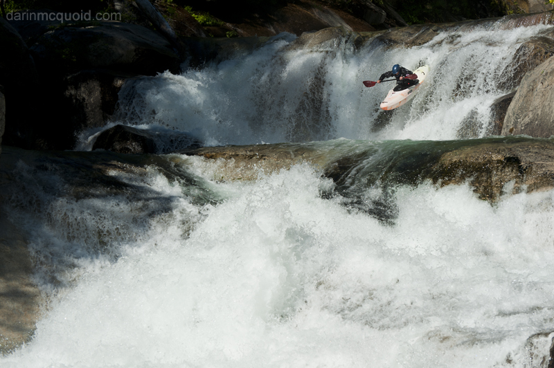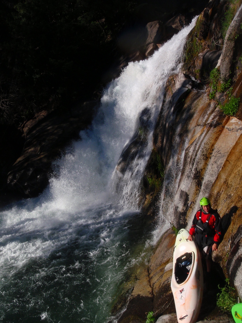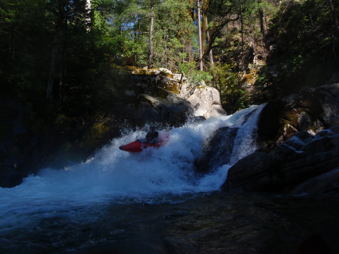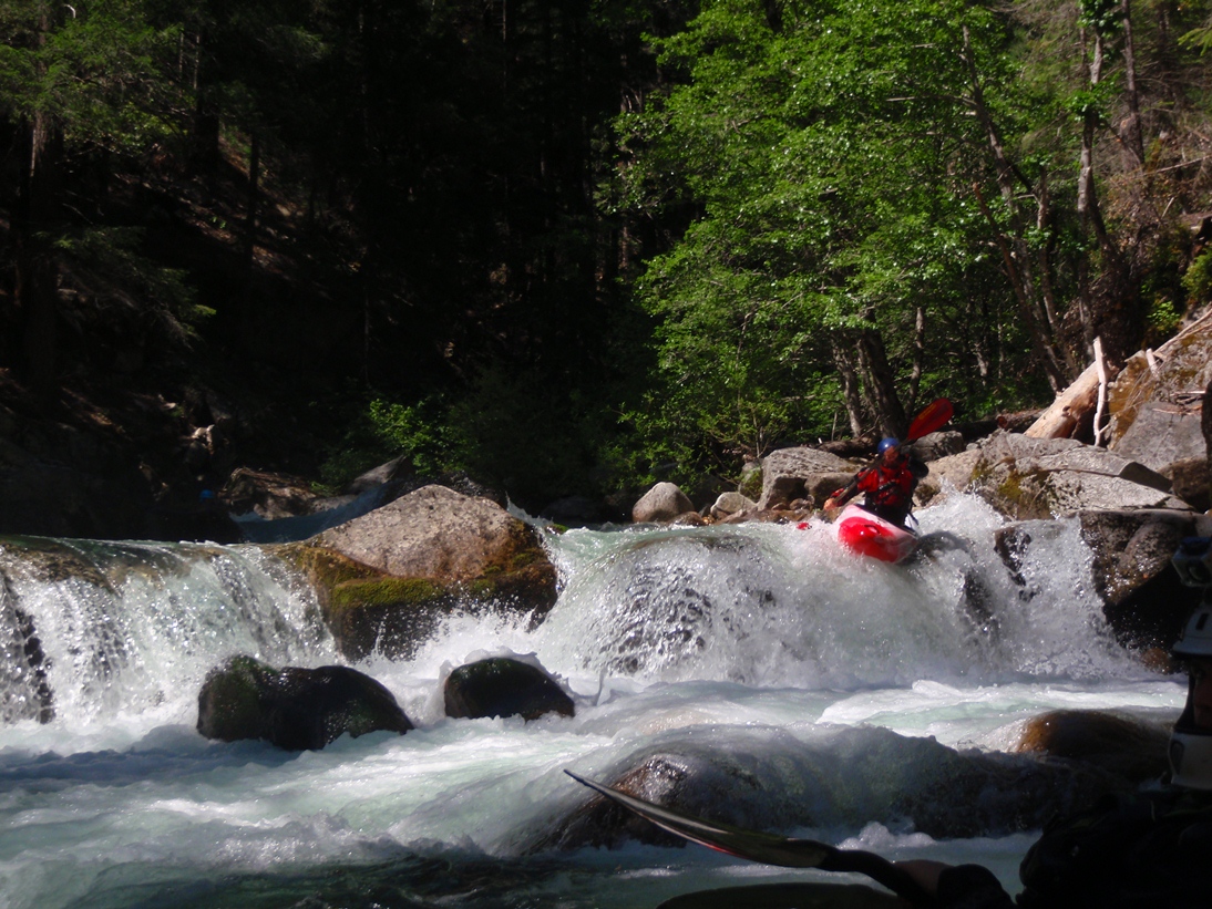 The first bit of the run is mostly class II-III with a few IV thrown in. Things then step up a notch and become more class IV-V but generally rapids in nature, some of which aren't the cleanest things around. These first sections will likely take you 1/2 of the time you spend on the river though it is well over ¾ of the length of the river. Below, the river begins to fall off the face of the earth. Although everyone is familiar with the most commonly video'd and photographed rapids on the run, what you don't see is the plethora of other slides and falls that would require scouts if no one is present who knows the lines. With experienced groups, the entire run can take less than 2 hours. With scouts, the run can easily push 4 or 5 hours. We put on at 2 pm in June (2011), took lots of photos and video, scouted only the big drops, and still took 5 hours followed by hiking out, loading up, we arrived back at put-in at 9 pm (and getting back to Sac at 1:30 am... work the next day was not optimally productive... unless you count this write-up).