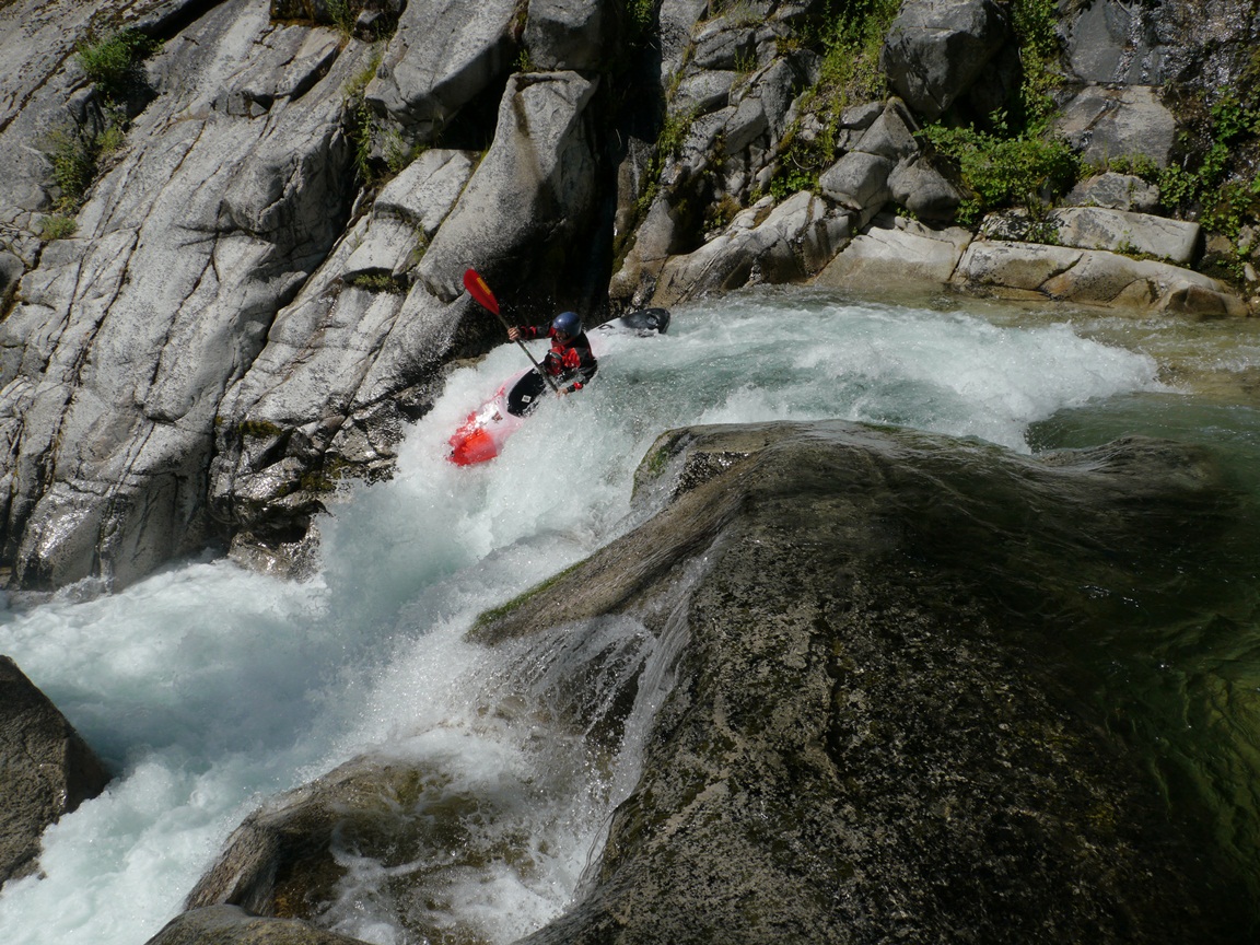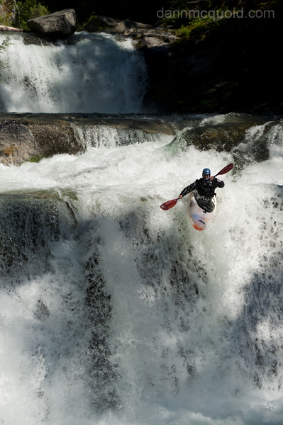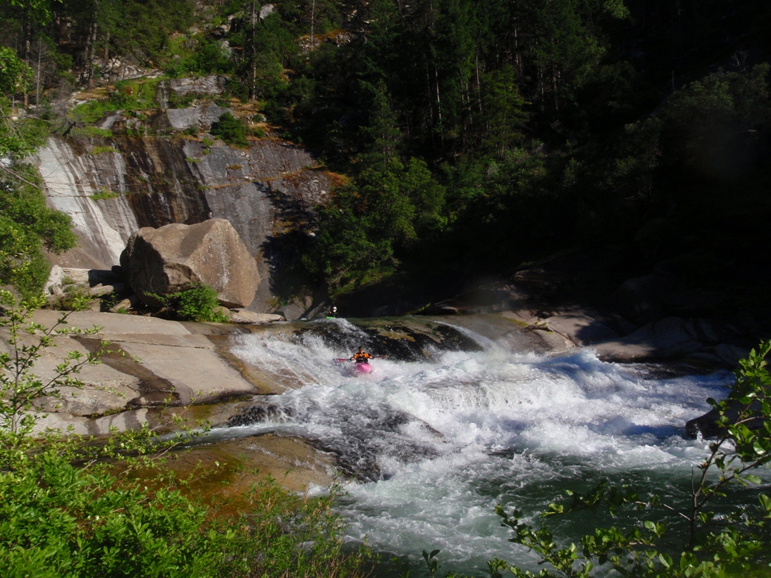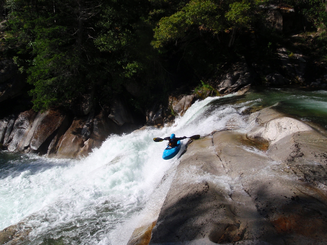 Balcony Drop (IV+). A ledge best run far left to drop onto the small balcony below. Don't go with all the water as it will slam you into the step of rock below.