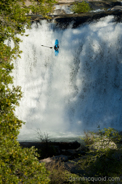 Perfect 20 (IV+). At low flows we were able to log duck on the left, but at normal flows you have to scrap down the center. Hug the center rock and drop 20 feet to the pool below.