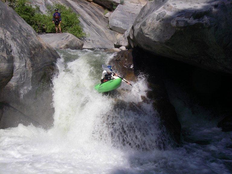 - Chuck Kern's Slide (V to V+). So cool. Scout from the short trail out of the campground or from river side. Enter left, drop down the slide, try not to get pushed back too far right, hit the kicker, stay off the right wall, punch a few holes... and you are home free. Except one more big hole in the next rapid that you have to run before breathing a sigh of relief. On that one, try to end right.