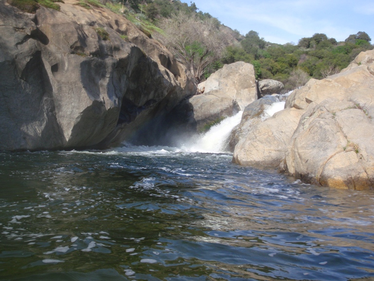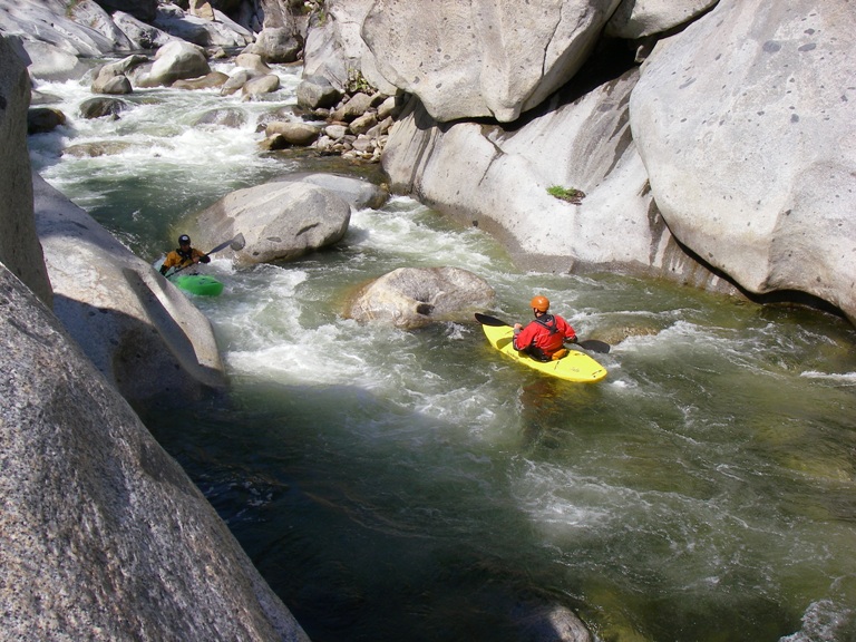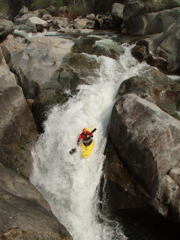 So I will begin by saying that I did not get the chance to put it at Bucks Flat and run the entire Hospital Rock run. Darin and I got into town for a one week Kaweah vacation, arriving at 3 pm. Due to the time of the day and the fact that it was my first trip down the river (read "am chicken and want so scout everything and reserve the right to portage everything) we opted to put-in at the turn-out just a mile or so above the 420 gorge. This means that I did not get to run (walk) Chuck's, V-slide, Little Niagra, nor the double drop just above our put-in. Our plan was to get back on the stretch later in the week and at that point put-in higher up and complete my personal first decent of Hospital Rock. However, fate had other plans. Near the end of the run I began taking on water, I suspect the rock at the base of the dam above Zero-60 caused my boat to give up the ghost. Three small cracks all going across the boat. Due to this damage and the fact that the following day on the Upper North Fork those three small cracks got together and formed one large three-inch hole in the bottom of my boat, our Kaweah trip was cut short and I was left with an incomplete decent of the run. Oh well, another time I will get back in there I am sure.