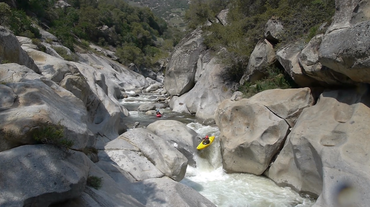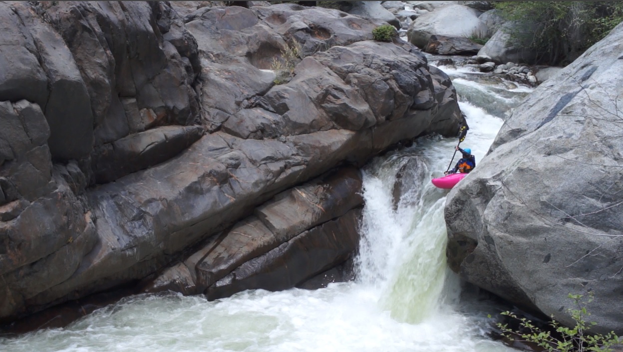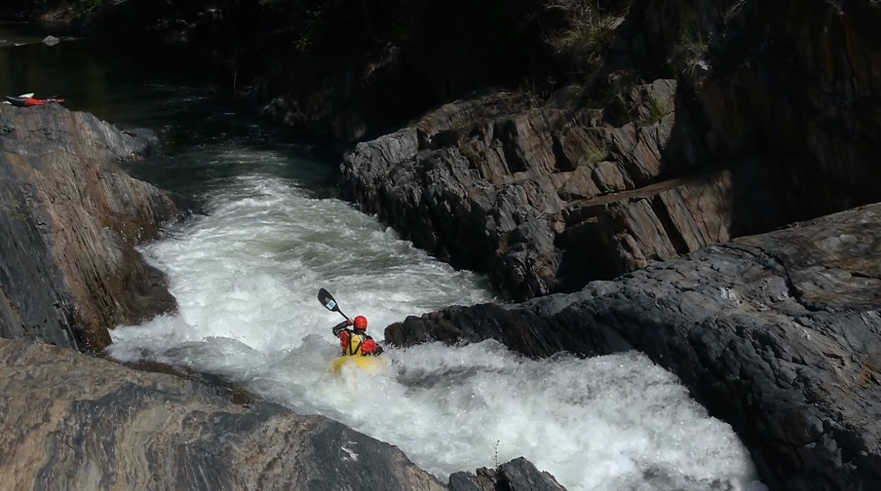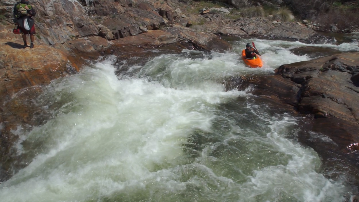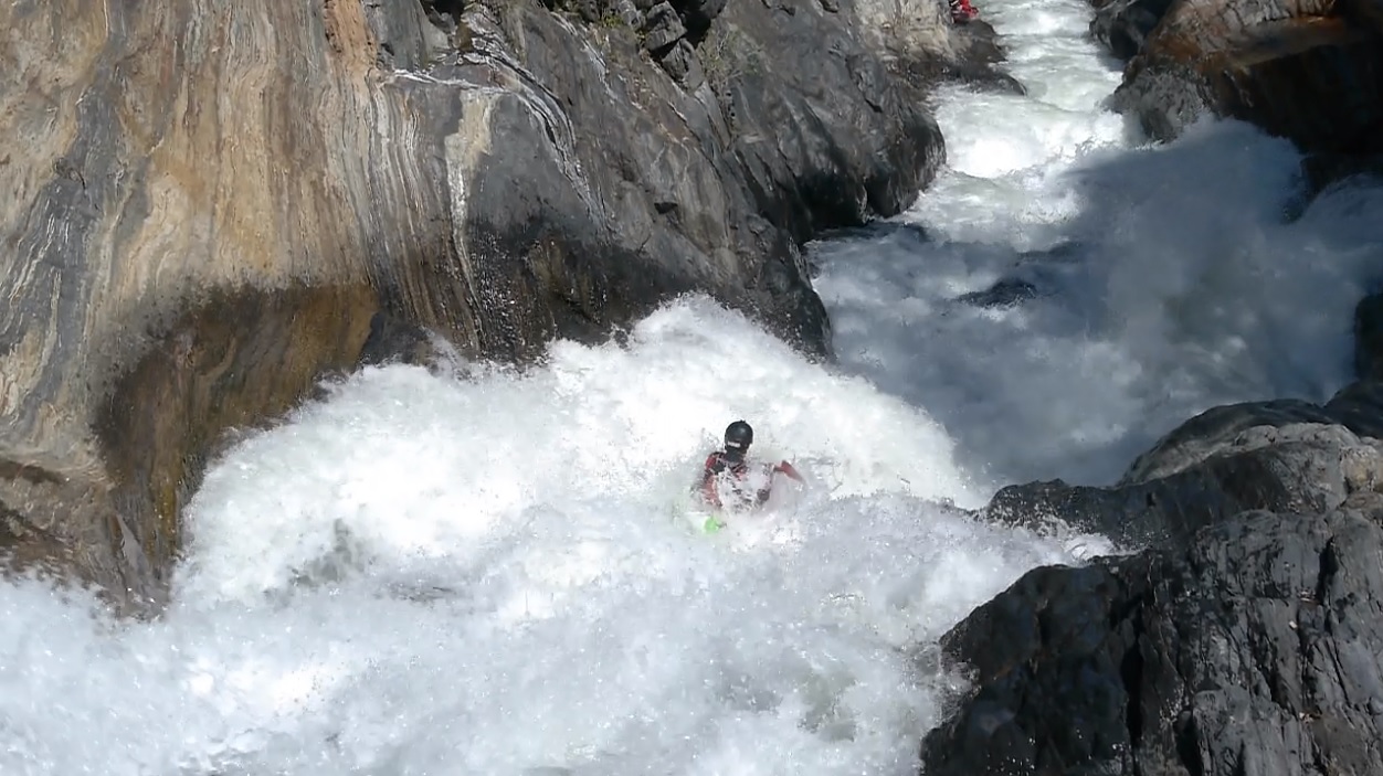 Chute AKA 60-0 (V- to P). A very large undercut on the left at the top and a sieve on the far right at the bottom. Enter moving right and then just ride the turbulence down to the 90 degree turn, hitting the curler off of the rock forming the sieve and try not to flip. I did flip in the exit curler and hit my head once or twice before rolling up. Still a great rapid, looks a heck of a lot worse than it is. Update 2023: A rock shifted and has closed this rapid out, sending the majority of the water to the right and into a sieve. Extraction looks difficult but doable if you are in the last minute make or die eddy on the right at the sieve. For now, mandatory portage on the left.