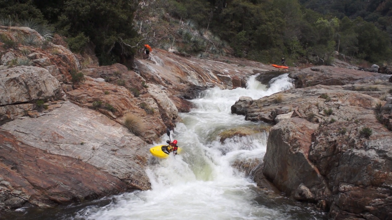 Double Drop (IV+ to V-). Looks bad, runs great. Run left down the top ramp and aim for the edge of the rock. It looks like you will piton, you won't. Stay off the left wall, then exit the bottom on the far right.