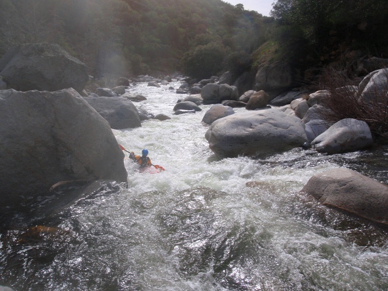 Seam to a Rock (IV+). A large horizon line with what looks to be a rock just downstream and a very chocked off exit turns out to be much mellower than first inspection. Plug away down the seam, avoid the rock (which is not hard) and all the channels amidst huge boulders empty to a pool.