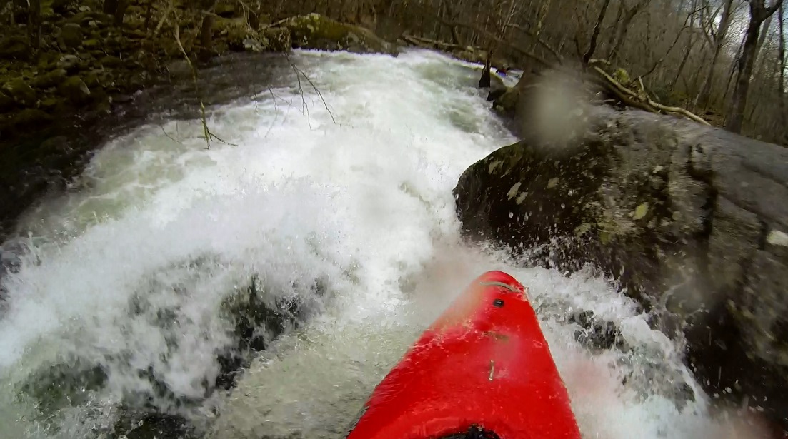 Staircase (IV). Staircase has a long boogie lead in around either side of an island, left carries more water. In March 2015 we had a wood portage in the class II part of the lead in. the river then constricts and then gets wide. Stay far left. Boof a nice shoulder boof on the left edge of the river and then work your way right to punch a few holes and catch an eddy on the right. A flip here would sorta suck due to the hole just downstream.